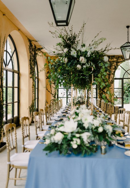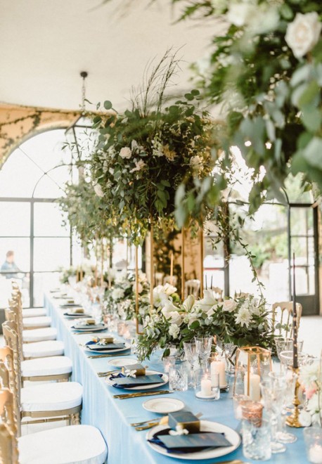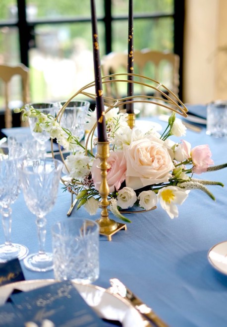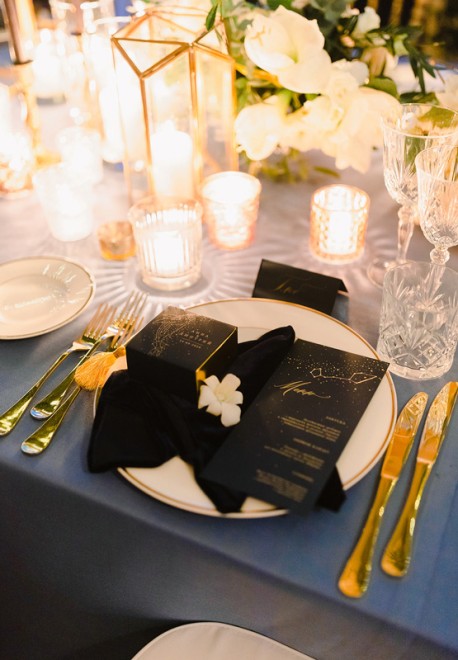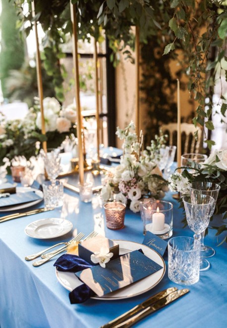 Gold-rimmed plates adorned with blue velvet napkins, a menu and a box of truffles, Parijin’s gold chairs, aged gold-colored cutlery, sky-colored tablecloth, crystal goblets.