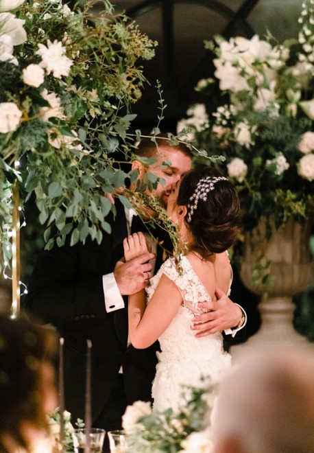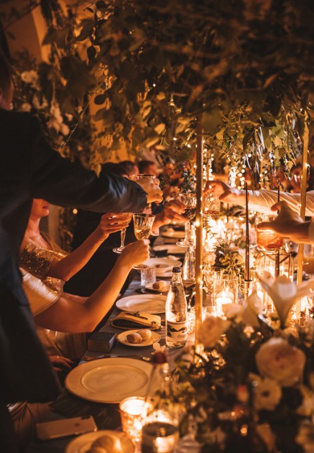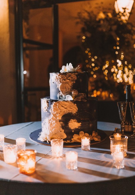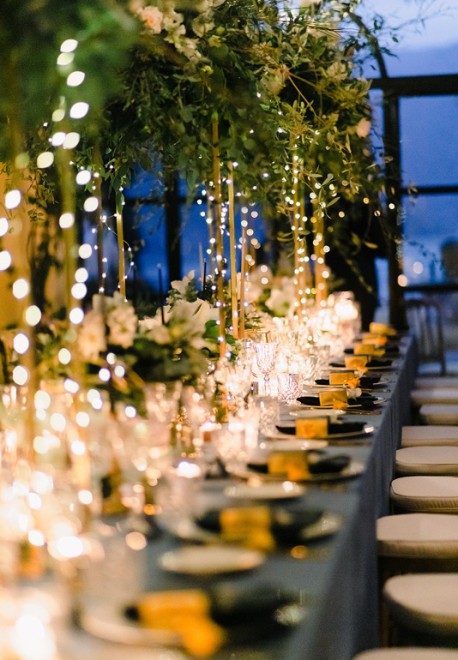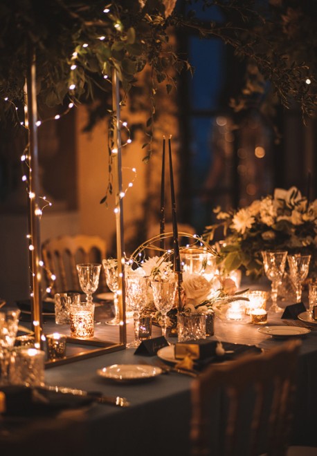 The combination of dark blue, antique gold and exclusively white flowers, which in the warm glow of candles and ice garlands created a spectacular contrast, similar to the night starry sky.