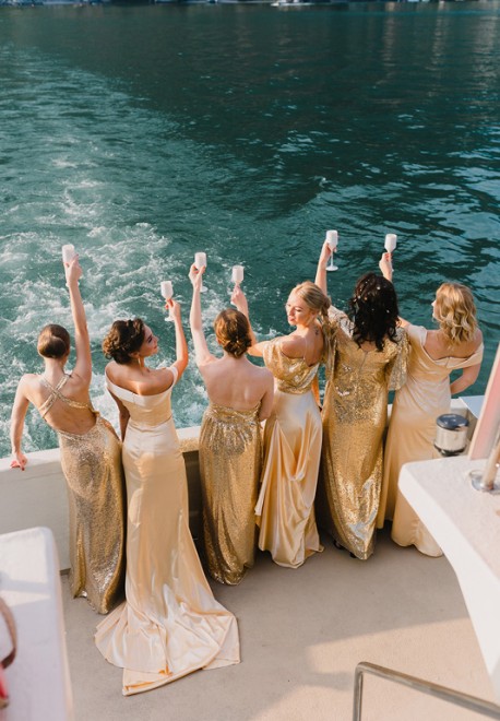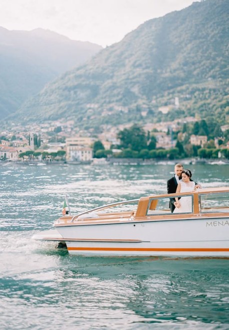 The guests arrived at the villa on a ship, which hosted a pre-wedding aperitif.