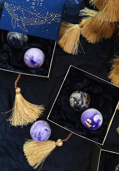 Gifts for each guest became part of the wedding table decor: chocolate truffles in the form of space planets in exquisite boxes with golden silk tassels.