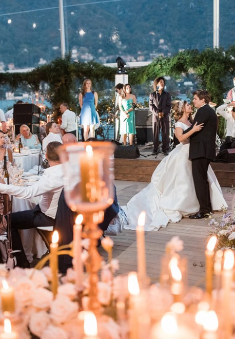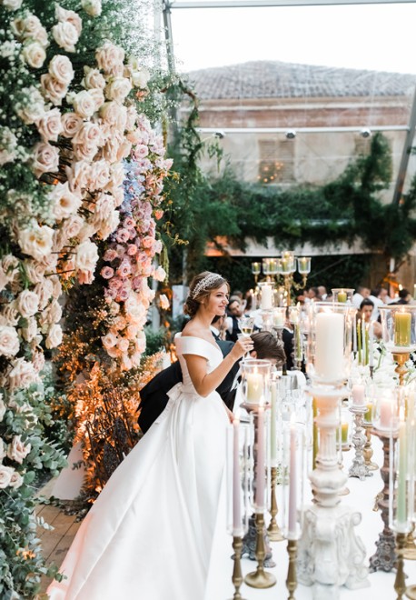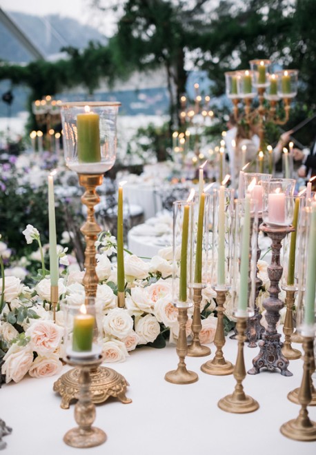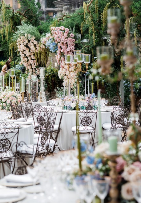 Round tables covered with velvet tablecloths of milk color, elegant white garden chairs, thousands of candlesticks coming in different shapes and sizes, flooring of natural oak, crystal dinnerware sets, English garden roses. These elements helped create cozy atmosphere of a blooming garden.