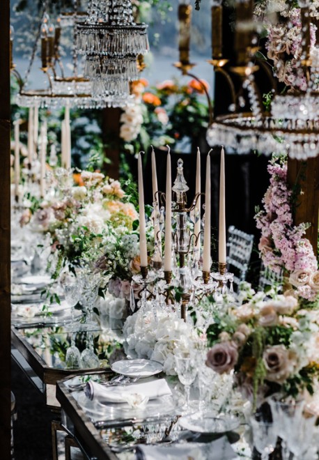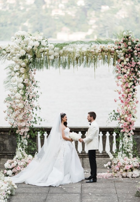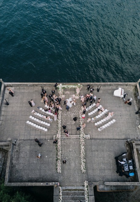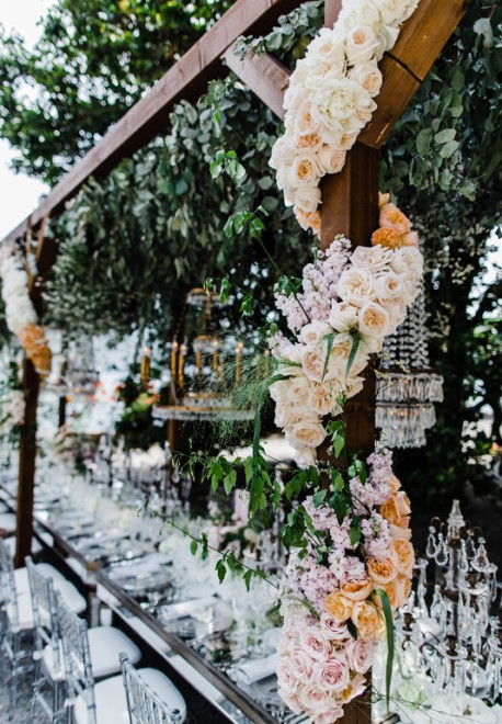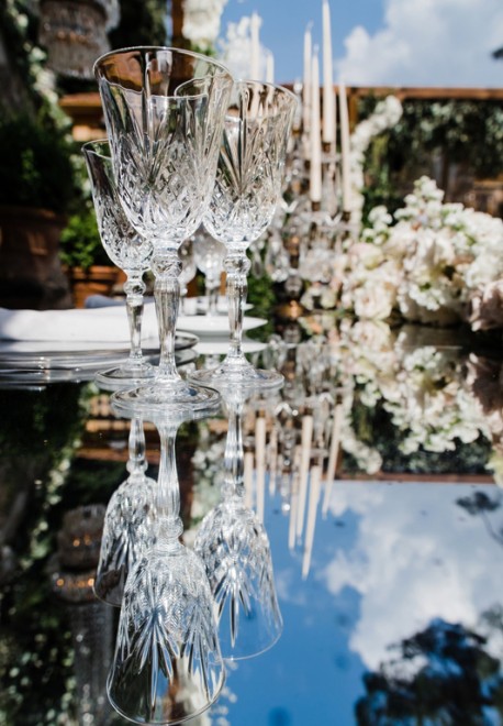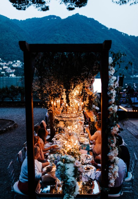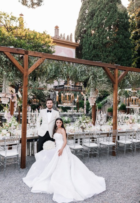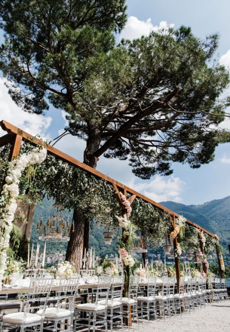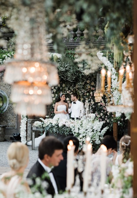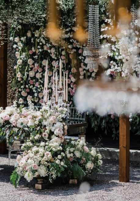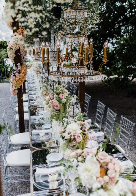 The decor was created by the great master Vincenzo Dascanio. Thousands of flowers and candles, beautiful wooden gazebos, open Venezian style tables, crystal chandeliers became an harmonic part of the amazing architecture and gardens of Villa Pizzo.