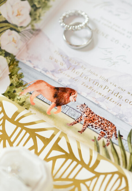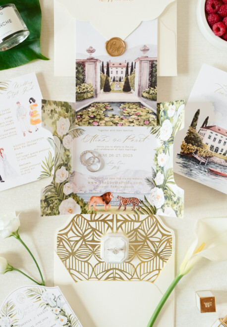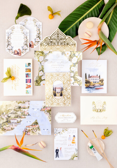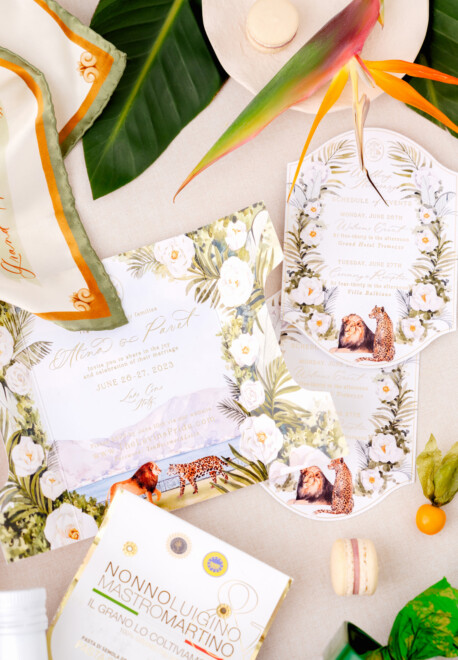 A union of watercolor illustrations and patterns developed by artificial intelligence, combining handcrafted artistry with the latest printing technologies. A custom monogram in the refined style of Hermes. Guest gifts include custom beach bags, handmade silk scarves, and a selection of Italian delicacies: Cinzano, Amaretti cookies, and olive oil.