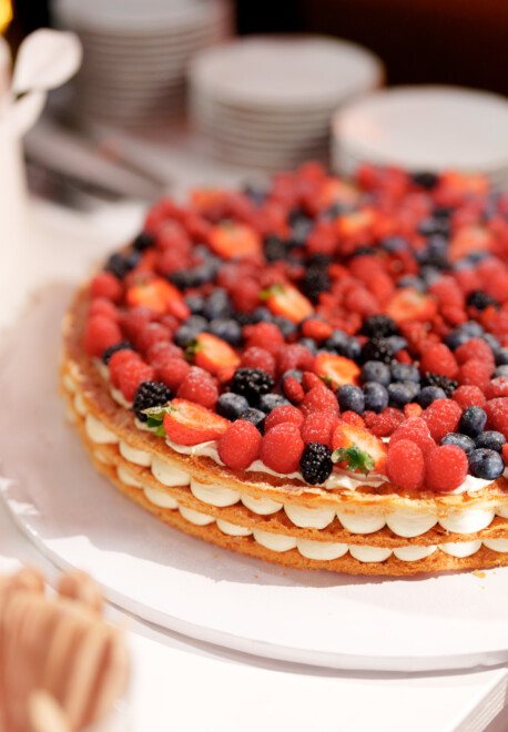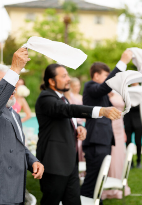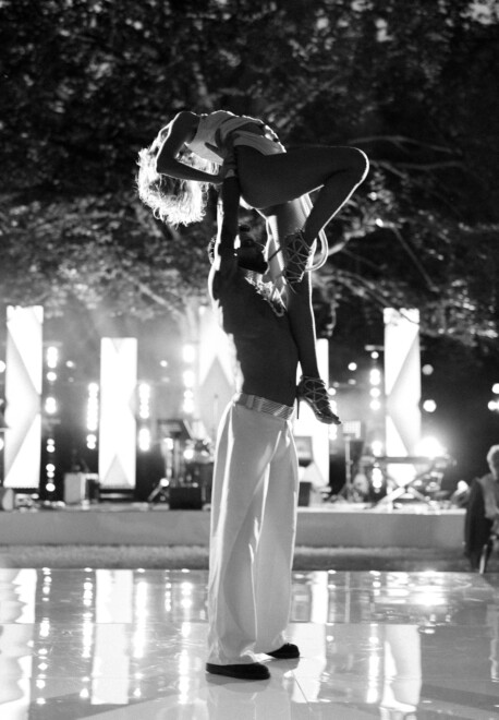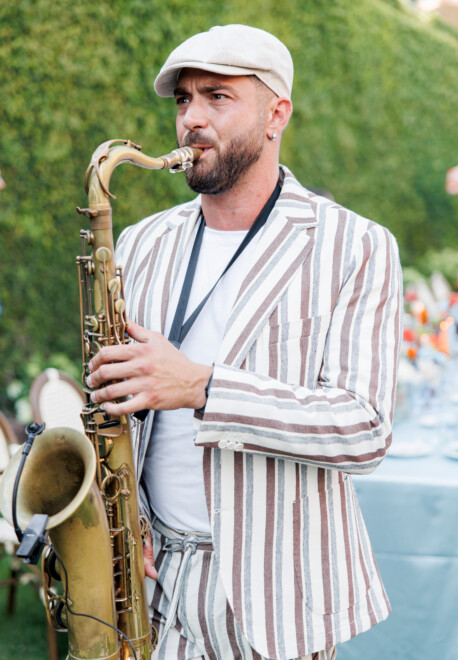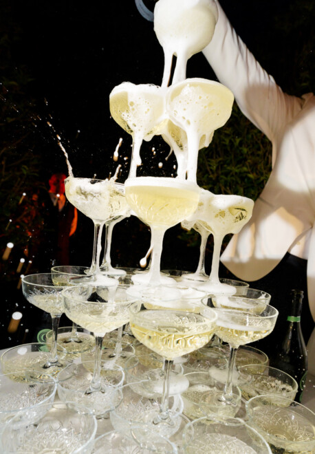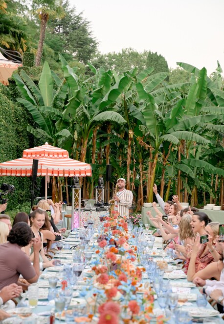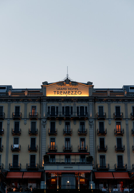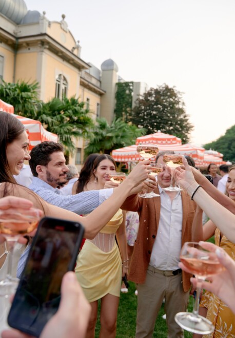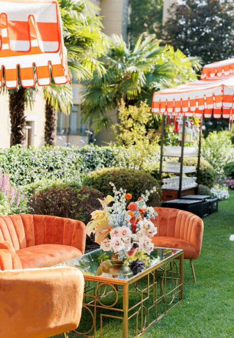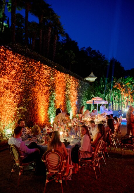 The terrace of the Hotel Tremezzo was chosen for its combination of a tropical vibe with palm trees and vibrant beach umbrellas, embodying all the tourists’ notions of the Italian “dolce vita.” The dinner was organized in two formats: during the serving of the hot dishes, guests were seated at one cozy long table, while at other times, they enjoyed the bar and lounge areas.