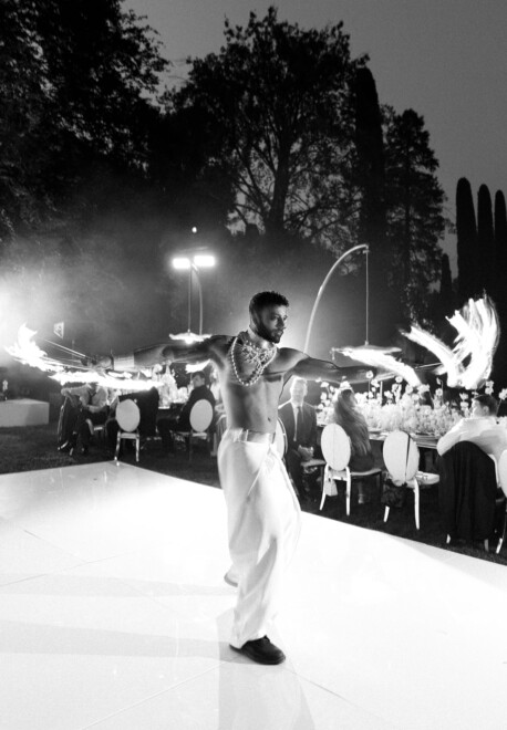 Our team designed custom costumes for the dancers to welcome guests and perform during the dinner, inspired by the spirit of wild animals and the artistic genre of “Sci Fi.” Upon the guests’ arrival at Villa Balbiano, they were greeted by professional dancers dressed in these unique outfits, giving the event the appearance of a colorful jungle.