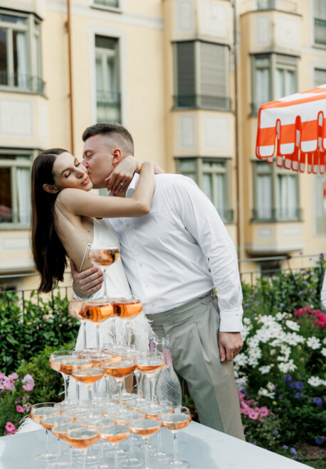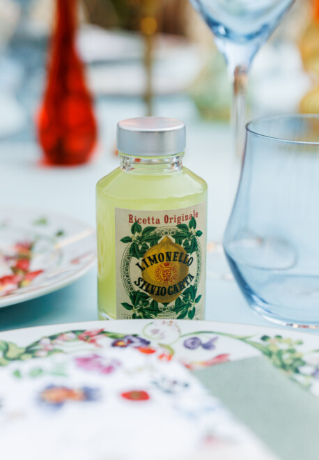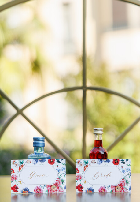 For the pre-wedding dinner, we created an original seating arrangement with mini liqueurs. A unique liqueur was selected and purchased for each guest—Limoncello, Gin, Amaretto, Amaro, Rum, Brandy, Campari, Tequila, and others, totaling 52 varieties of diverse mini bottles. These mini liqueurs adorned each guest’s place at the table, making the dinner warm and personal. This attention to detail turned the seating plan into an engaging game and greatly simplified the search for one’s seat at the table.