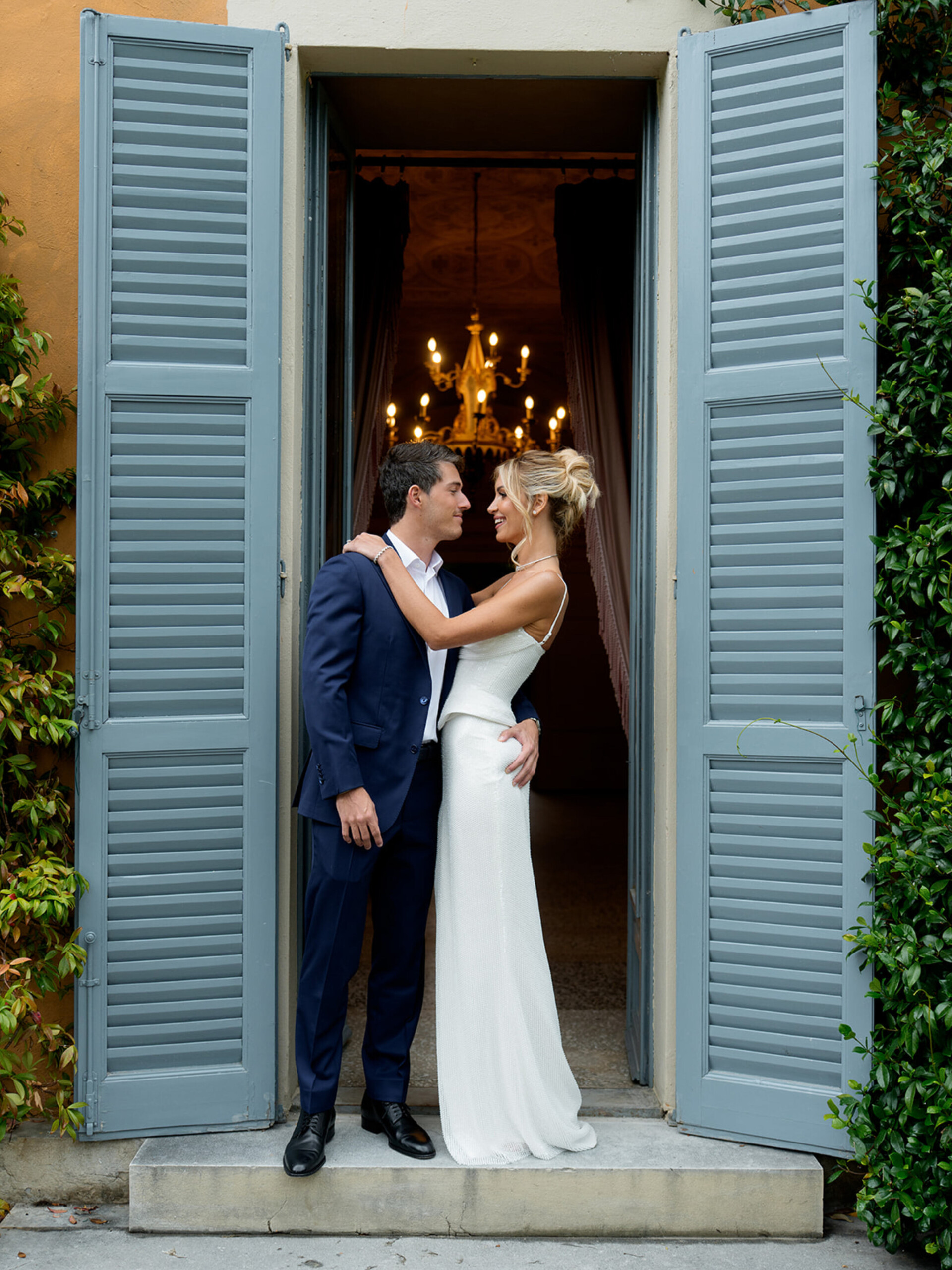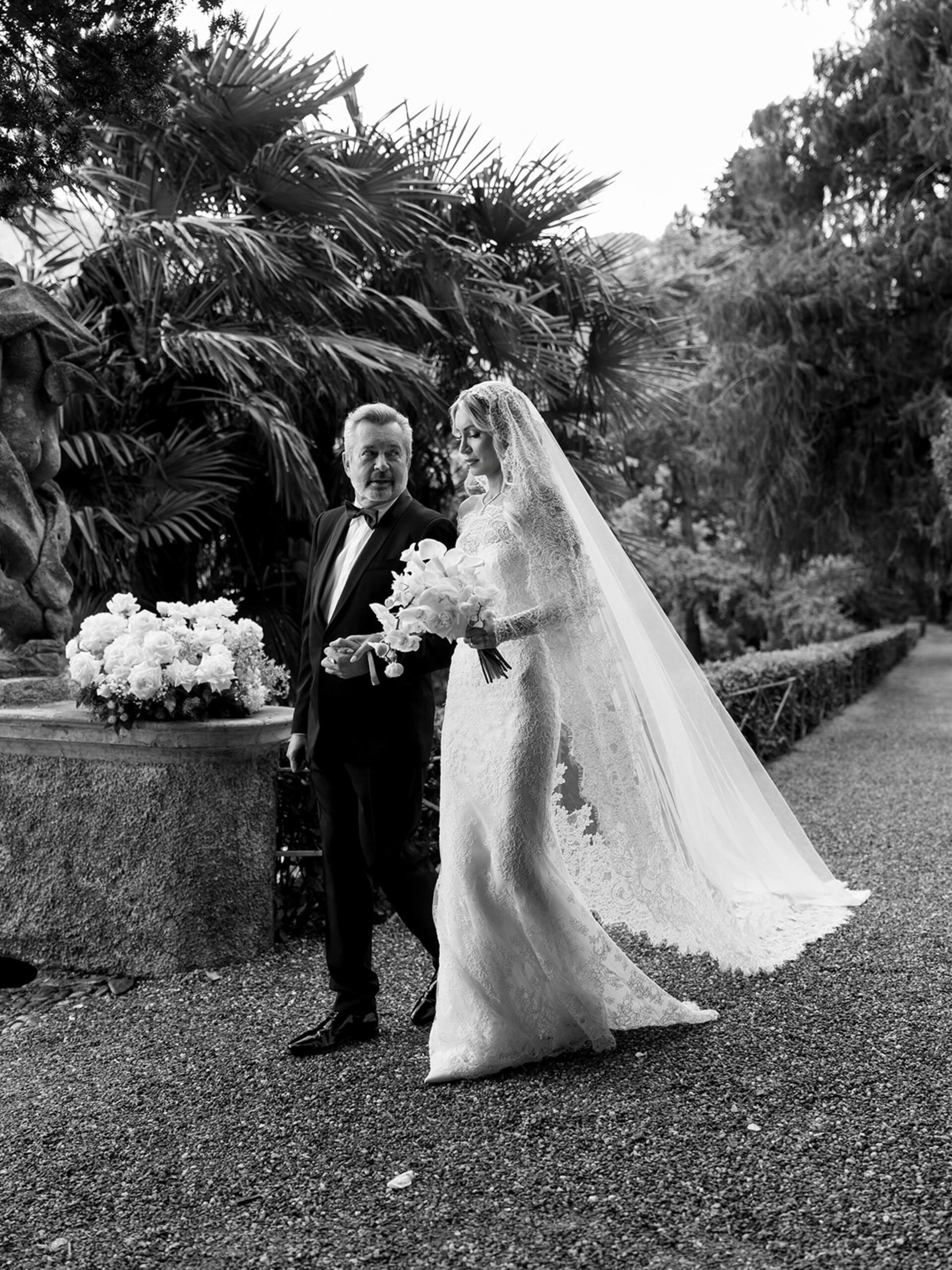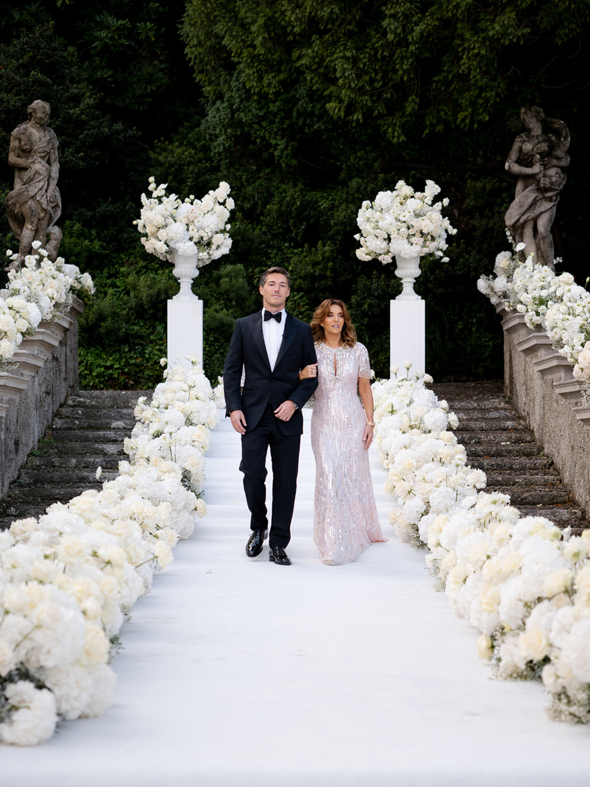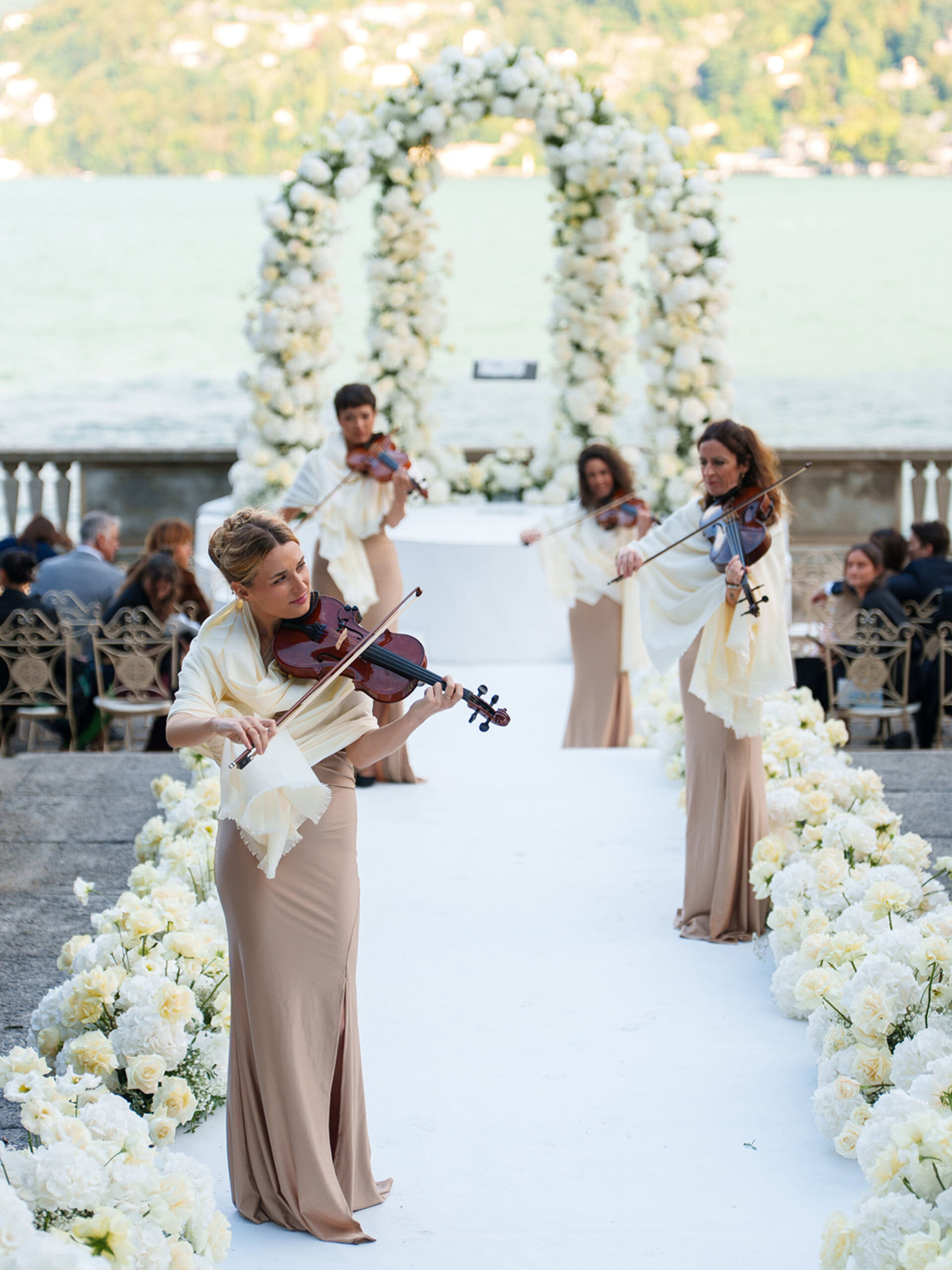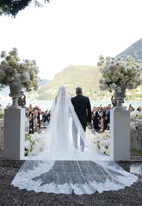 Mathilde wore a couture Zuhair Murad gown – a structured, luminous silhouette with intricate detailing that added a couture finish to the entire bridal look. Dylan’s tailored attire complemented her perfectly, creating a couple who looked effortlessly refined against the Lake Como backdrop. The morning moved with elegant calm: preparations inside the villa, musicians rehearsing along the water, and floral artists perfecting the clean white aesthetic that shaped the entire wedding design.