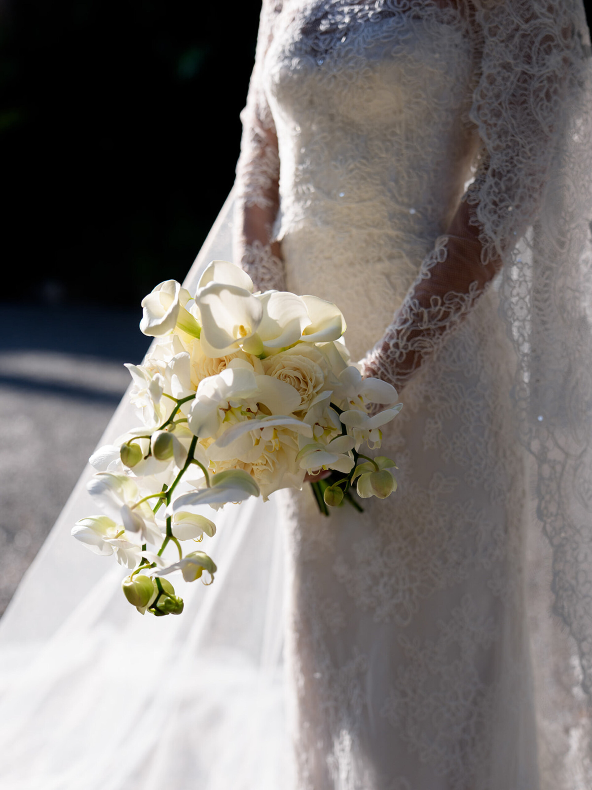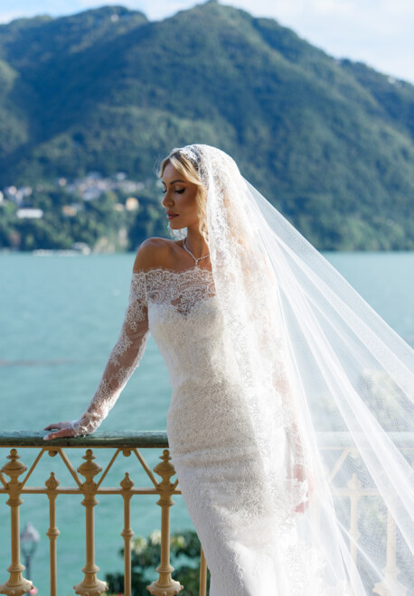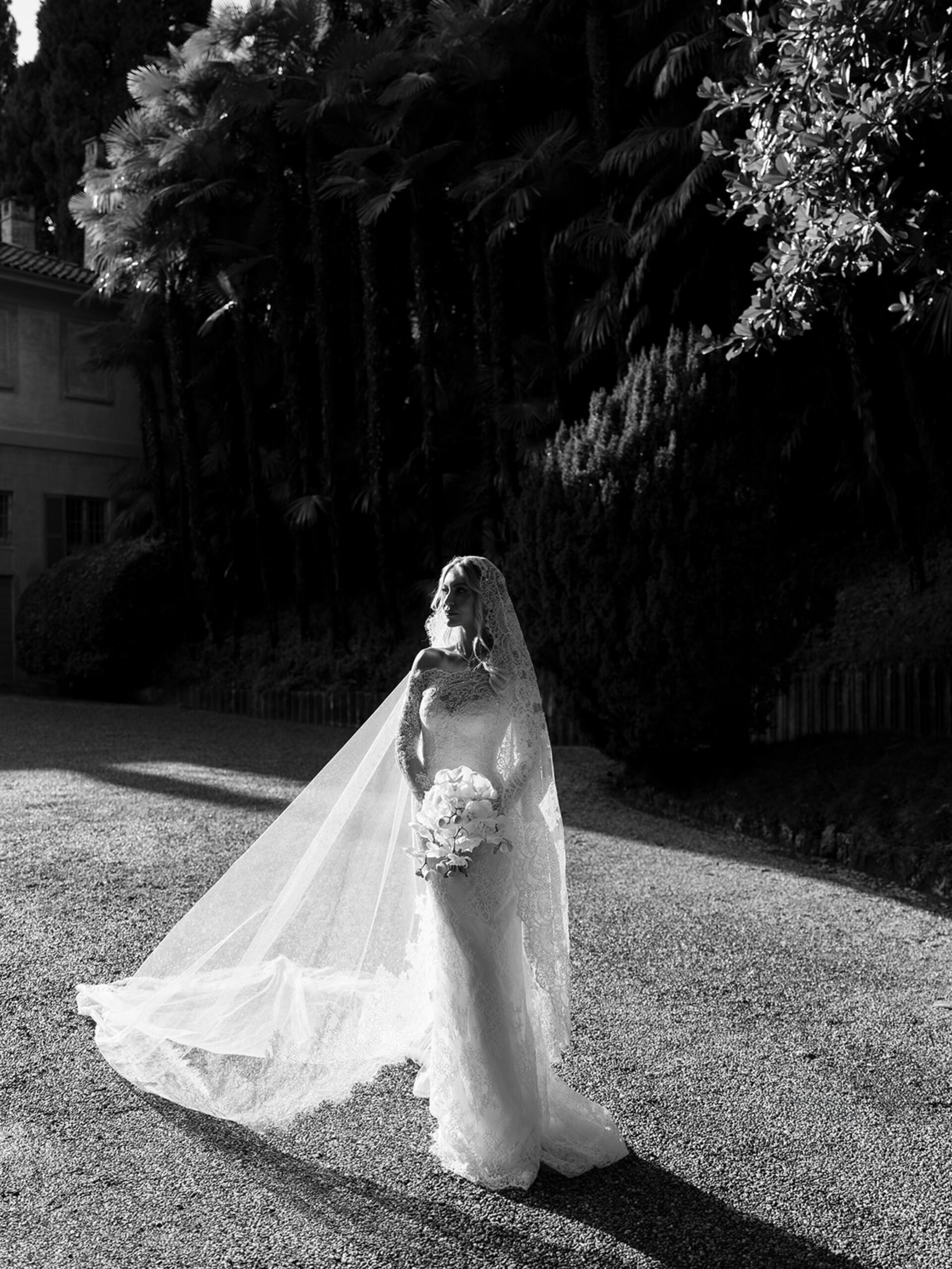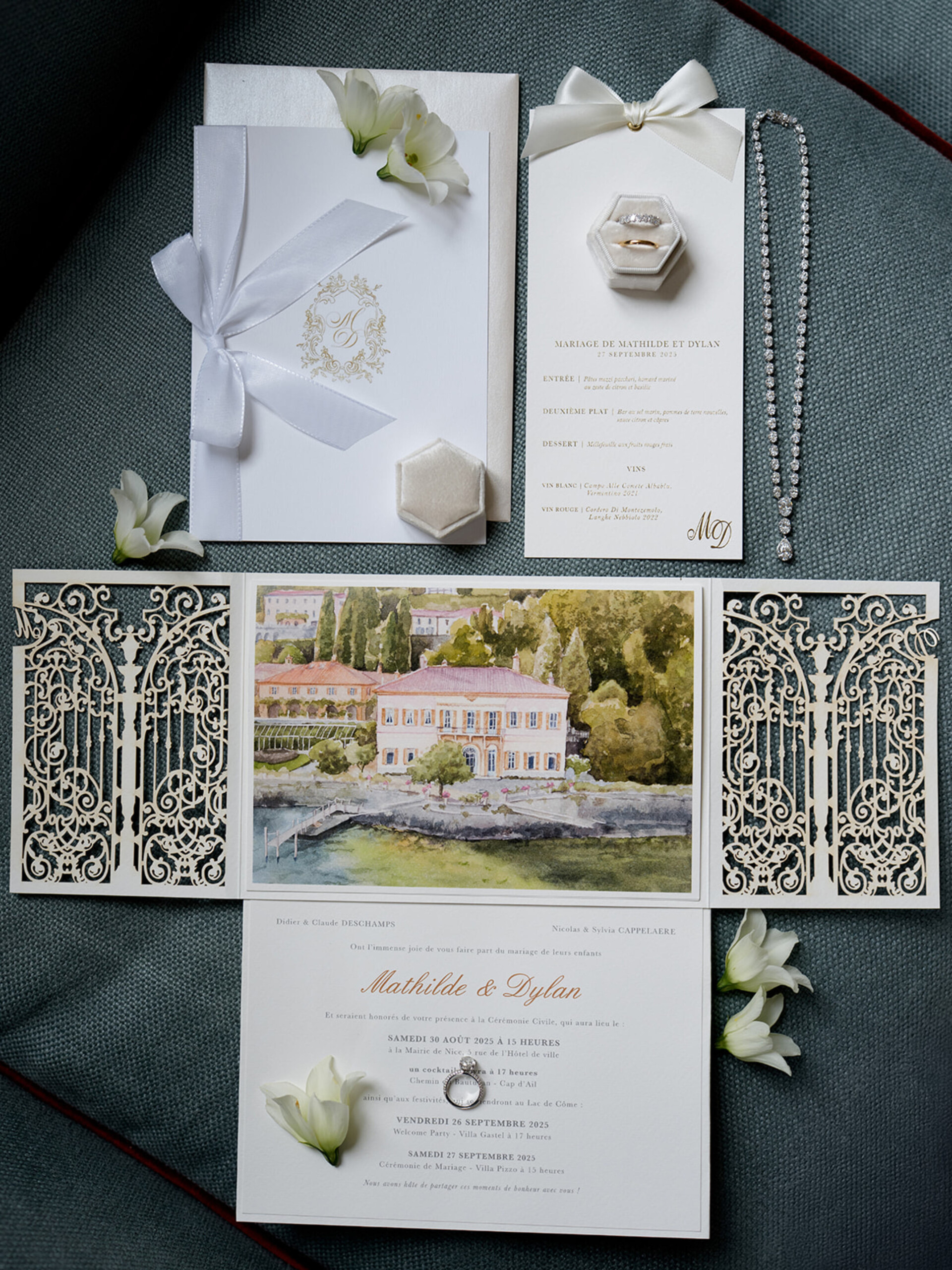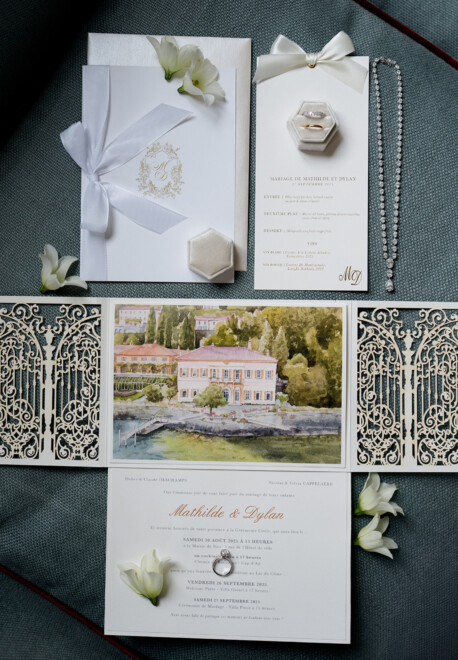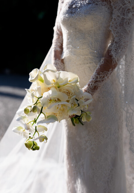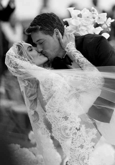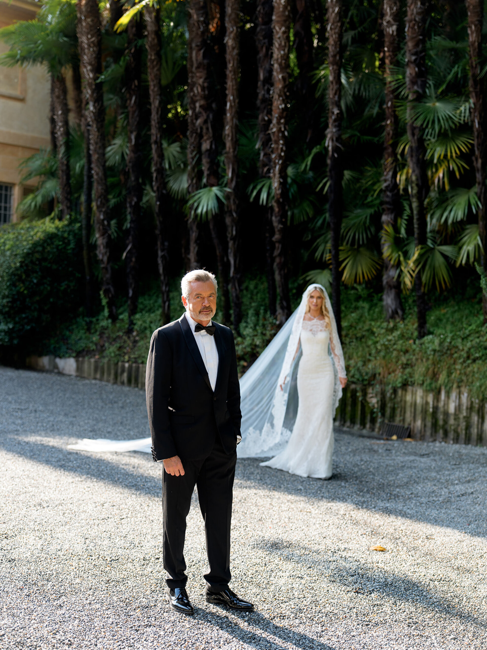 Mathilde wore a couture Zuhair Murad gown – a structured, luminous silhouette with intricate detailing that added a couture finish to the entire bridal look. Dylan’s tailored attire complemented her perfectly, creating a couple who looked effortlessly refined against the Lake Como backdrop. The morning moved with elegant calm: preparations inside the villa, musicians rehearsing along the water, and floral artists perfecting the clean white aesthetic that shaped the entire wedding design.