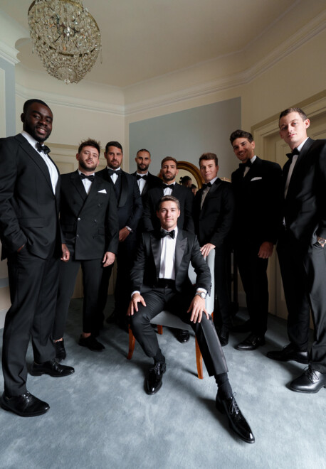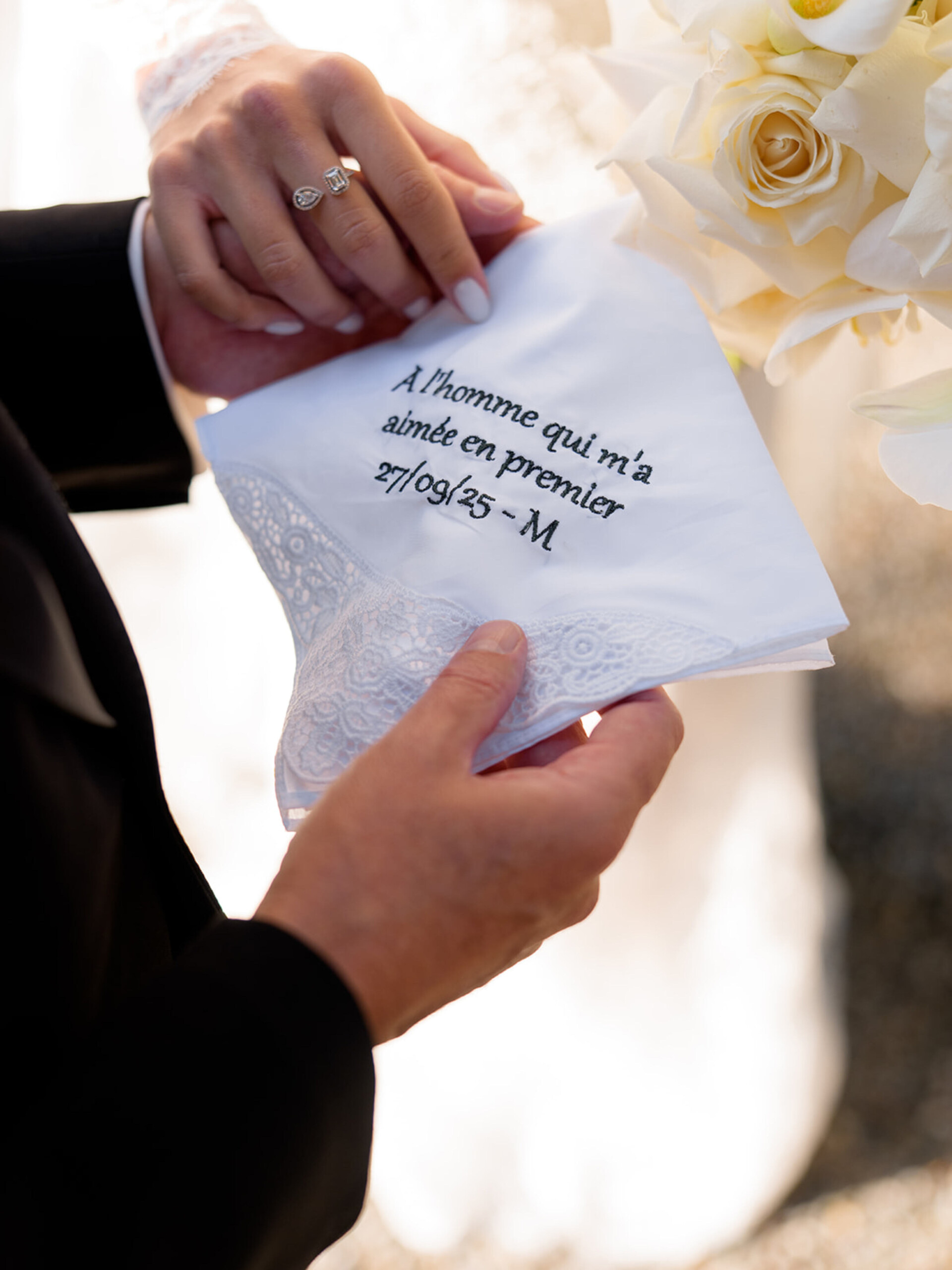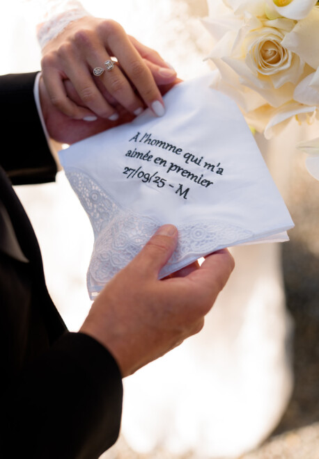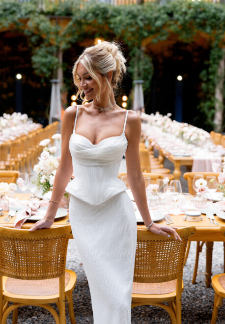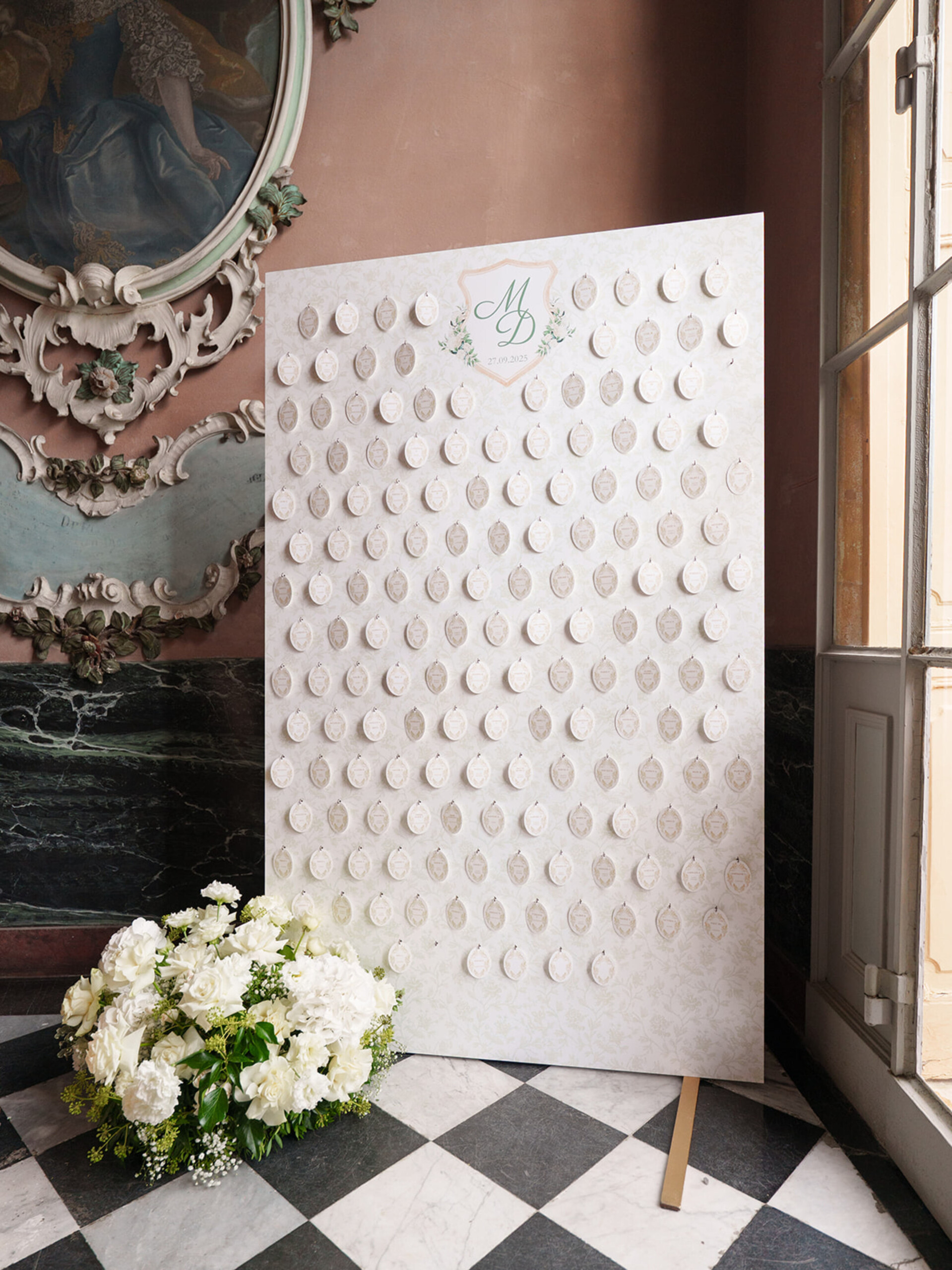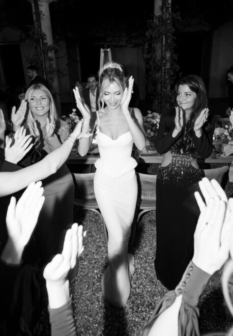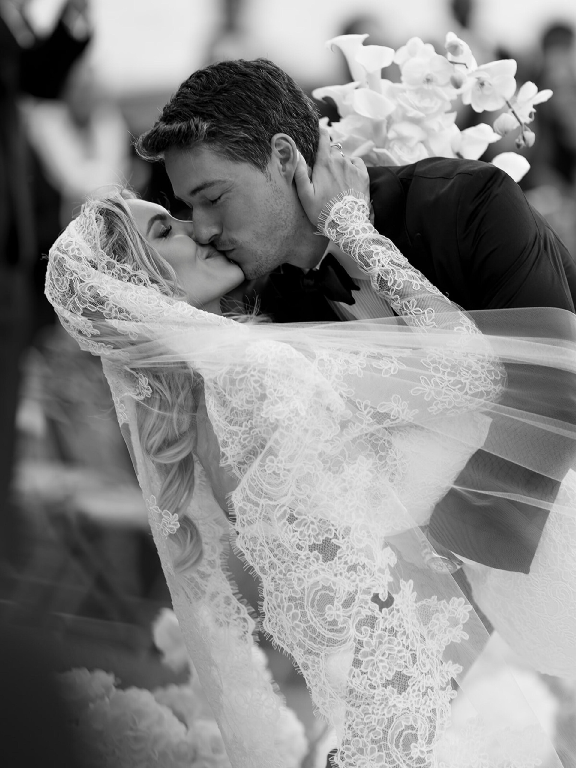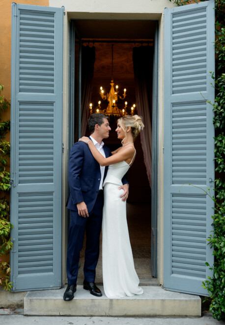 Mathilde wore a couture Zuhair Murad gown – a structured, luminous silhouette with intricate detailing that added a couture finish to the entire bridal look. Dylan’s tailored attire complemented her perfectly, creating a couple who looked effortlessly refined against the Lake Como backdrop. The morning moved with elegant calm: preparations inside the villa, musicians rehearsing along the water, and floral artists perfecting the clean white aesthetic that shaped the entire wedding design.