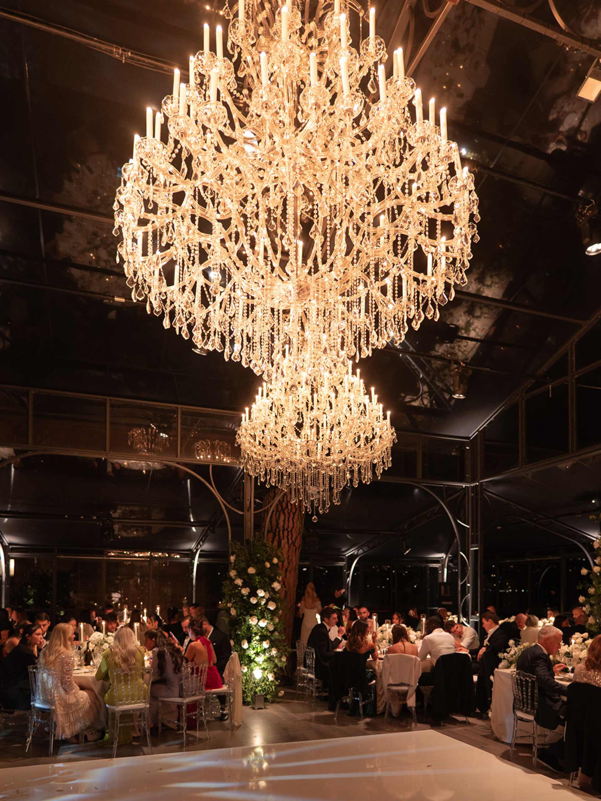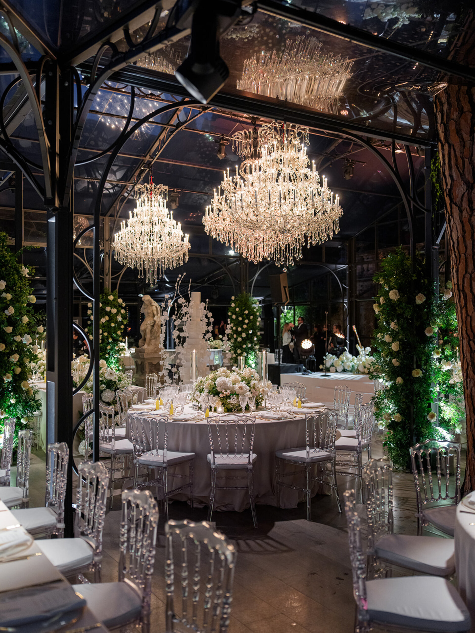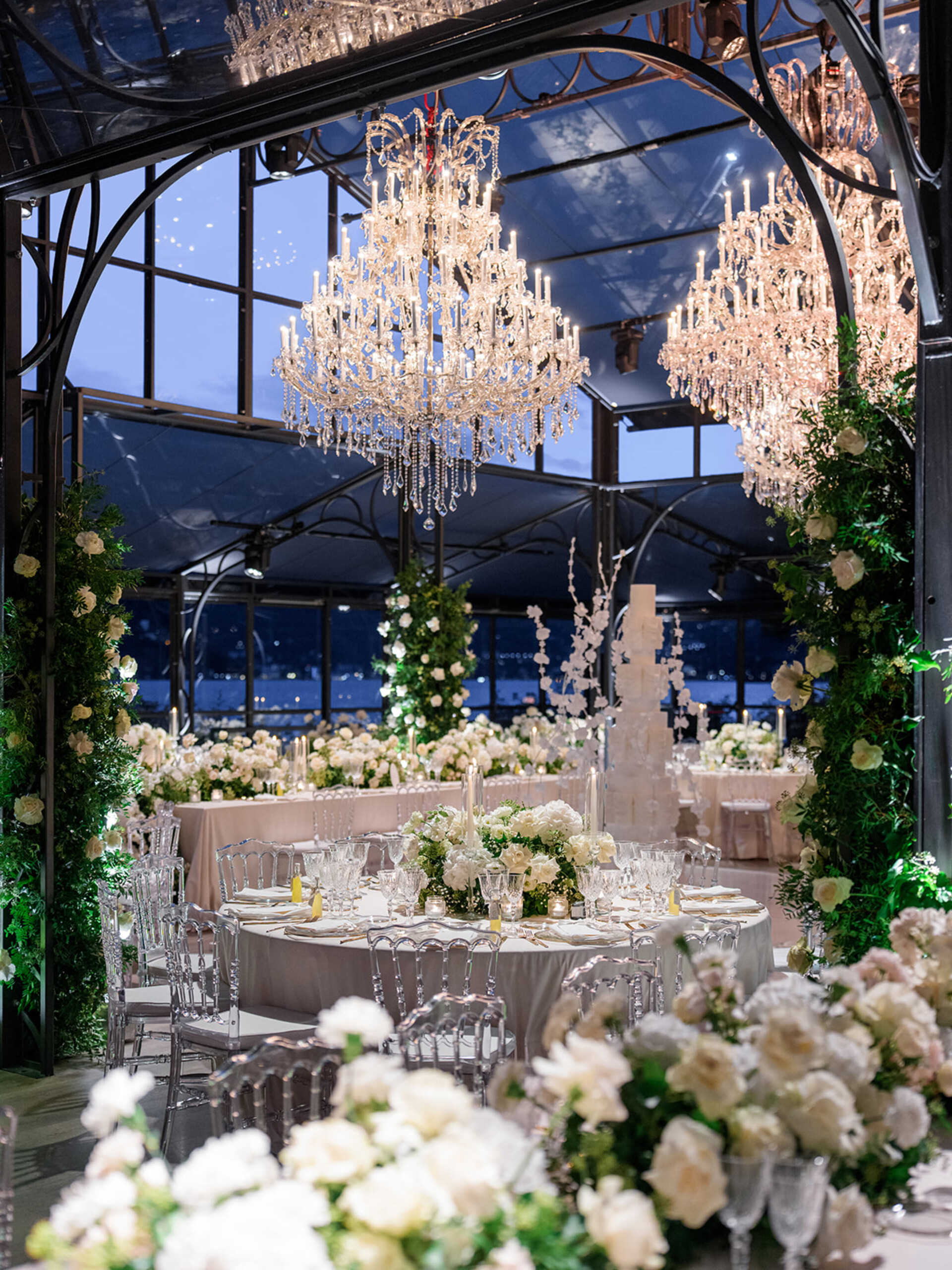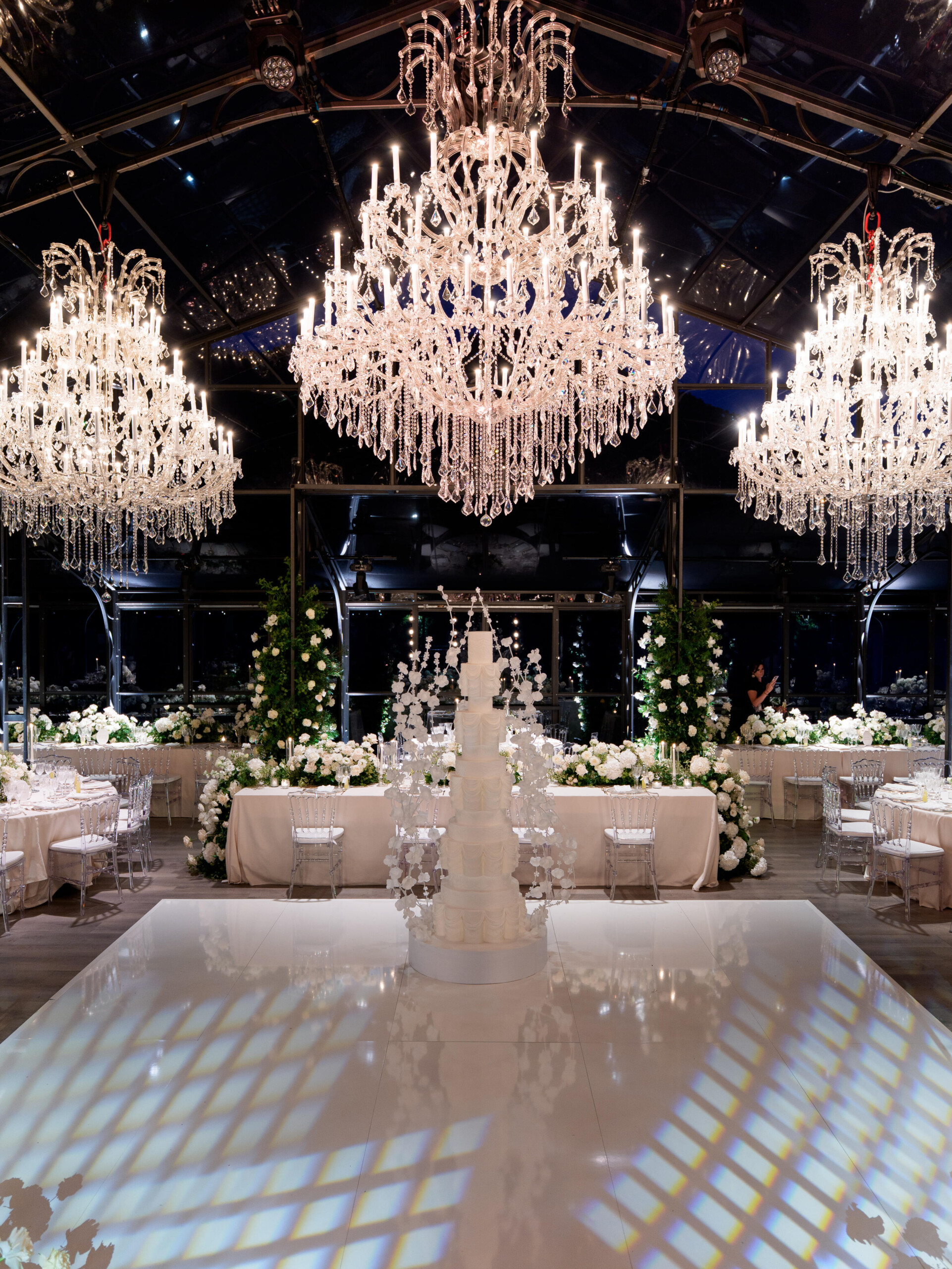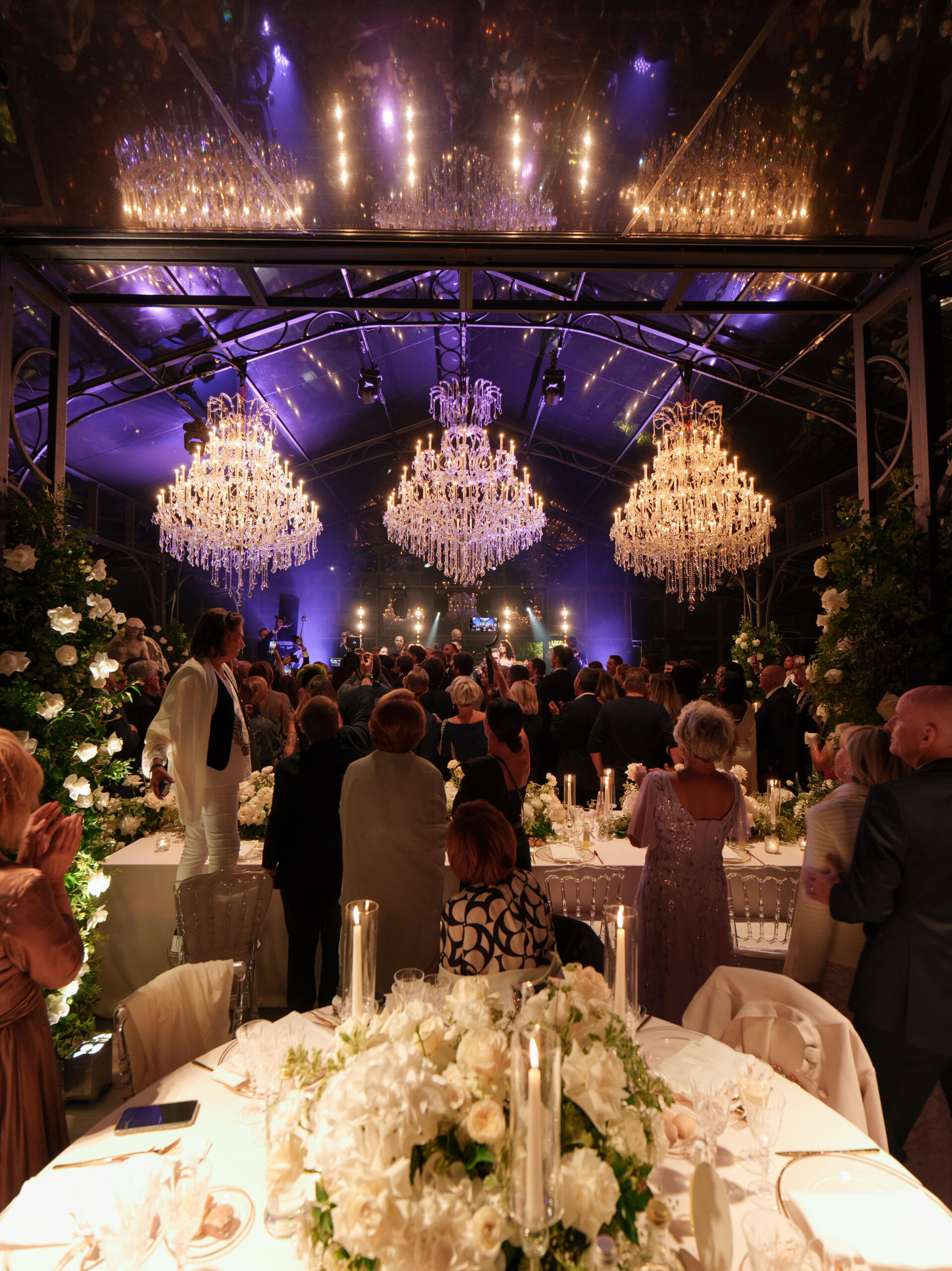 Dinner took place beneath grand chandeliers suspended above the long reception tables, casting a warm glow over the sea of white florals. The décor was intentionally clean: modern white columns, sculptural arrangements, and refined detailing that kept the focus on atmosphere and light.