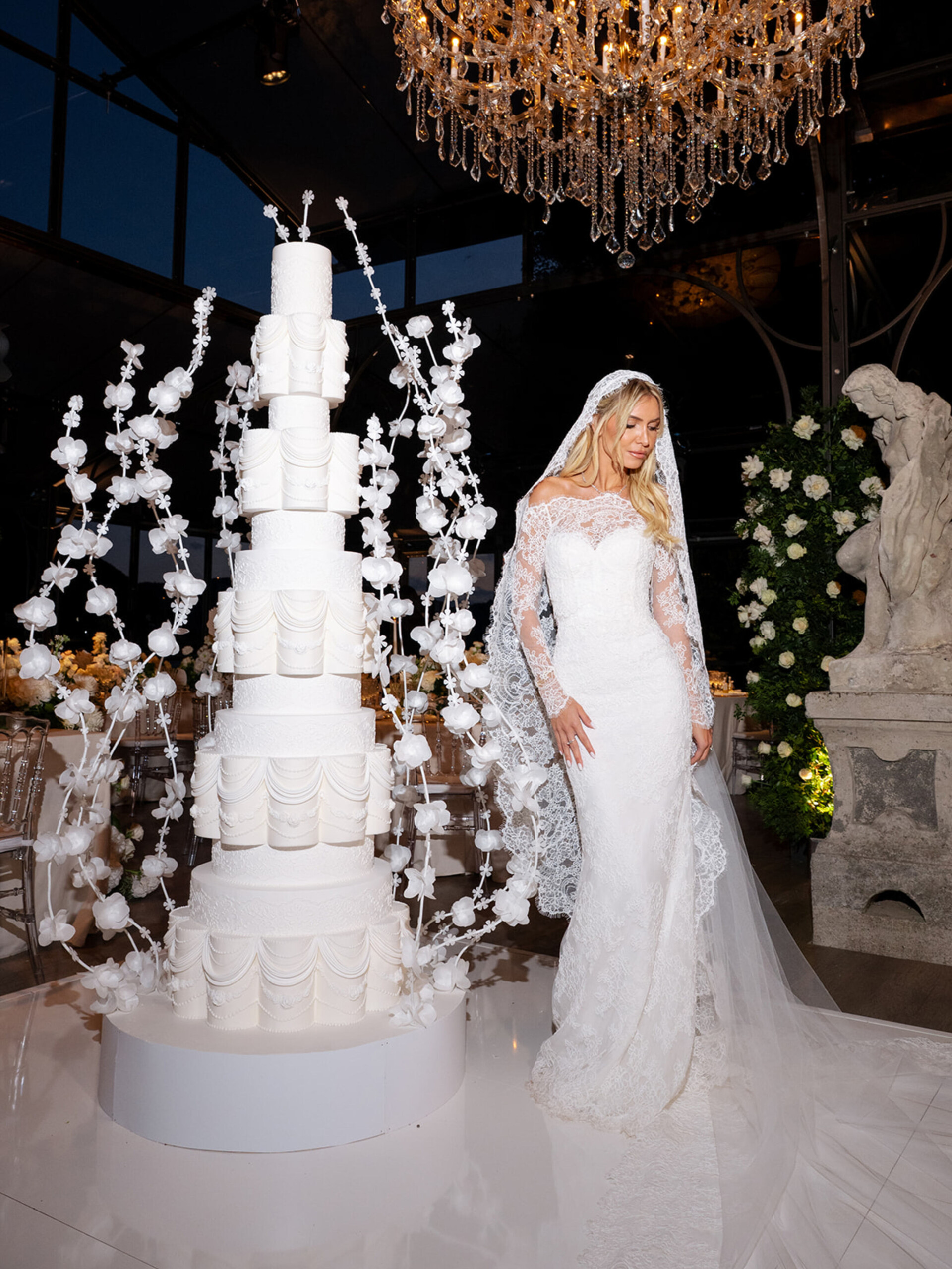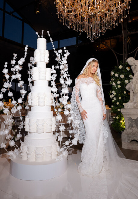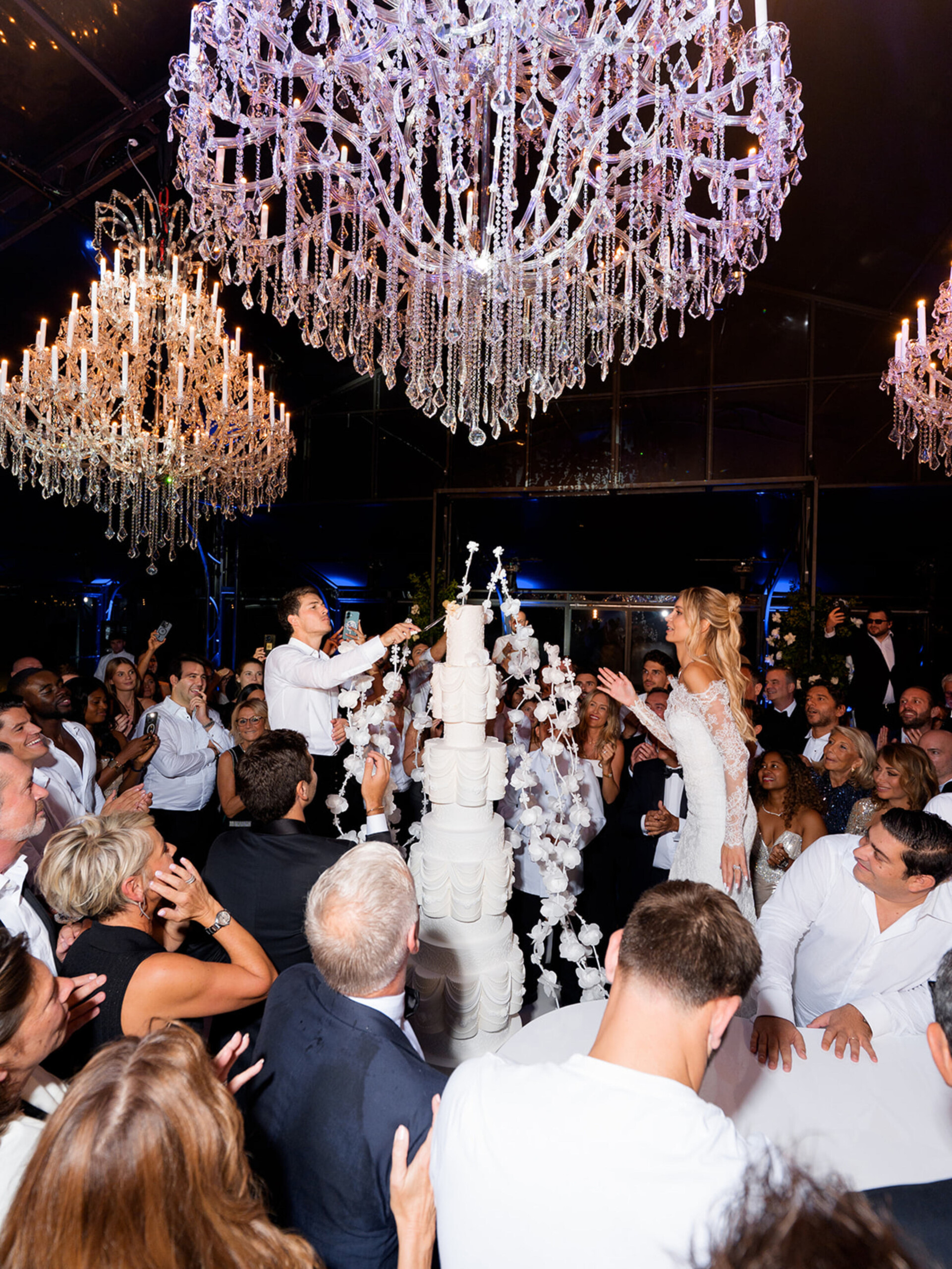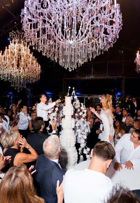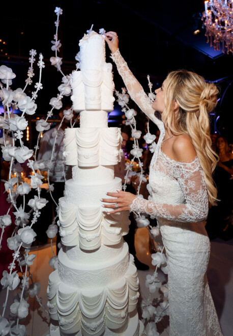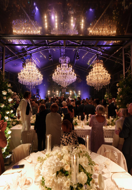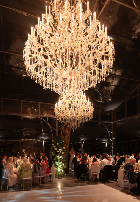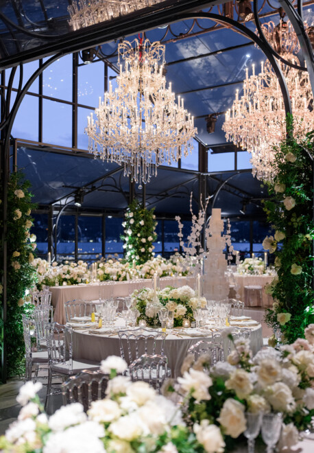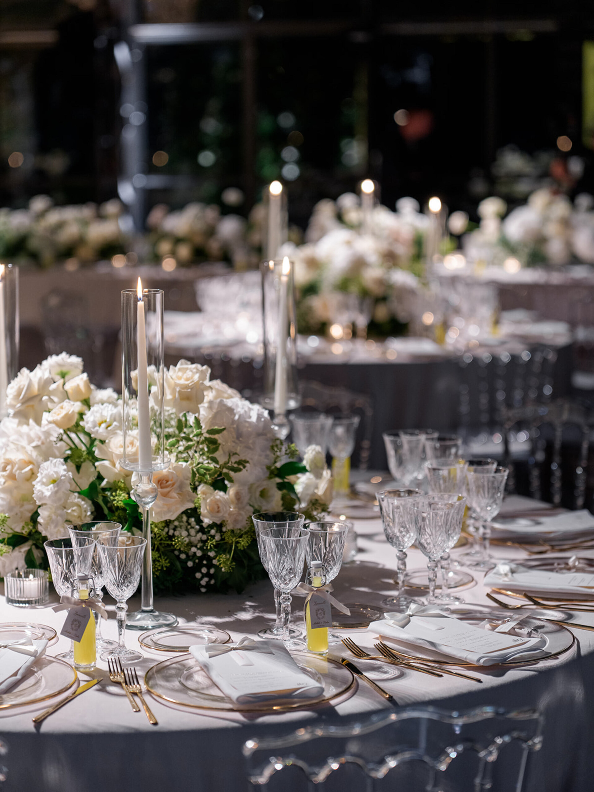 Dinner took place beneath grand chandeliers suspended above the long reception tables, casting a warm glow over the sea of white florals. The décor was intentionally clean: modern white columns, sculptural arrangements, and refined detailing that kept the focus on atmosphere and light.