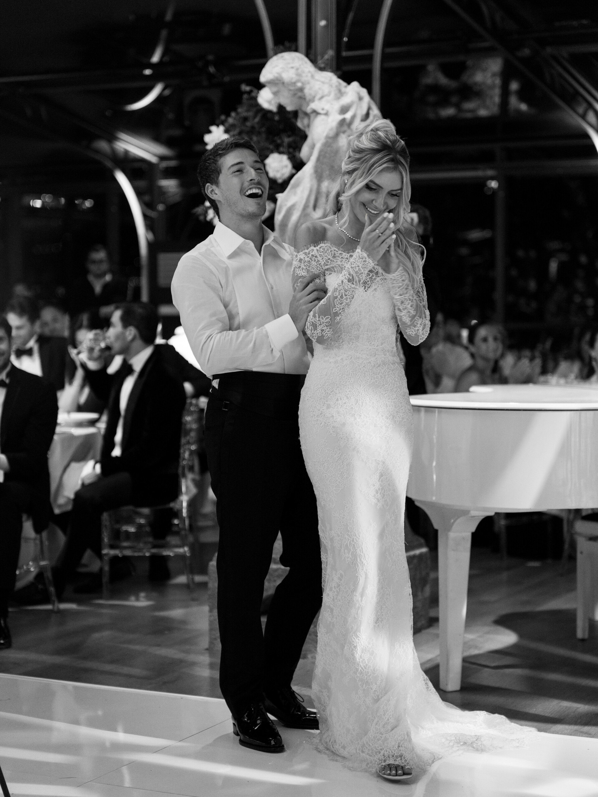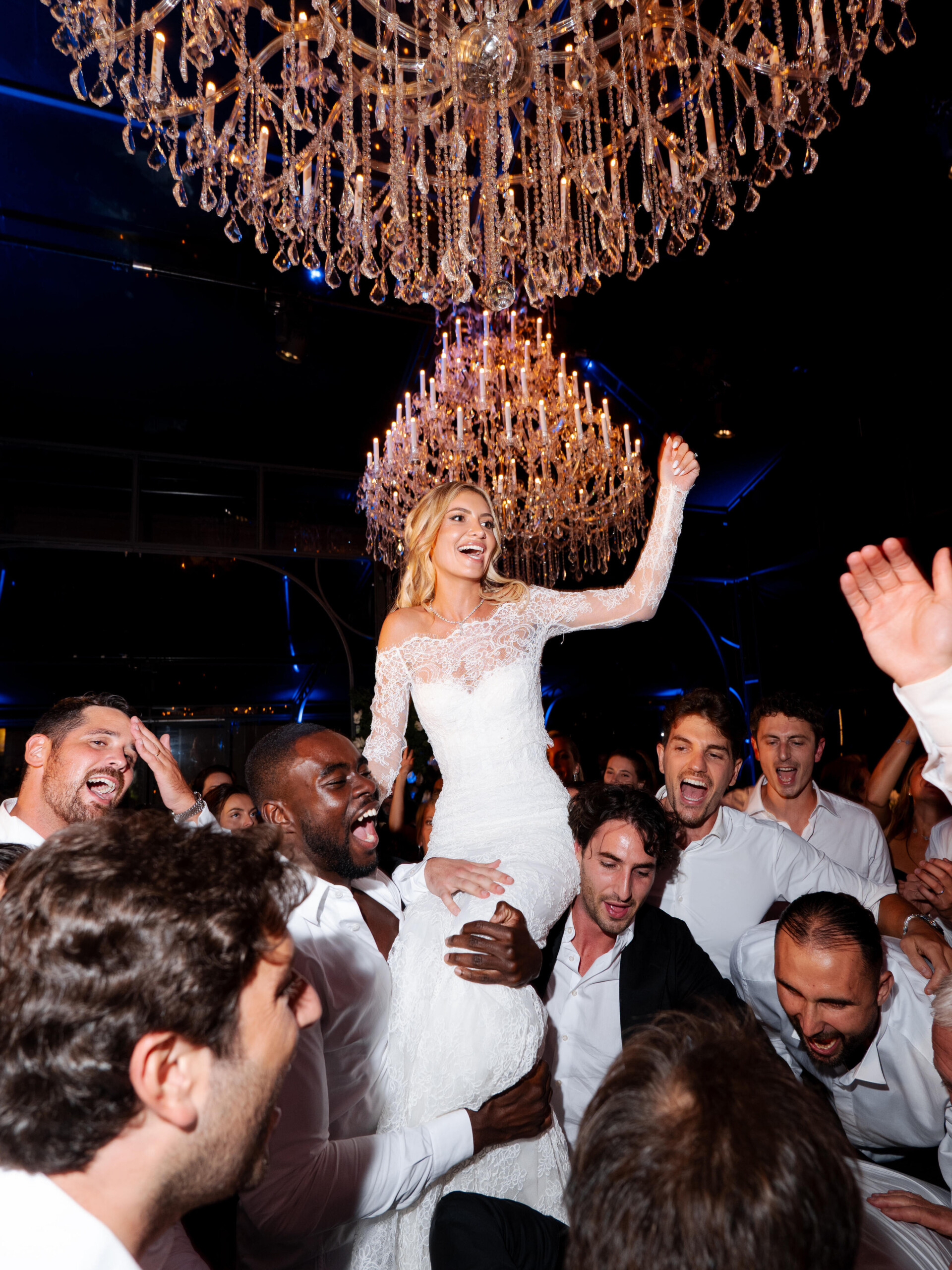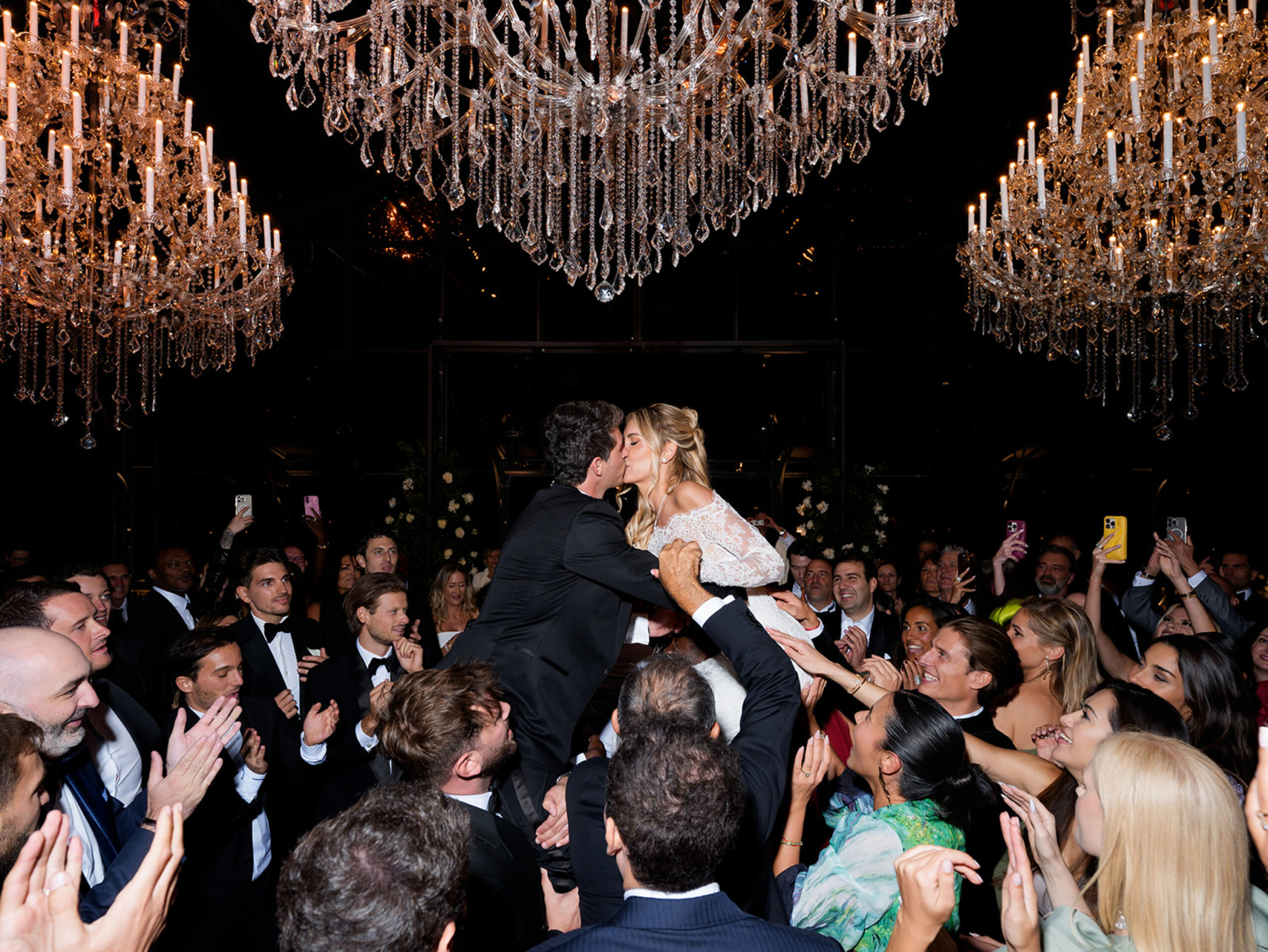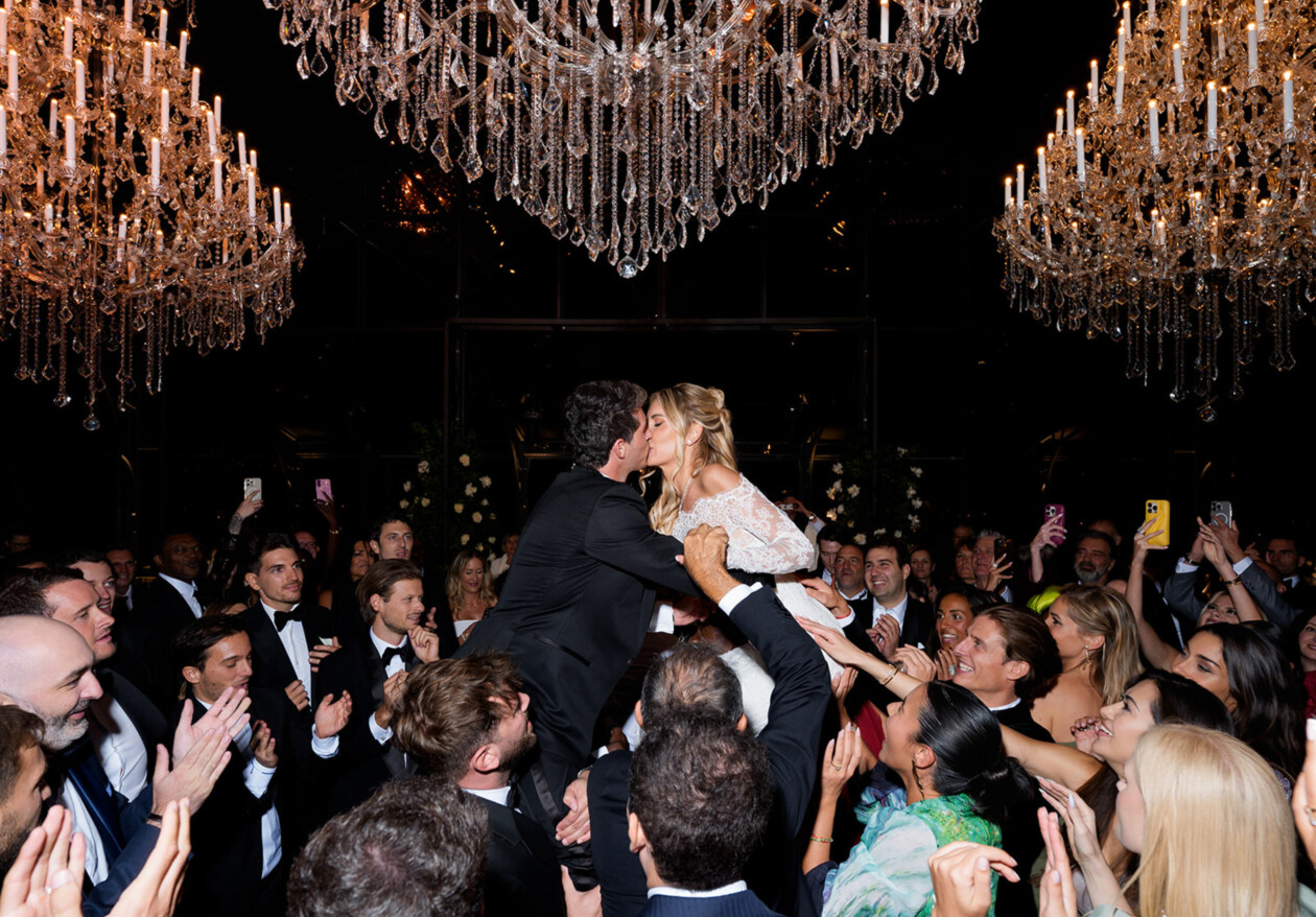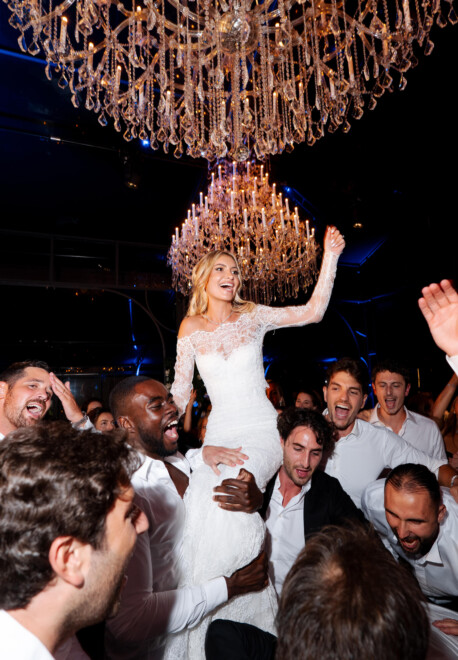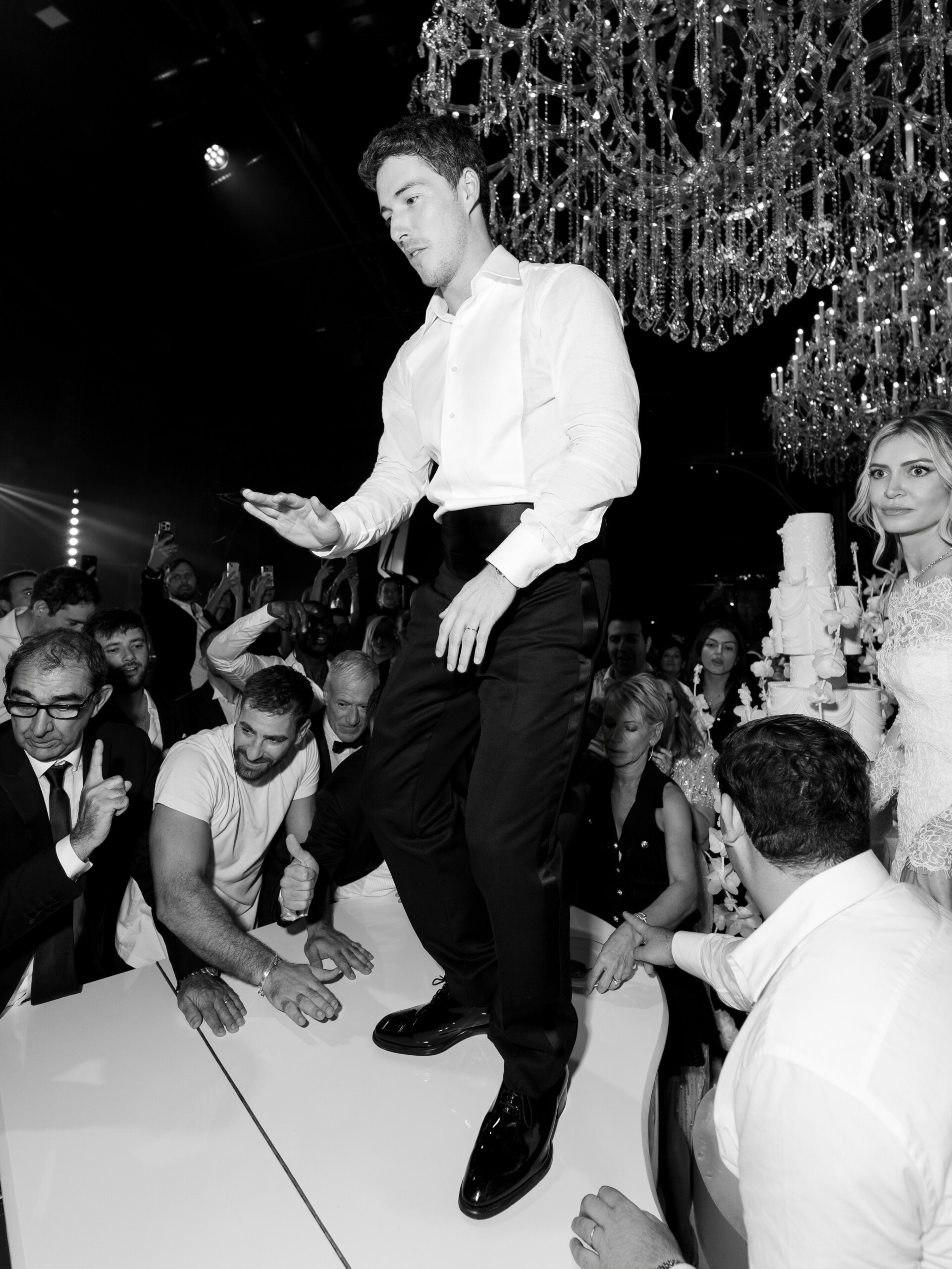 Dinner took place beneath grand chandeliers suspended above the long reception tables, casting a warm glow over the sea of white florals. The décor was intentionally clean: modern white columns, sculptural arrangements, and refined detailing that kept the focus on atmosphere and light.