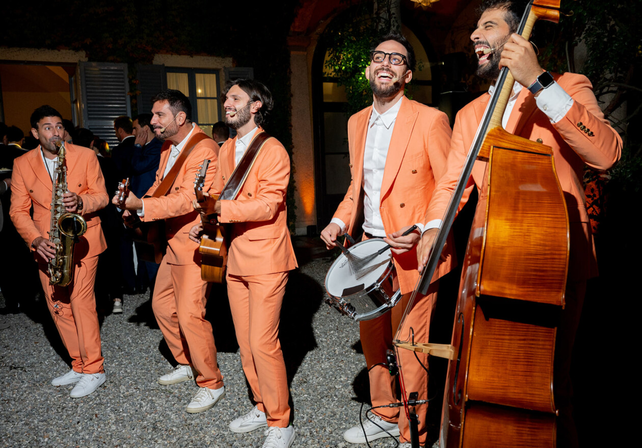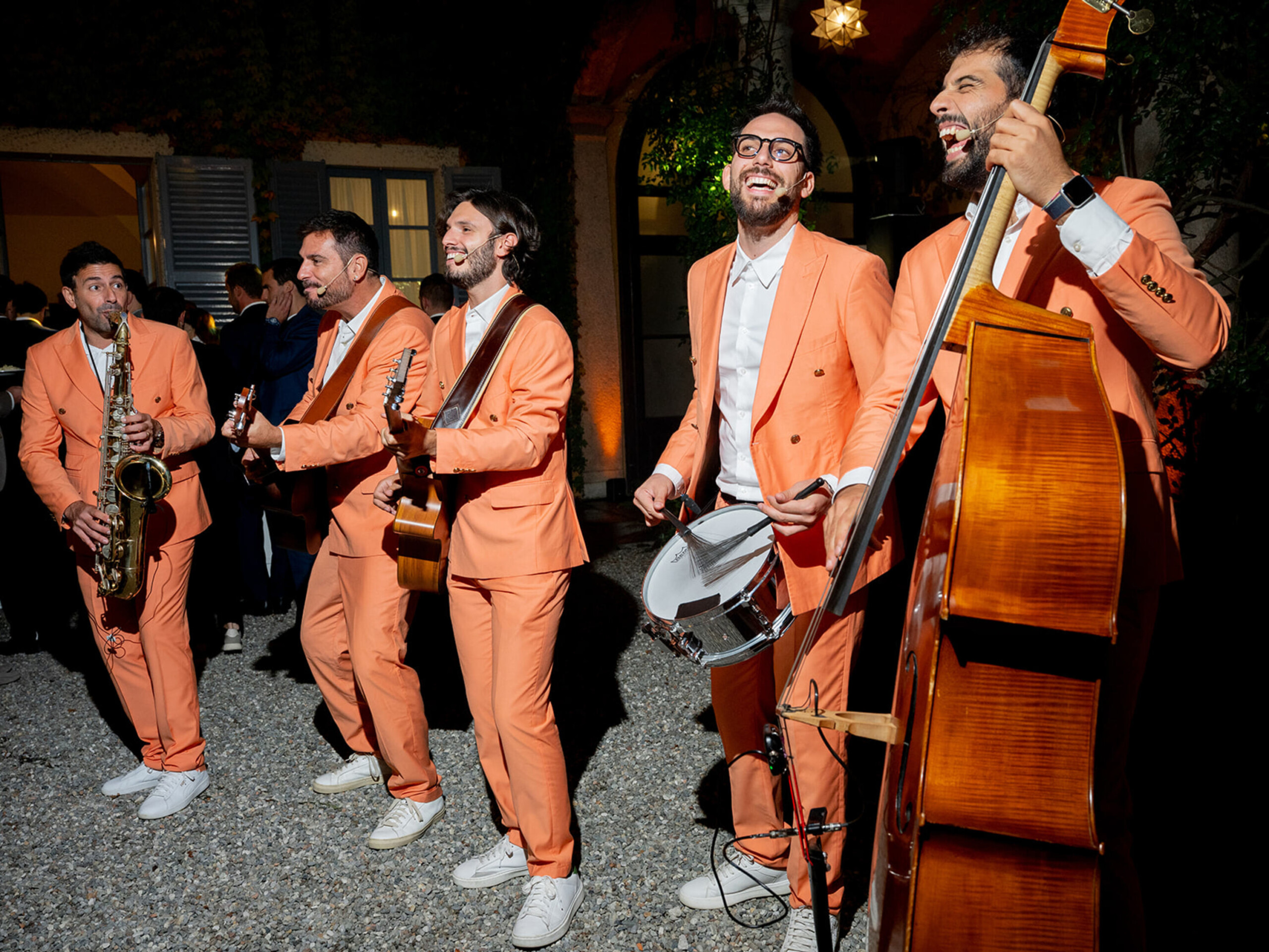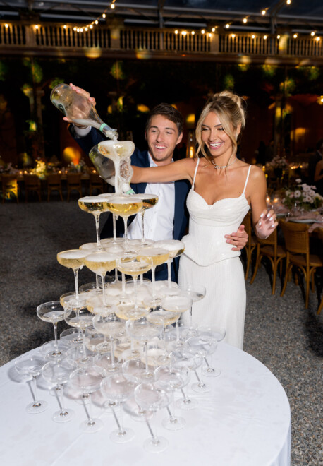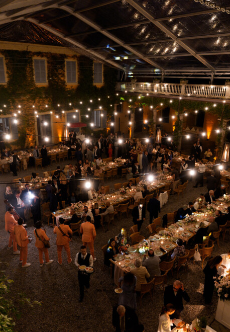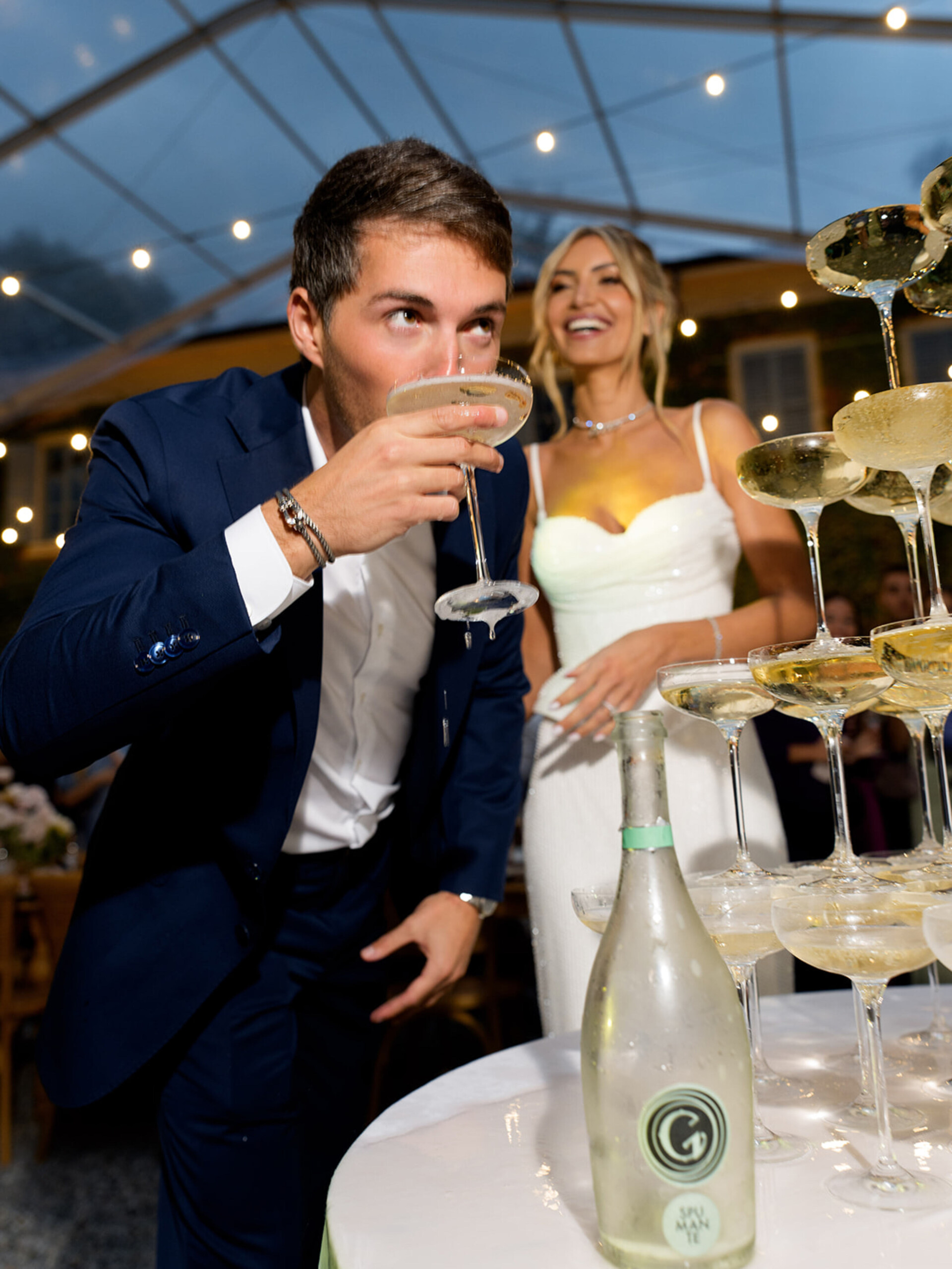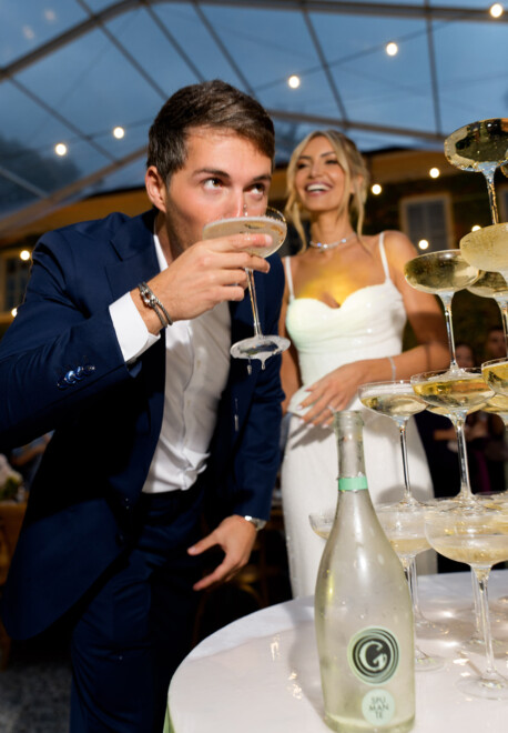The wedding weekend opened with an elegant welcome reception styled in soft dust-pink florals and refined décor that set a graceful tone for the celebration ahead. Guests gathered around a champagne tower as live musicians played a mix of modern and classical pieces, creating an elevated yet relaxed atmosphere. With dancing, flowing champagne, and beautifully curated details, the evening felt like a sophisticated introduction to the couple’s wonderful Lake Como wedding.
