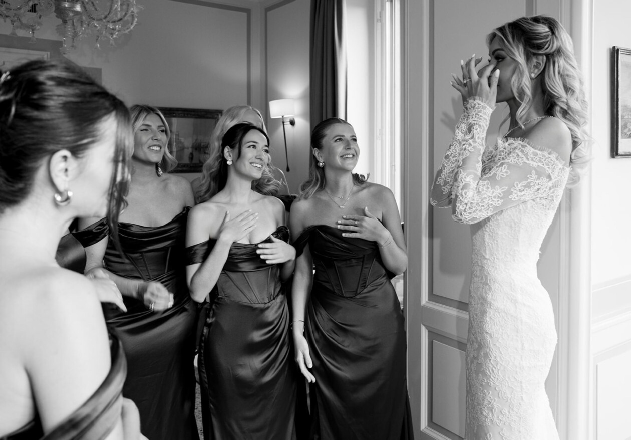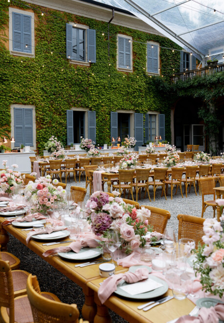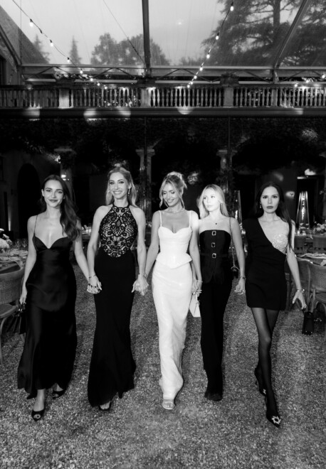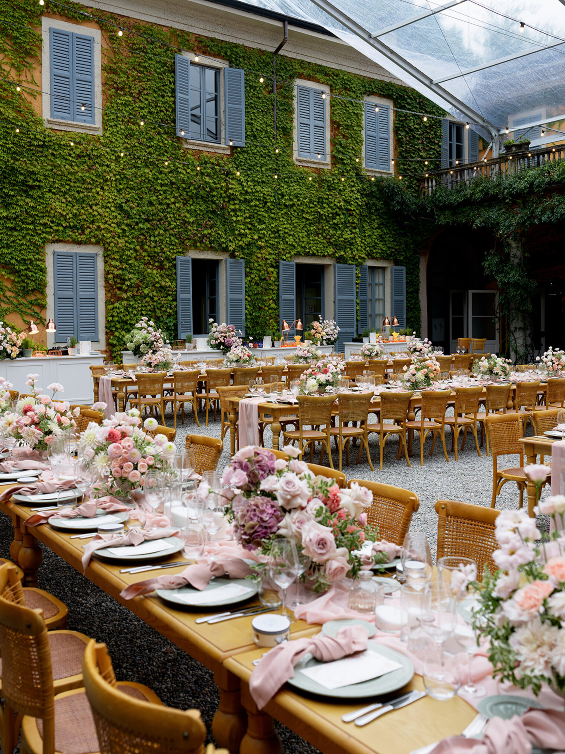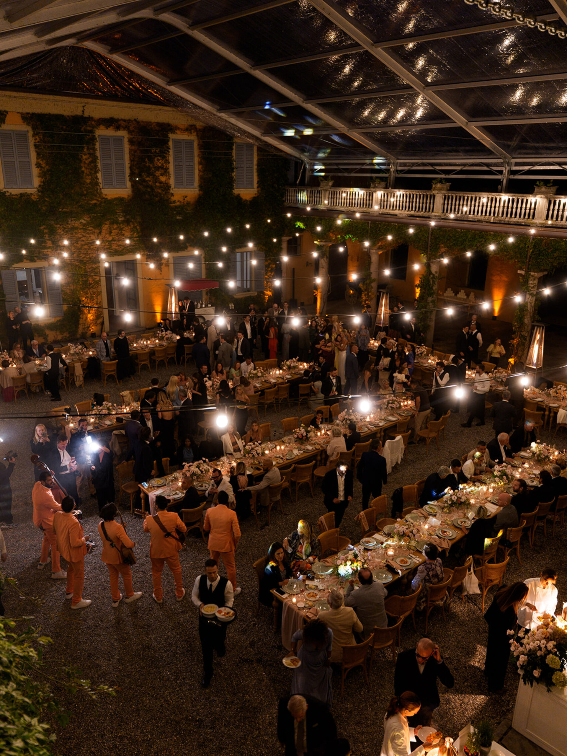 The wedding weekend opened with an elegant welcome reception styled in soft dust-pink florals and refined décor that set a graceful tone for the celebration ahead. Guests gathered around a champagne tower as live musicians played a mix of modern and classical pieces, creating an elevated yet relaxed atmosphere. With dancing, flowing champagne, and beautifully curated details, the evening felt like a sophisticated introduction to the couple’s wonderful Lake Como wedding.