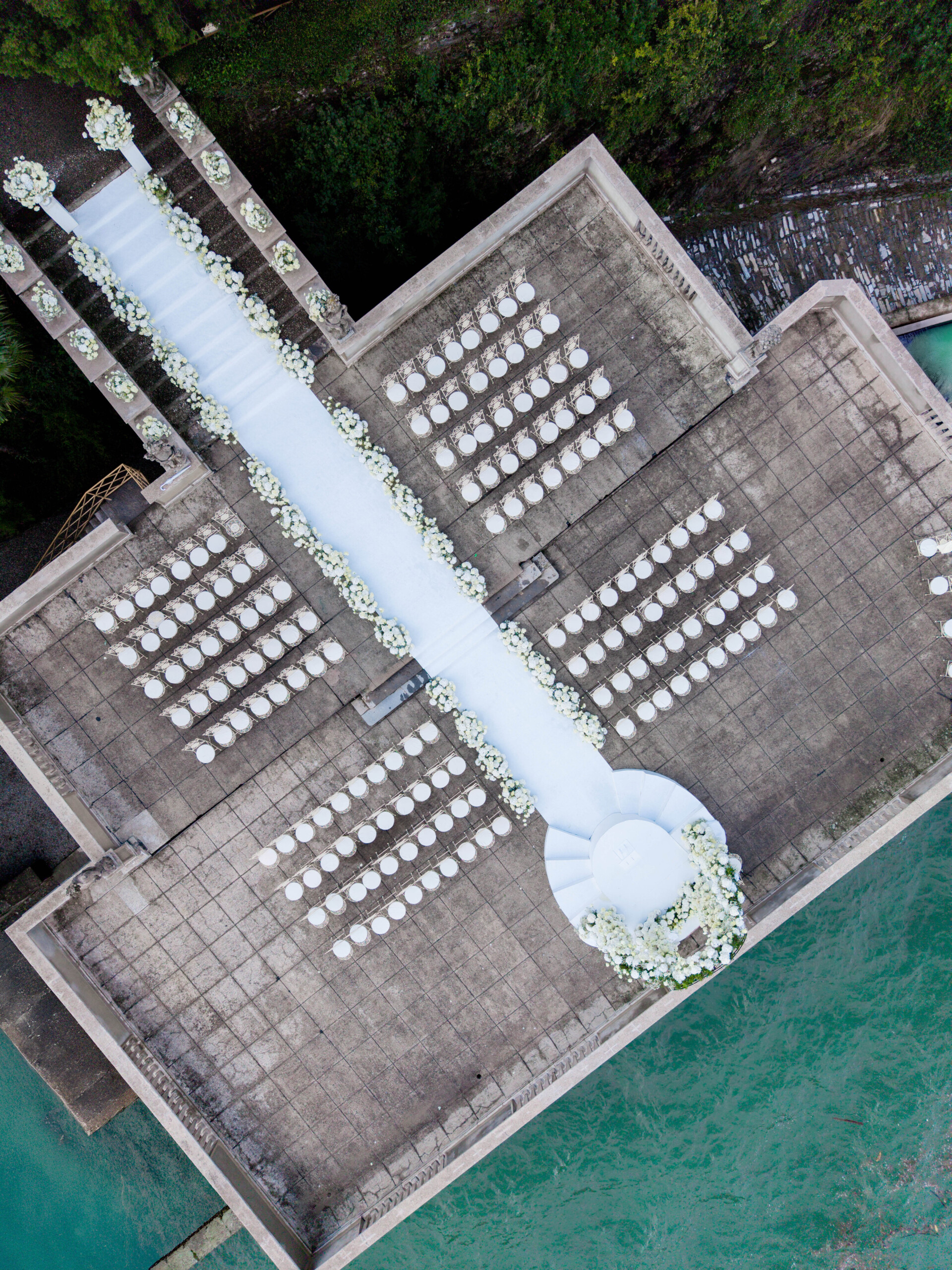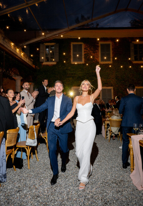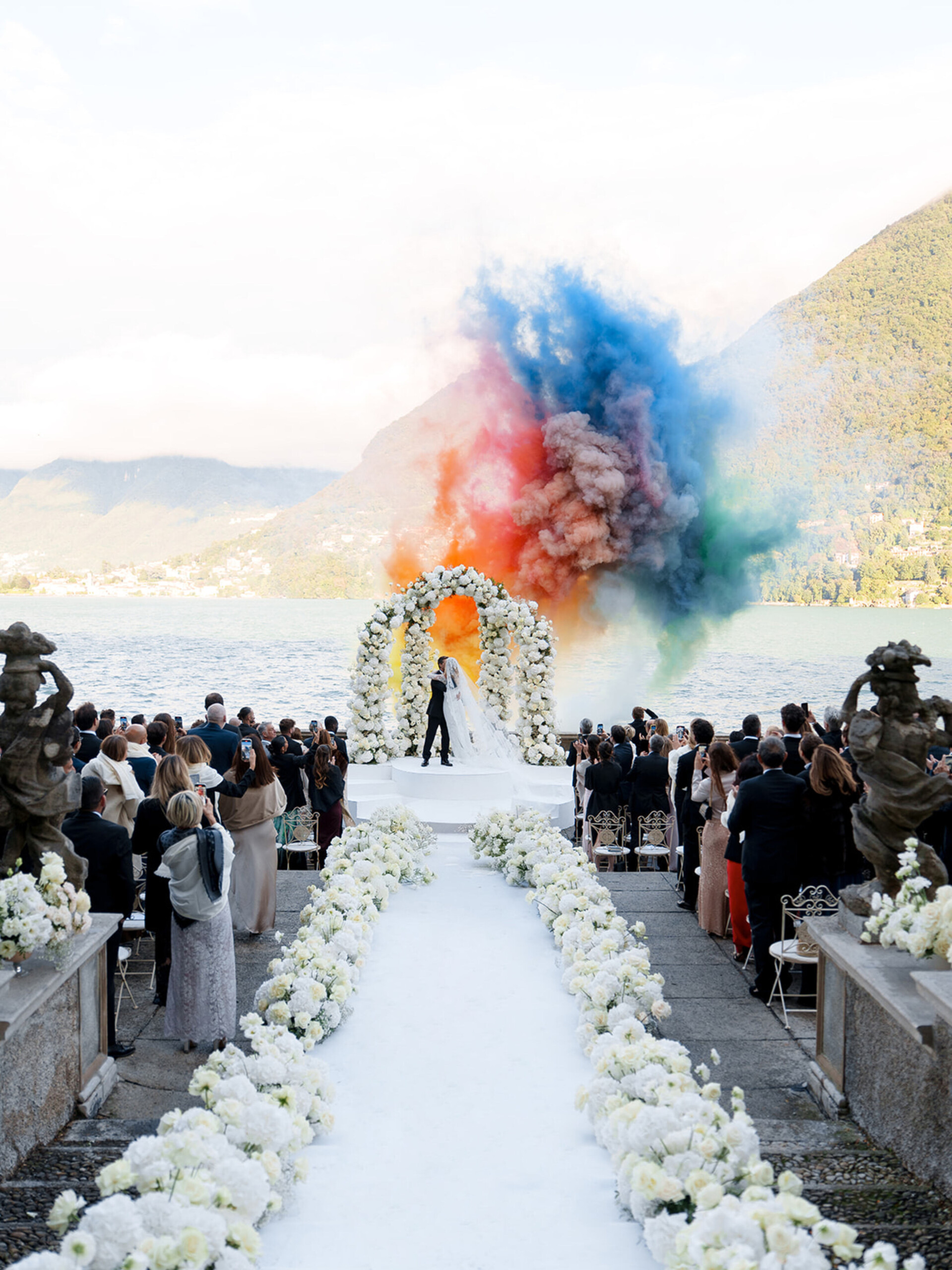 The ceremony took place on Villa Pizzo’s lakeside terrace, framed by a white floral arch and softly layered blooms. Violinists performed contemporary classical arrangements as guests arrived, setting a chic, modern tone. When Mathilde and Dylan exchanged vows, color-burst fireworks lit the sky – a vibrant, artistic display that replaced traditional pyrotechnics with a refined