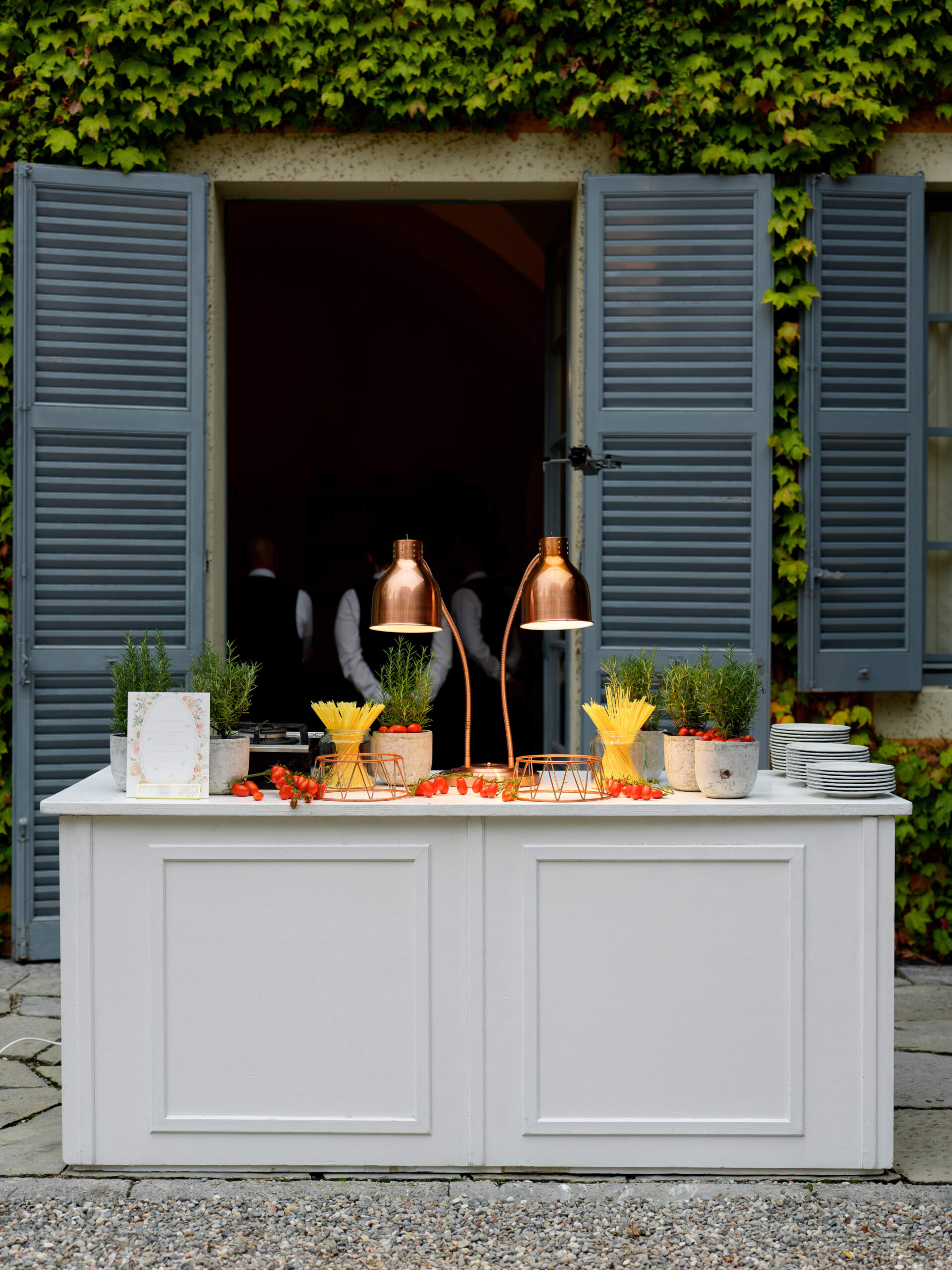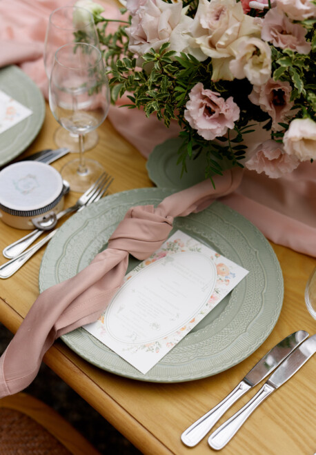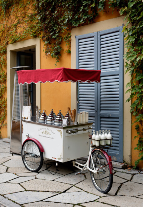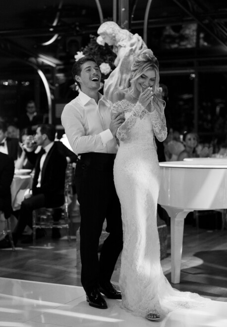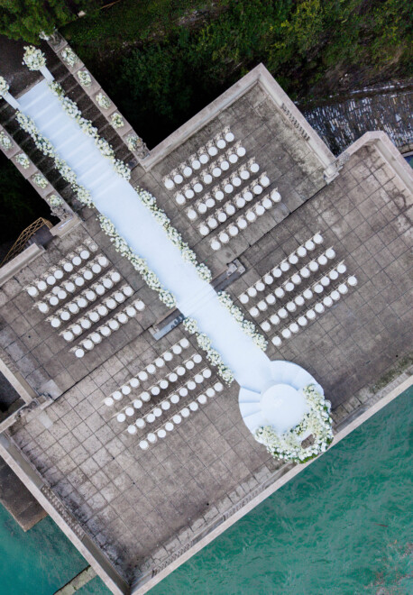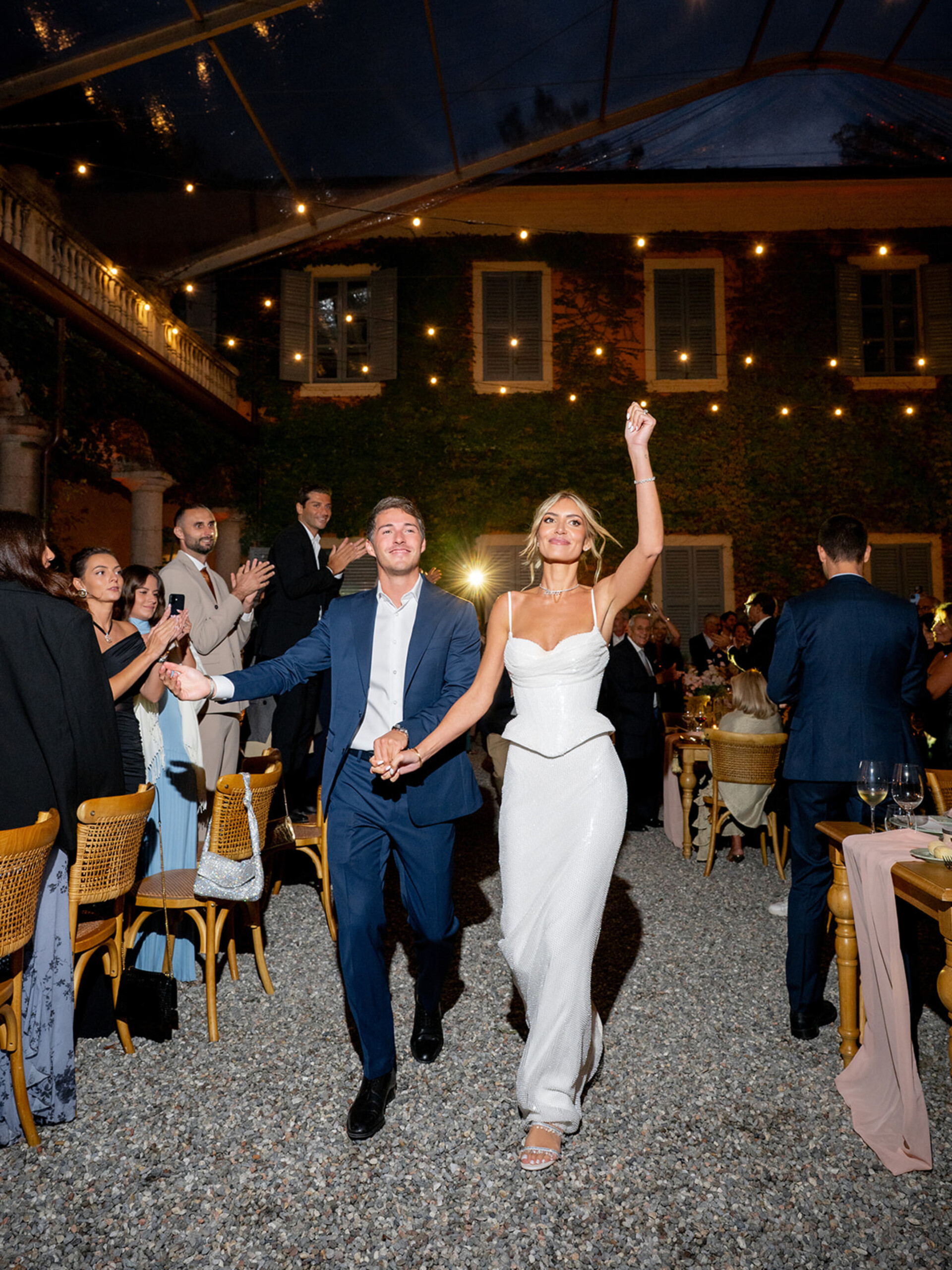 The ceremony took place on Villa Pizzo’s lakeside terrace, framed by a white floral arch and softly layered blooms. Violinists performed contemporary classical arrangements as guests arrived, setting a chic, modern tone. When Mathilde and Dylan exchanged vows, color-burst fireworks lit the sky – a vibrant, artistic display that replaced traditional pyrotechnics with a refined