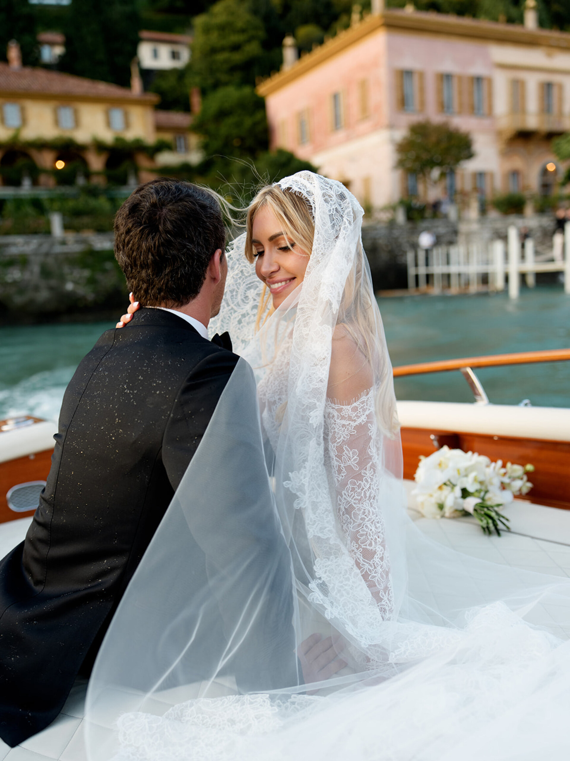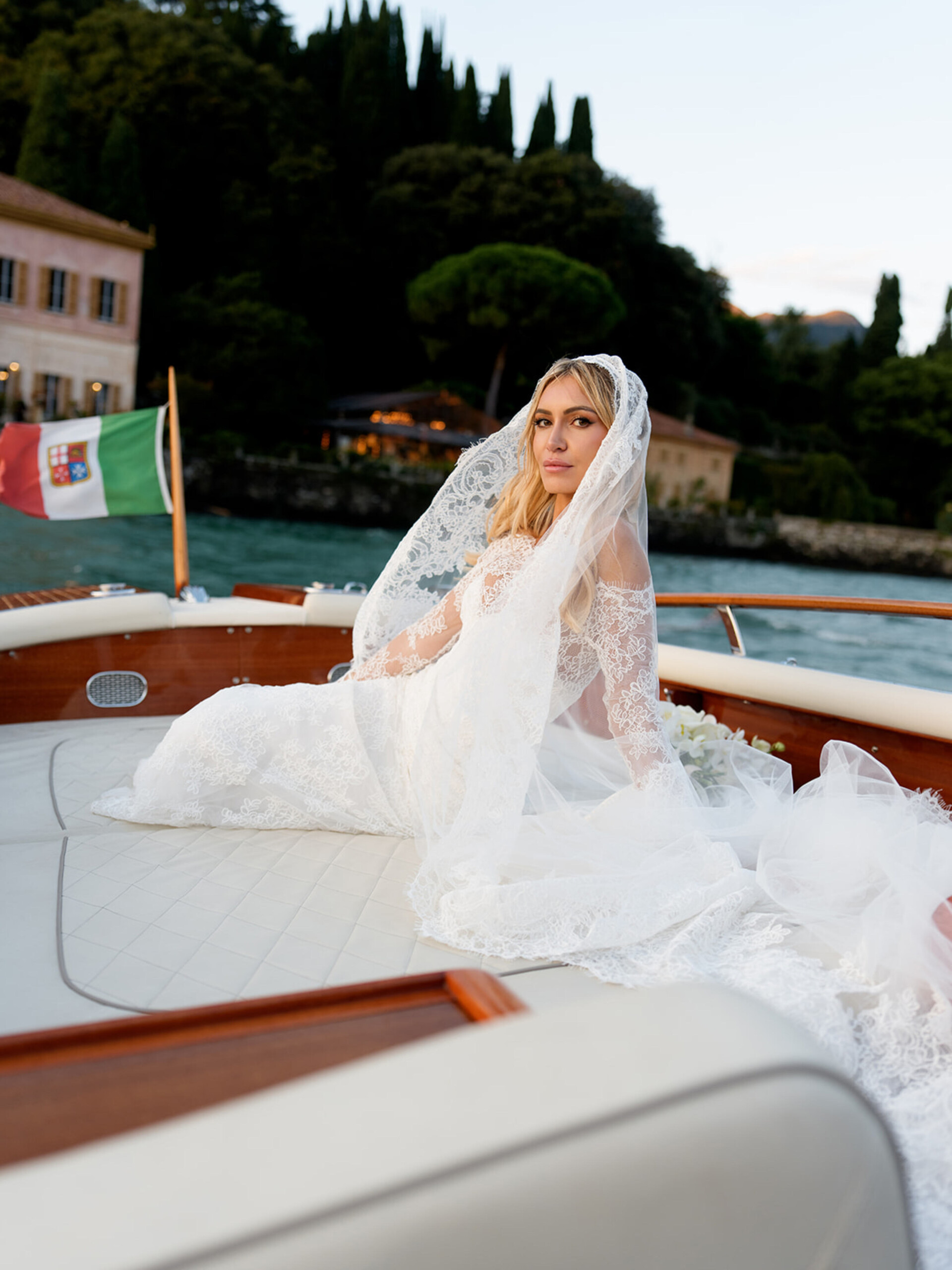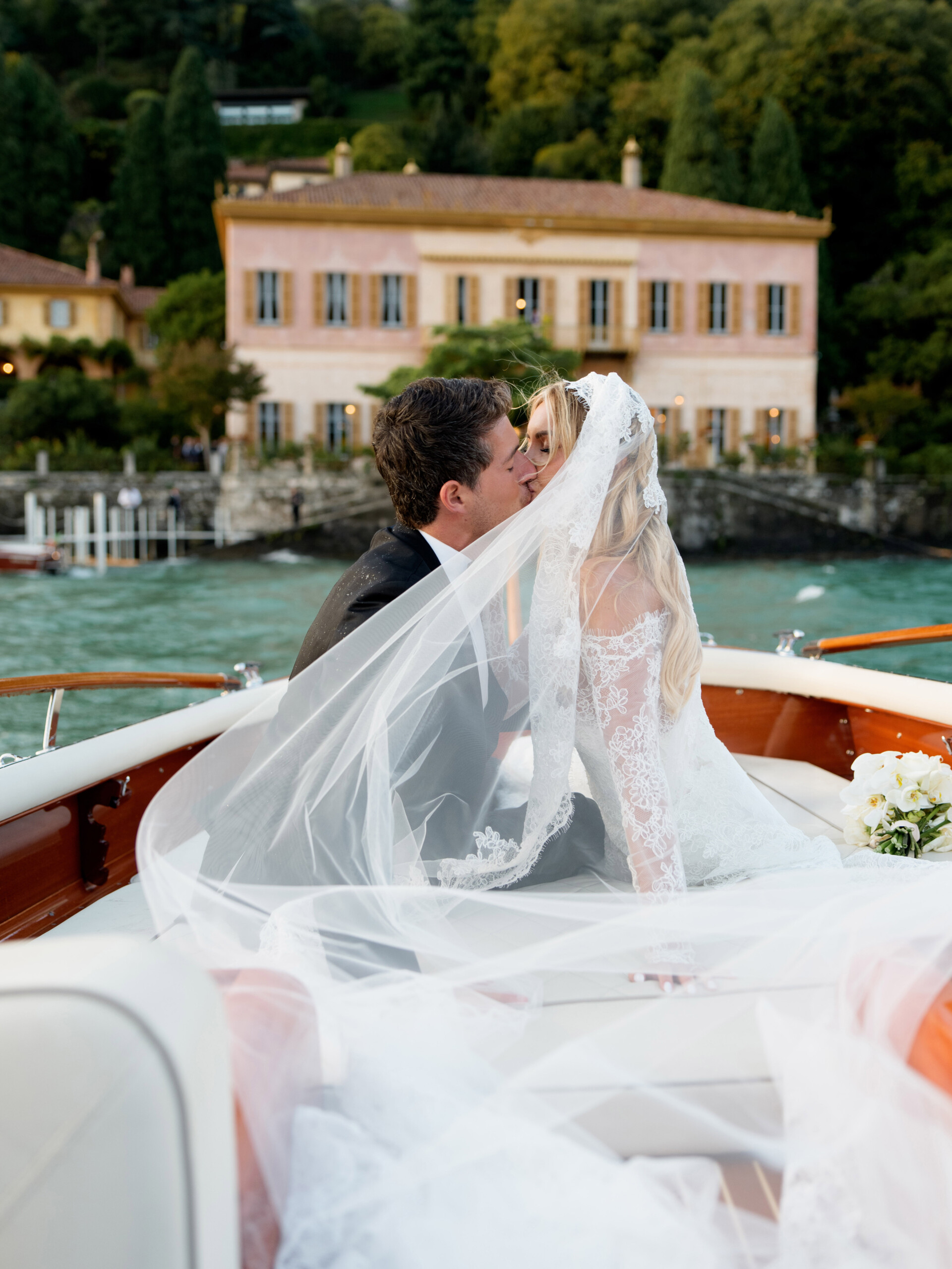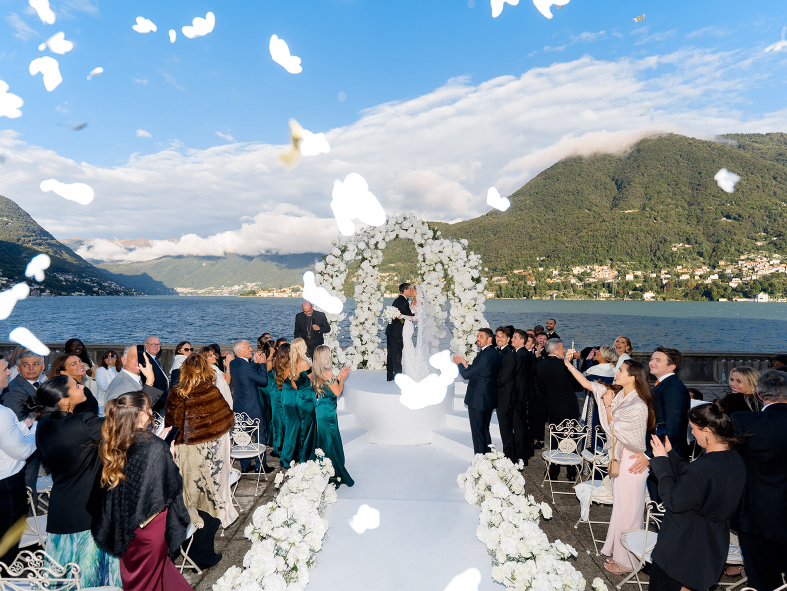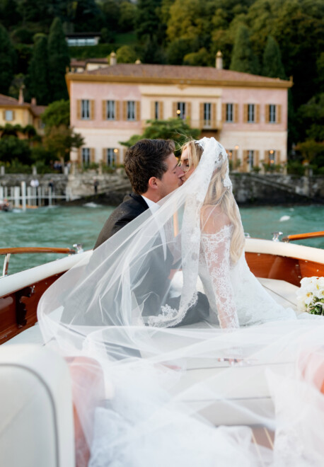 explosion of color, creating a dramatic moment without compromising elegance. Right after the ceremony, the couple boarded a classic wooden boat for a private photo session on Lake Como – a timeless, cinematic escape that captured the essence of luxury Italian romance.