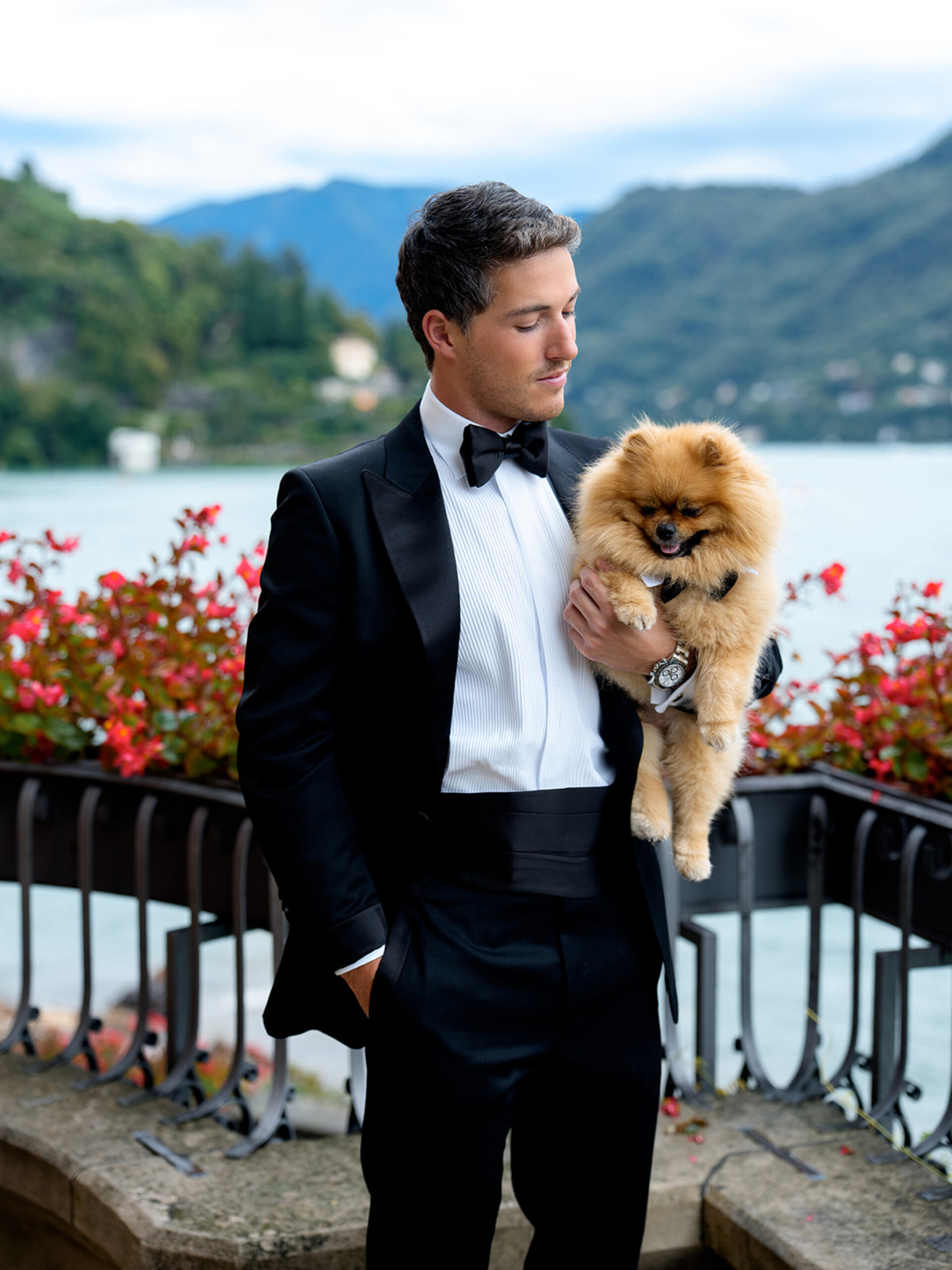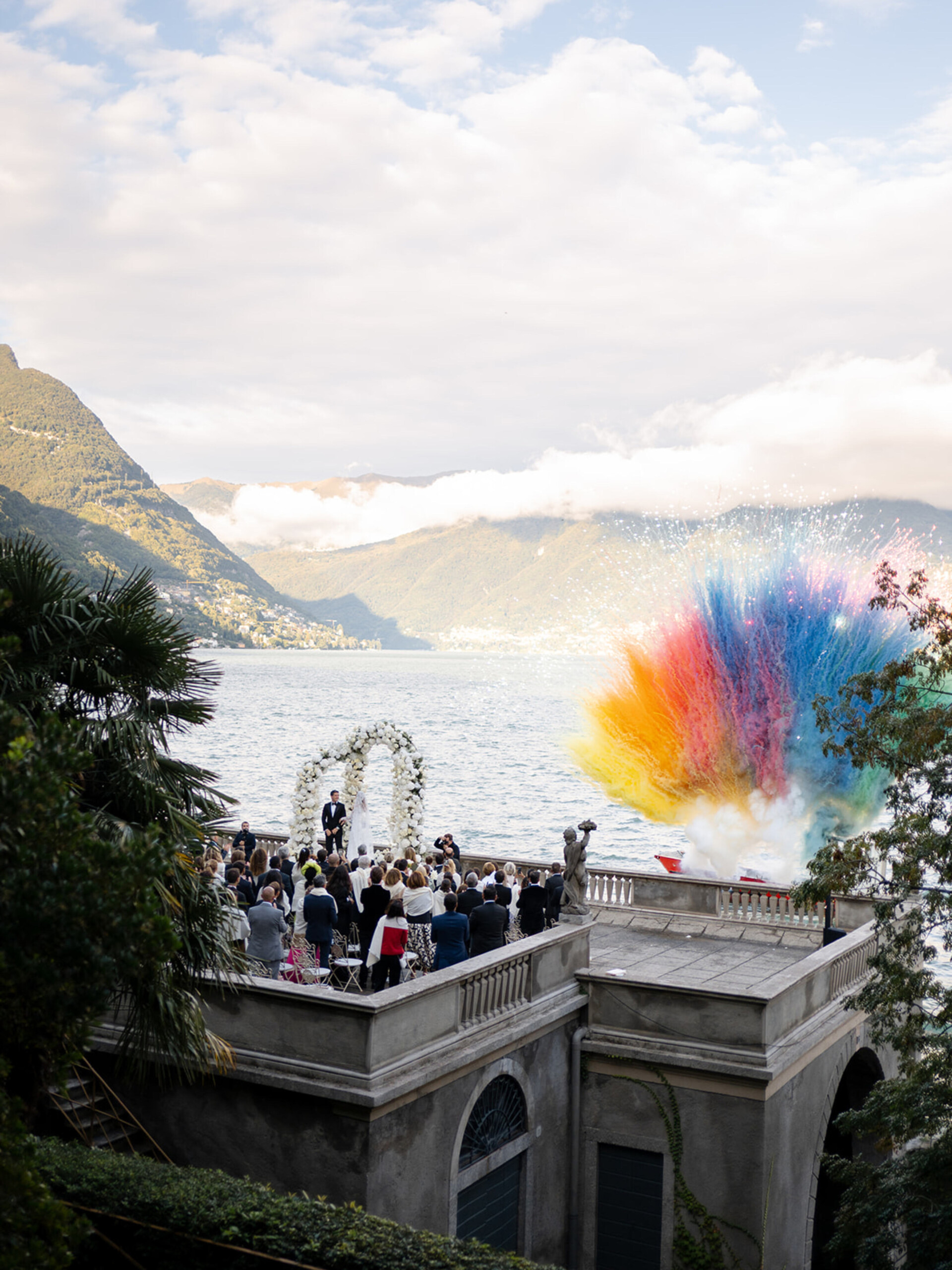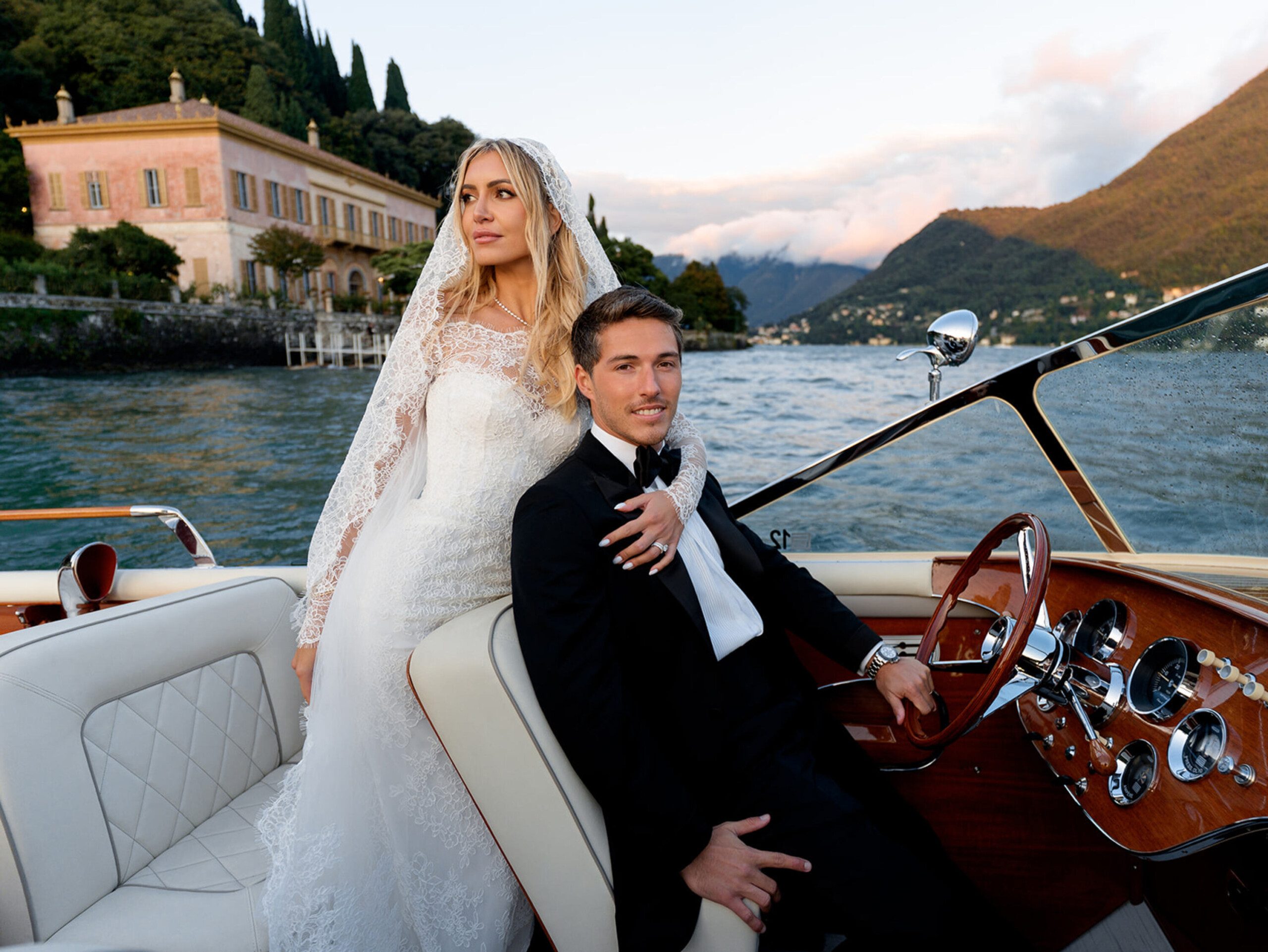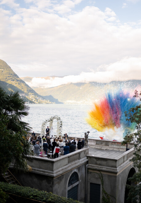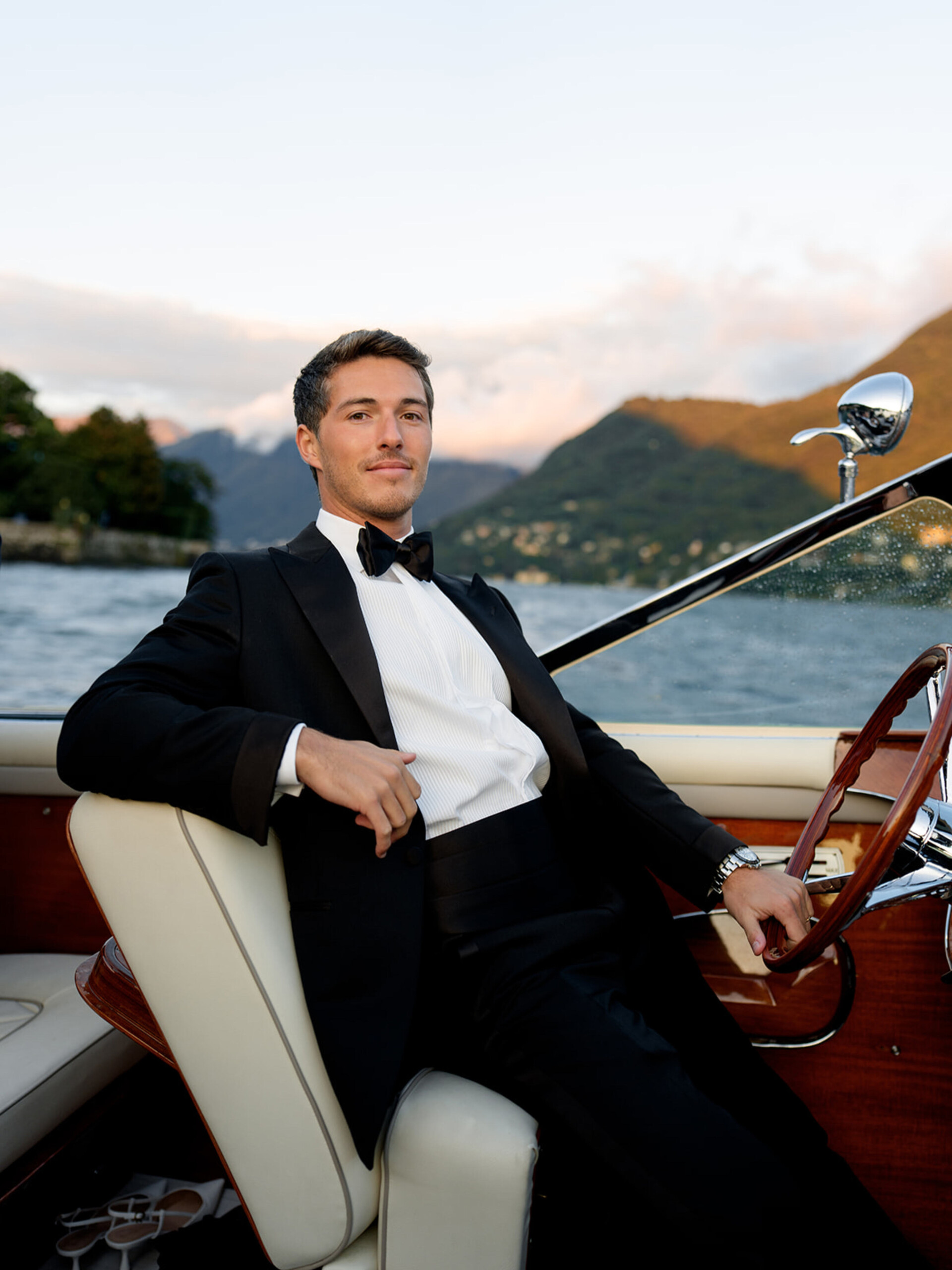 explosion of color, creating a dramatic moment without compromising elegance. Right after the ceremony, the couple boarded a classic wooden boat for a private photo session on Lake Como – a timeless, cinematic escape that captured the essence of luxury Italian romance.