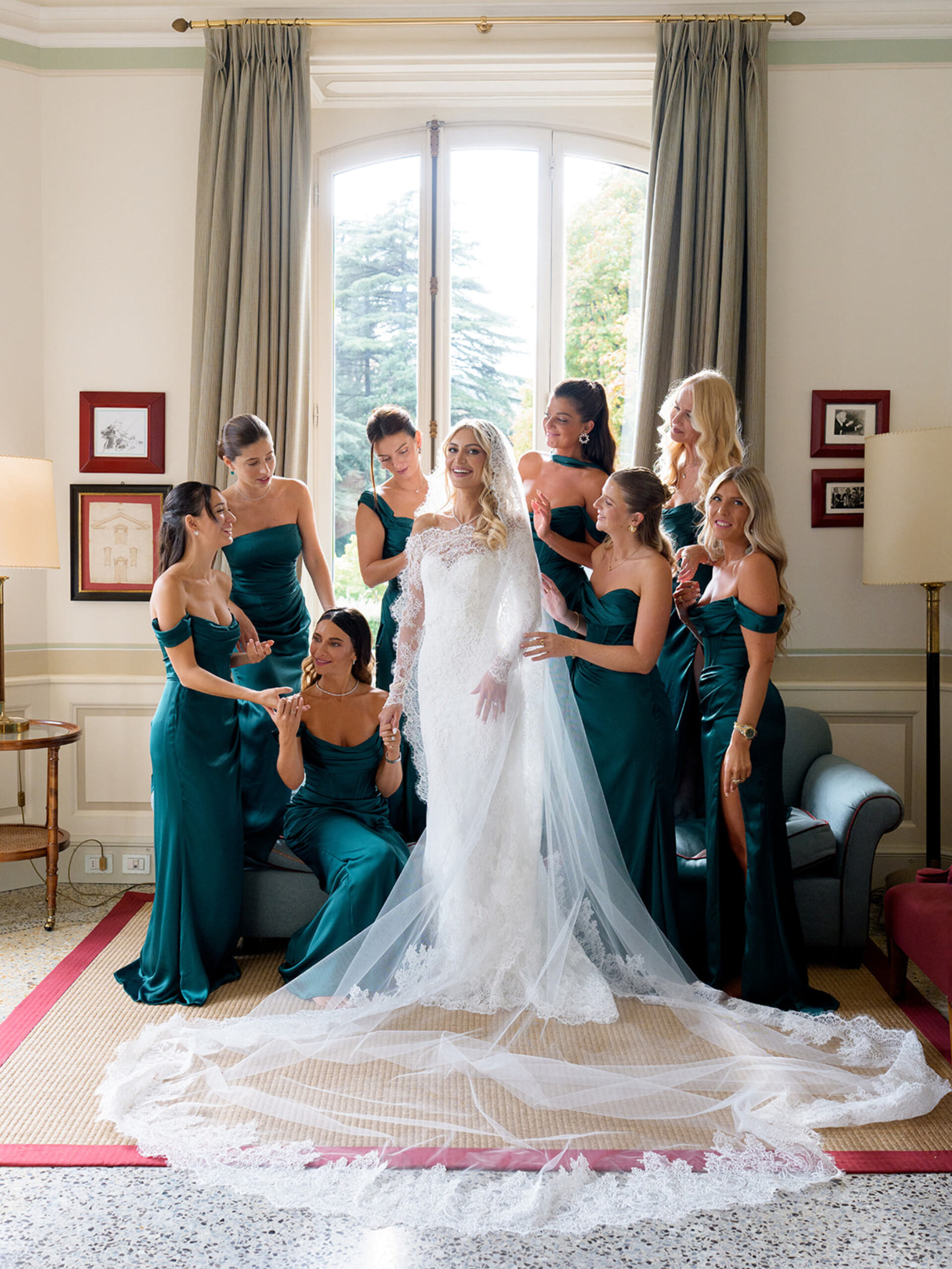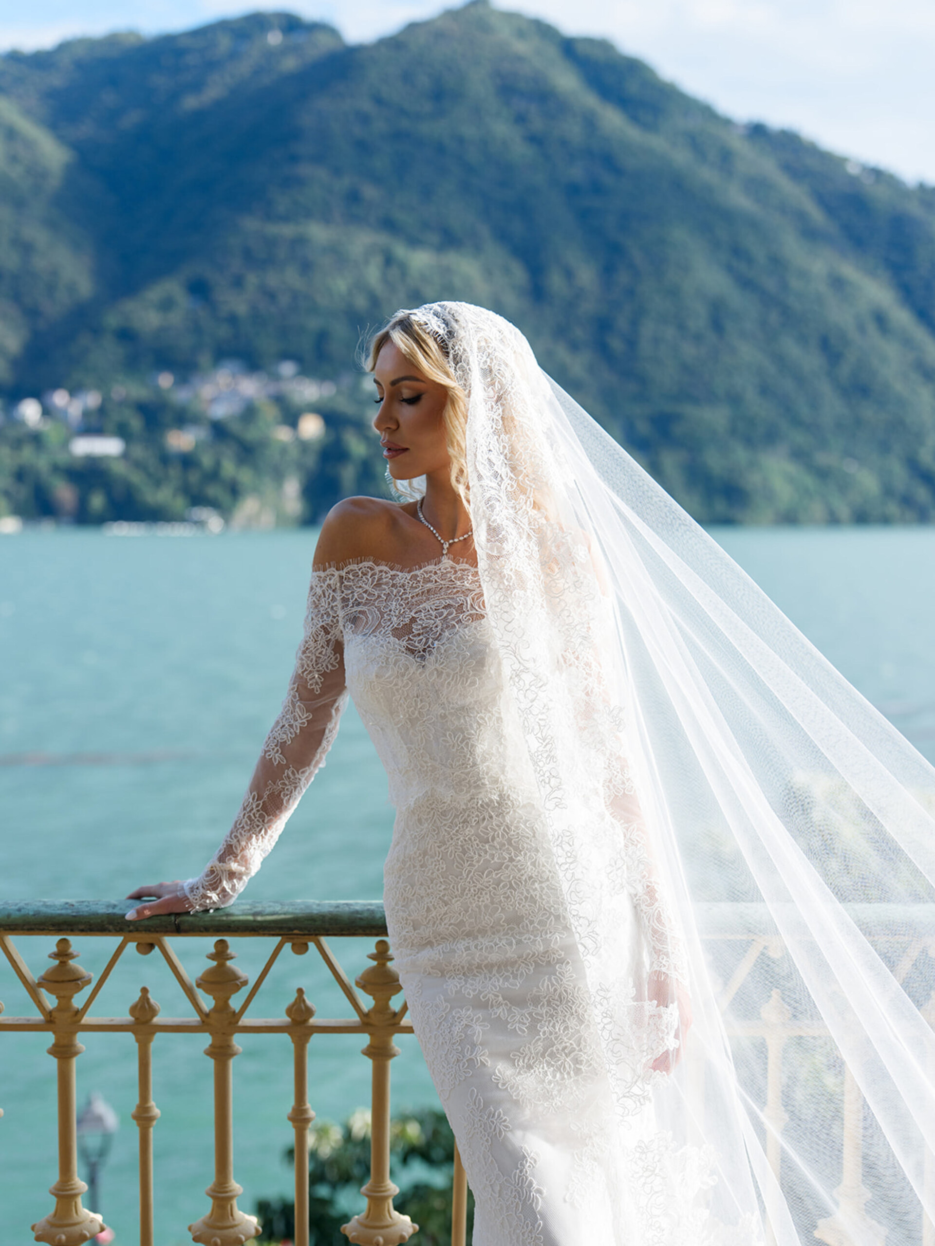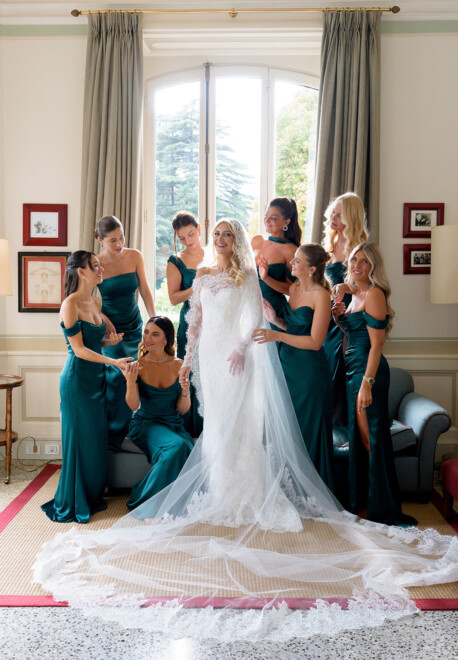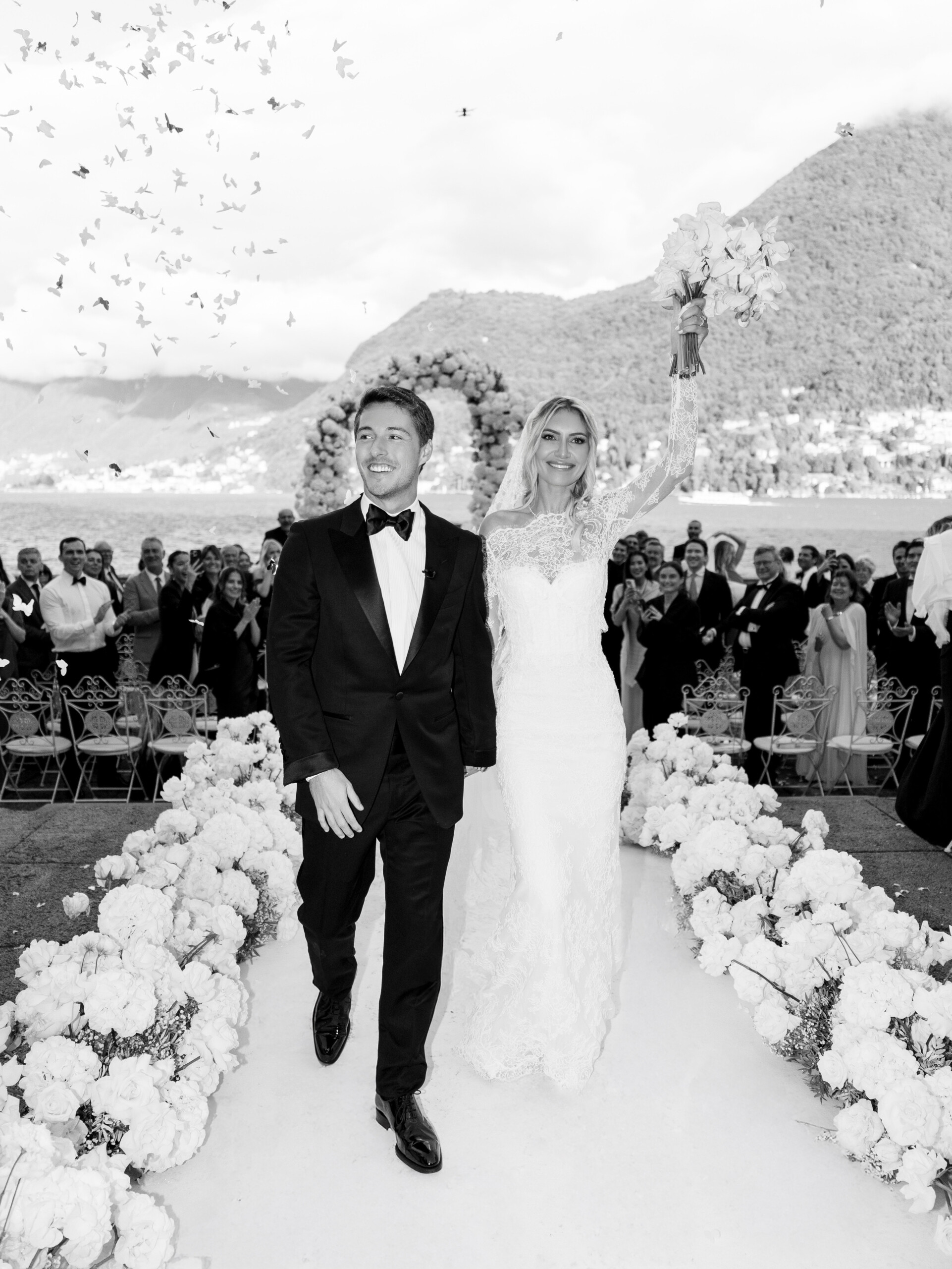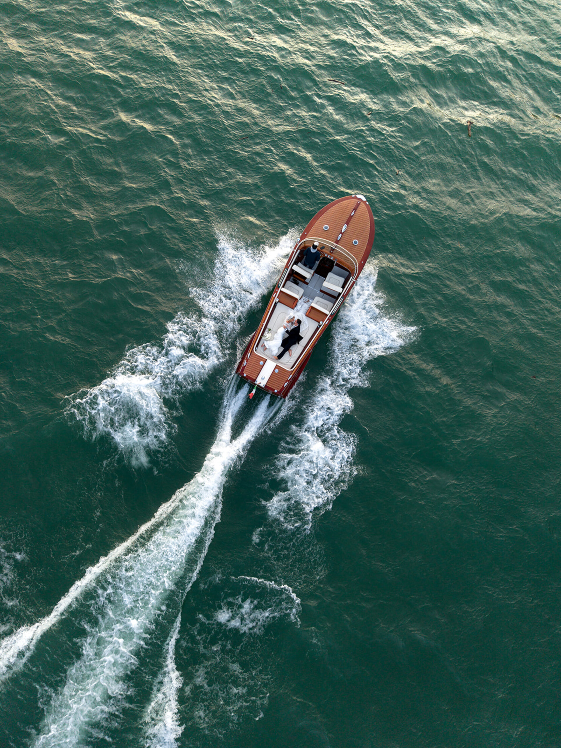 explosion of color, creating a dramatic moment without compromising elegance. Right after the ceremony, the couple boarded a classic wooden boat for a private photo session on Lake Como – a timeless, cinematic escape that captured the essence of luxury Italian romance.