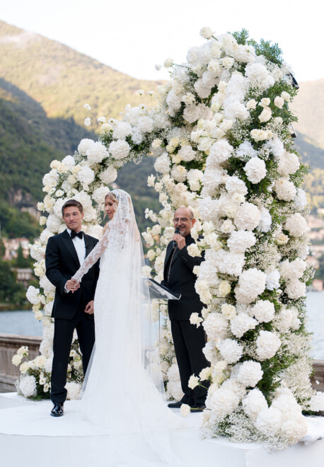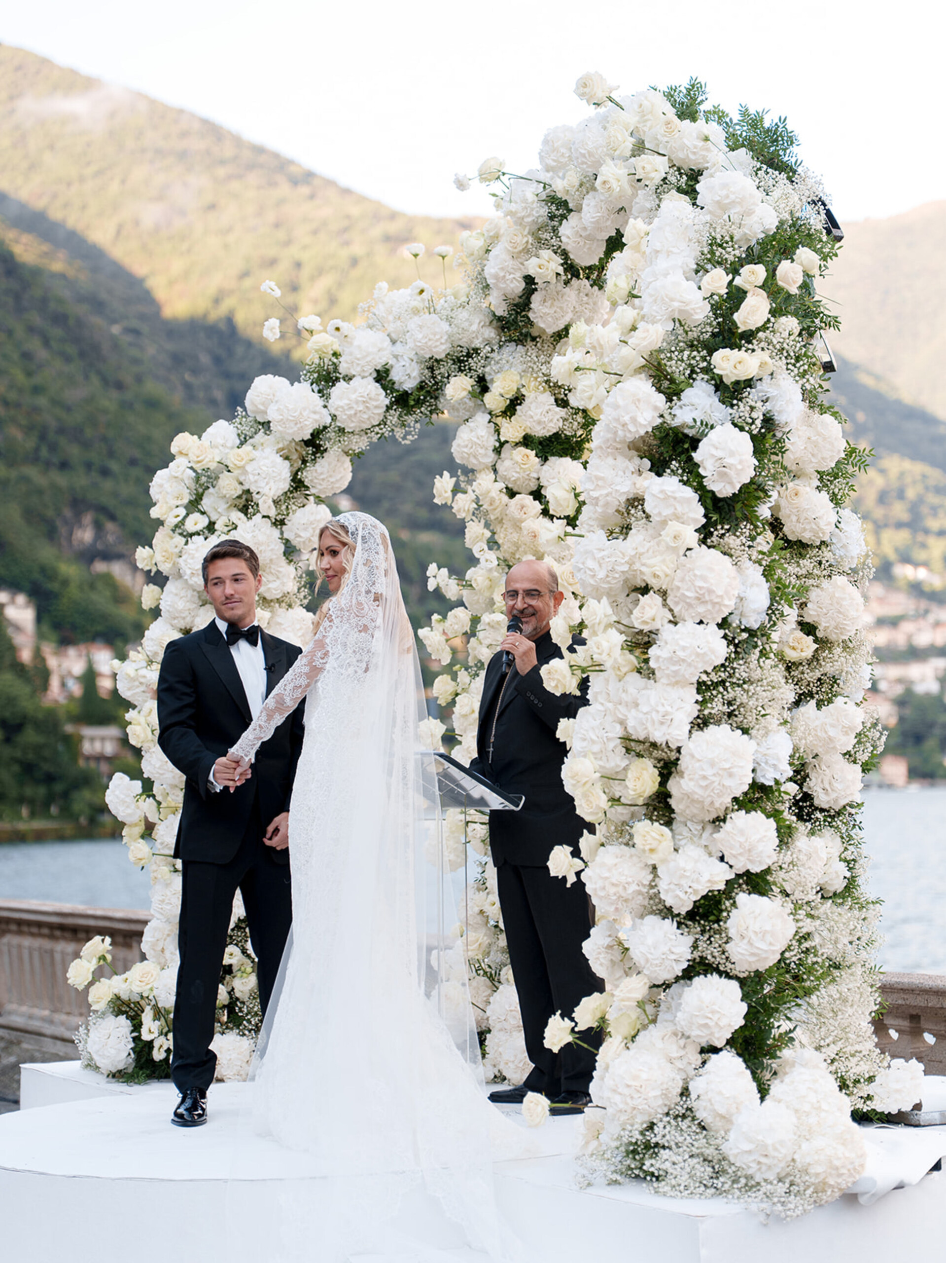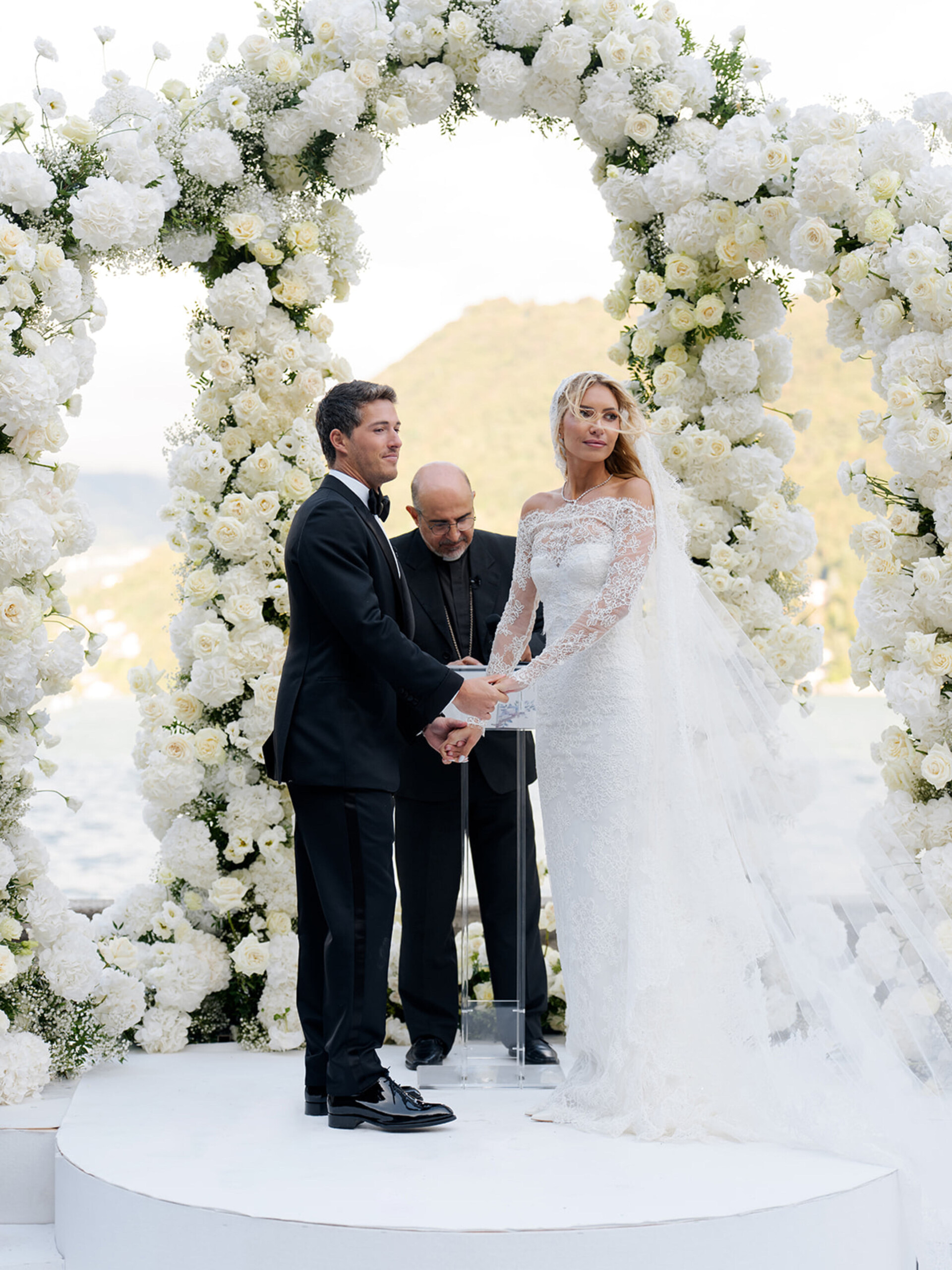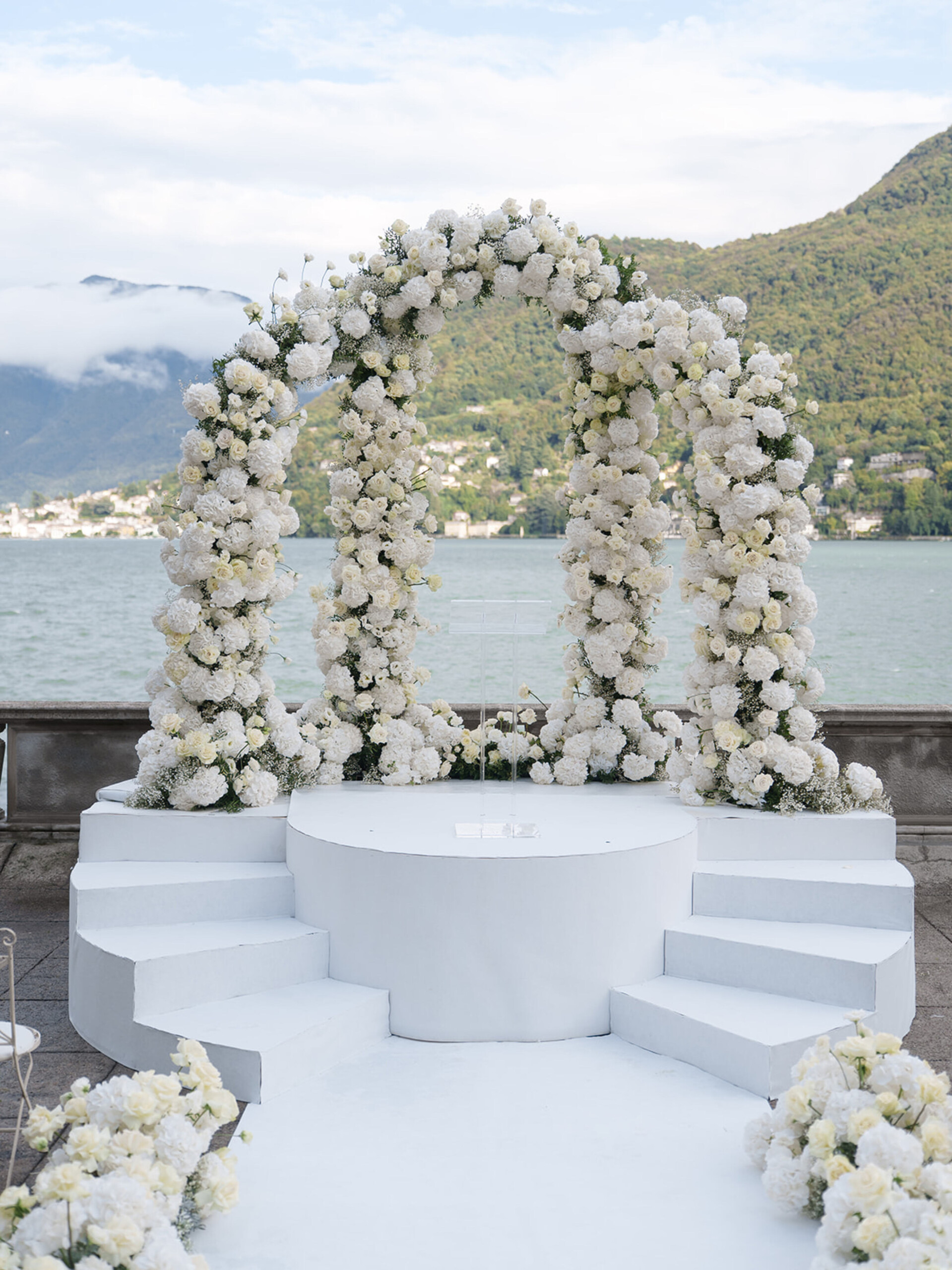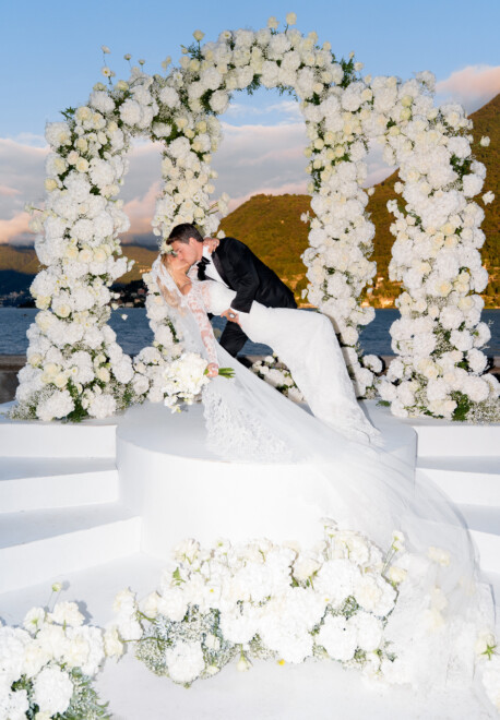 Their wedding at Villa Pizzo unfolded in a palette of pure white blooms, architectural floral columns, and a sophisticated white ceremony arch overlooking the lake.