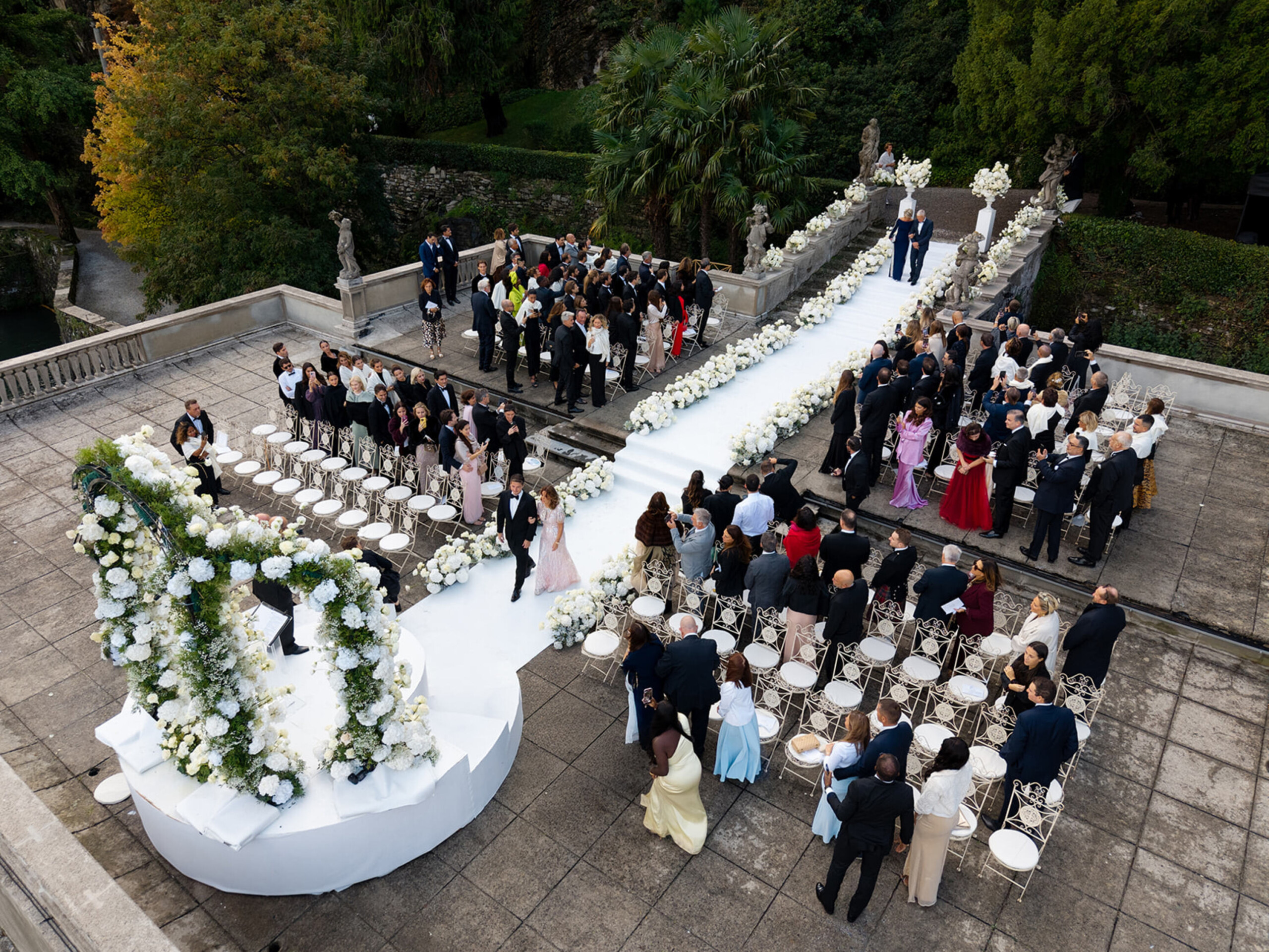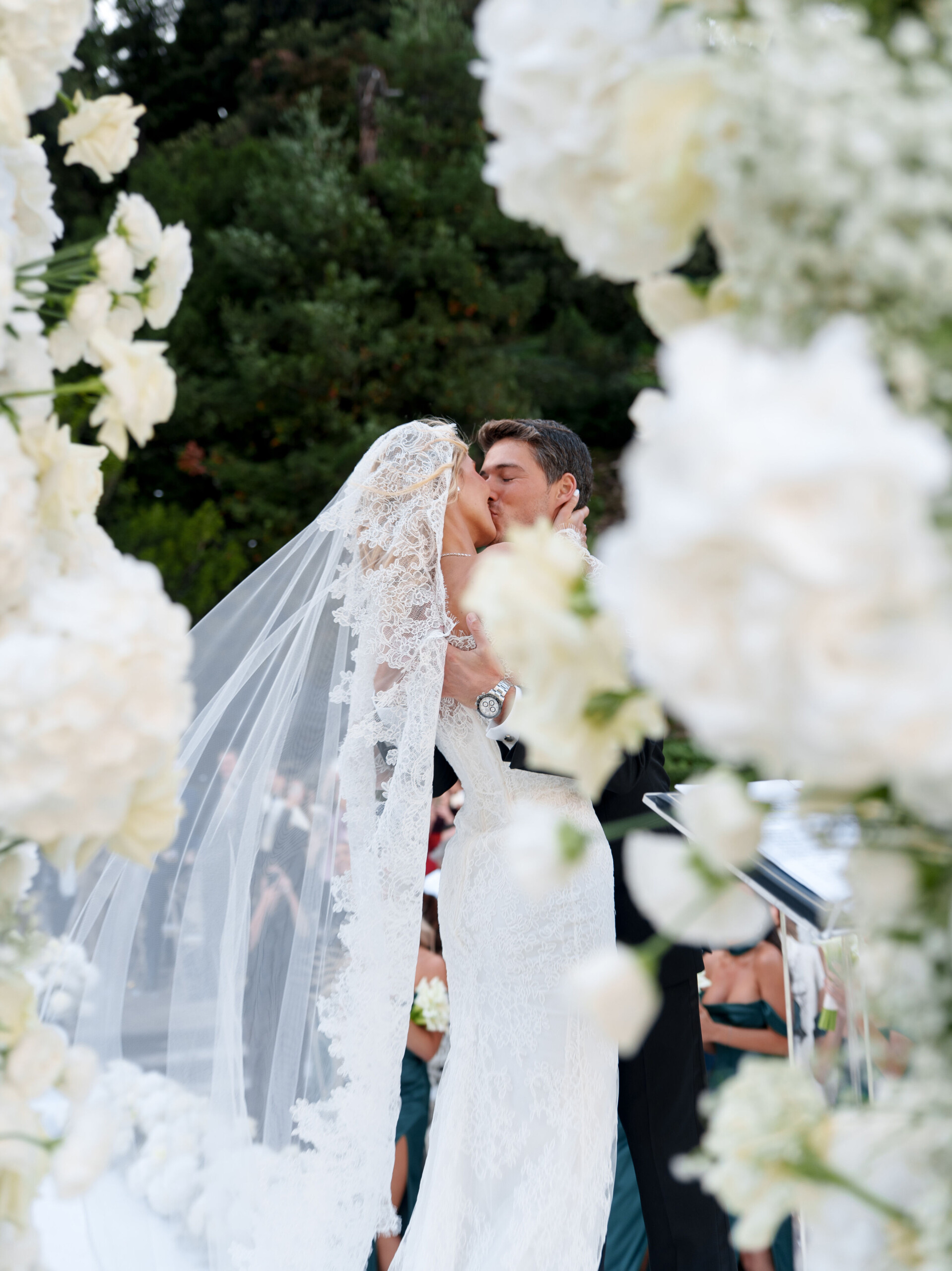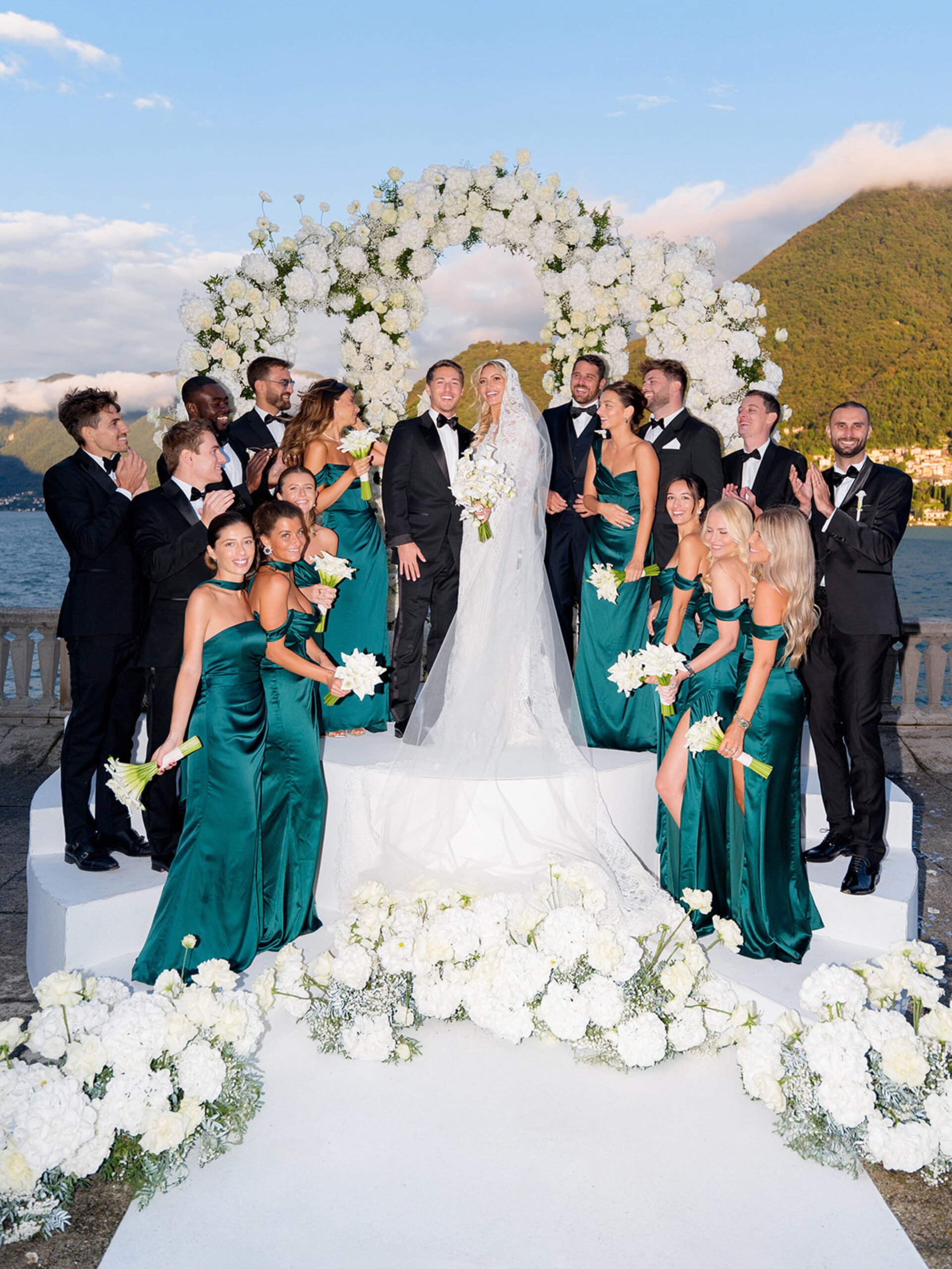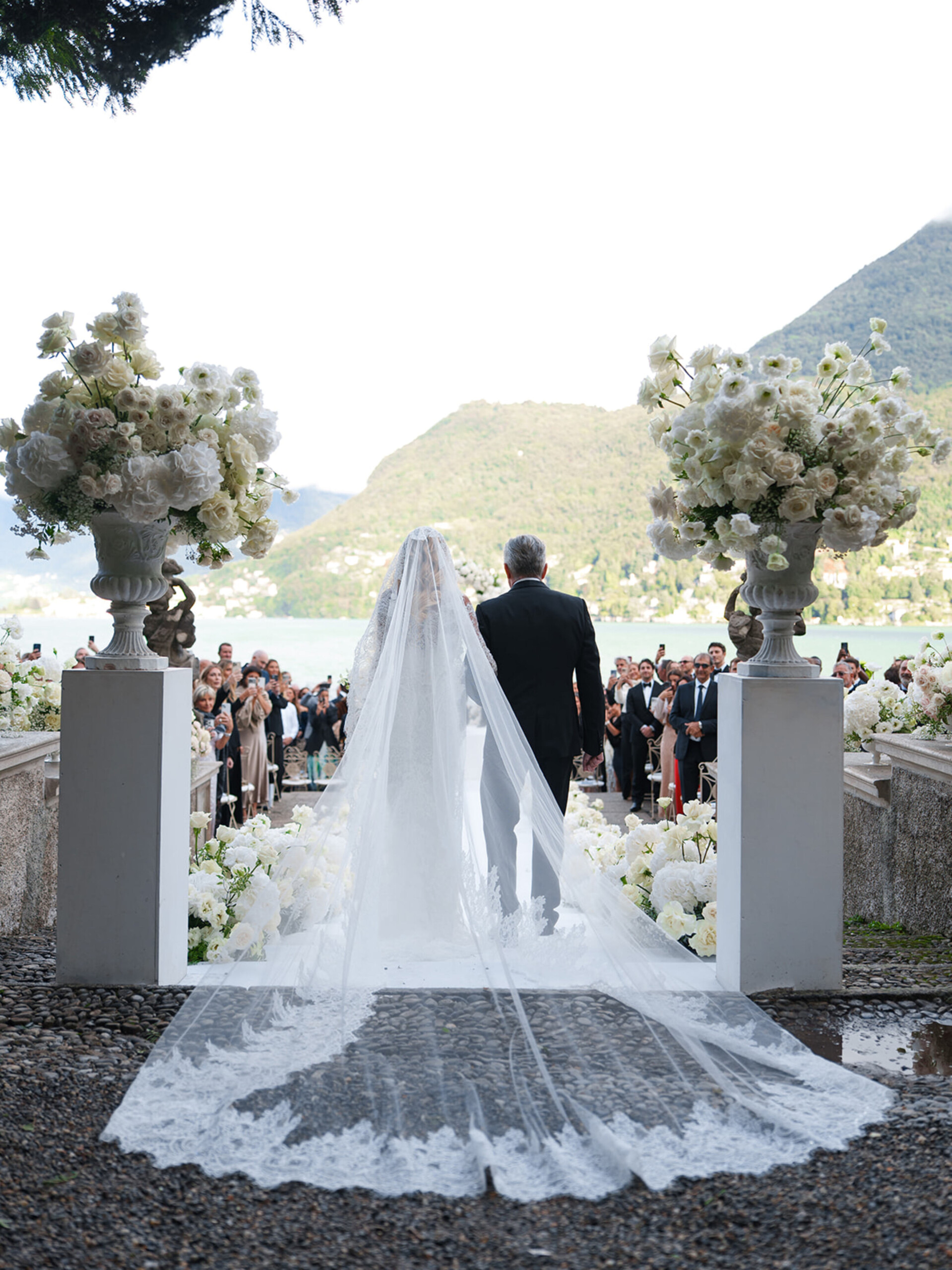 Their wedding at Villa Pizzo unfolded in a palette of pure white blooms, architectural floral columns, and a sophisticated white ceremony arch overlooking the lake.