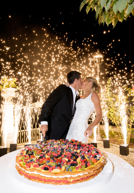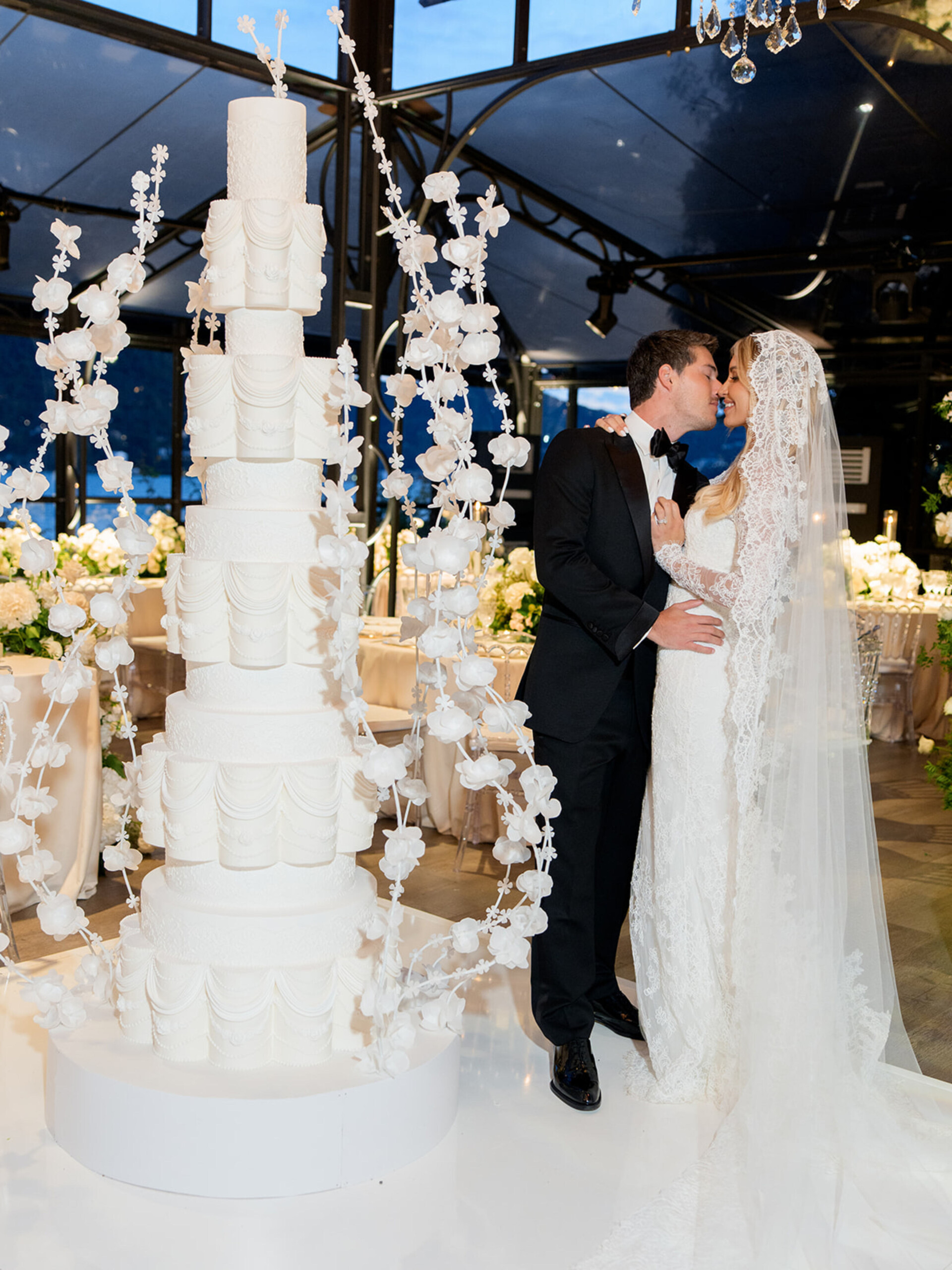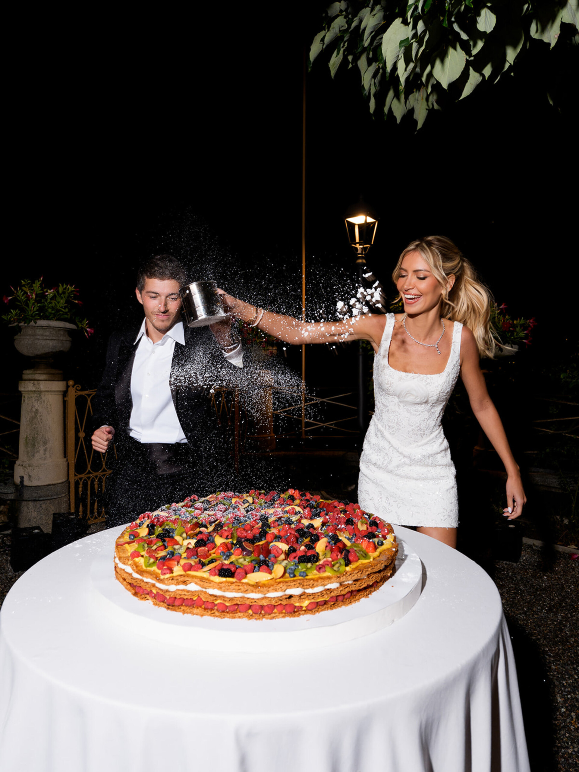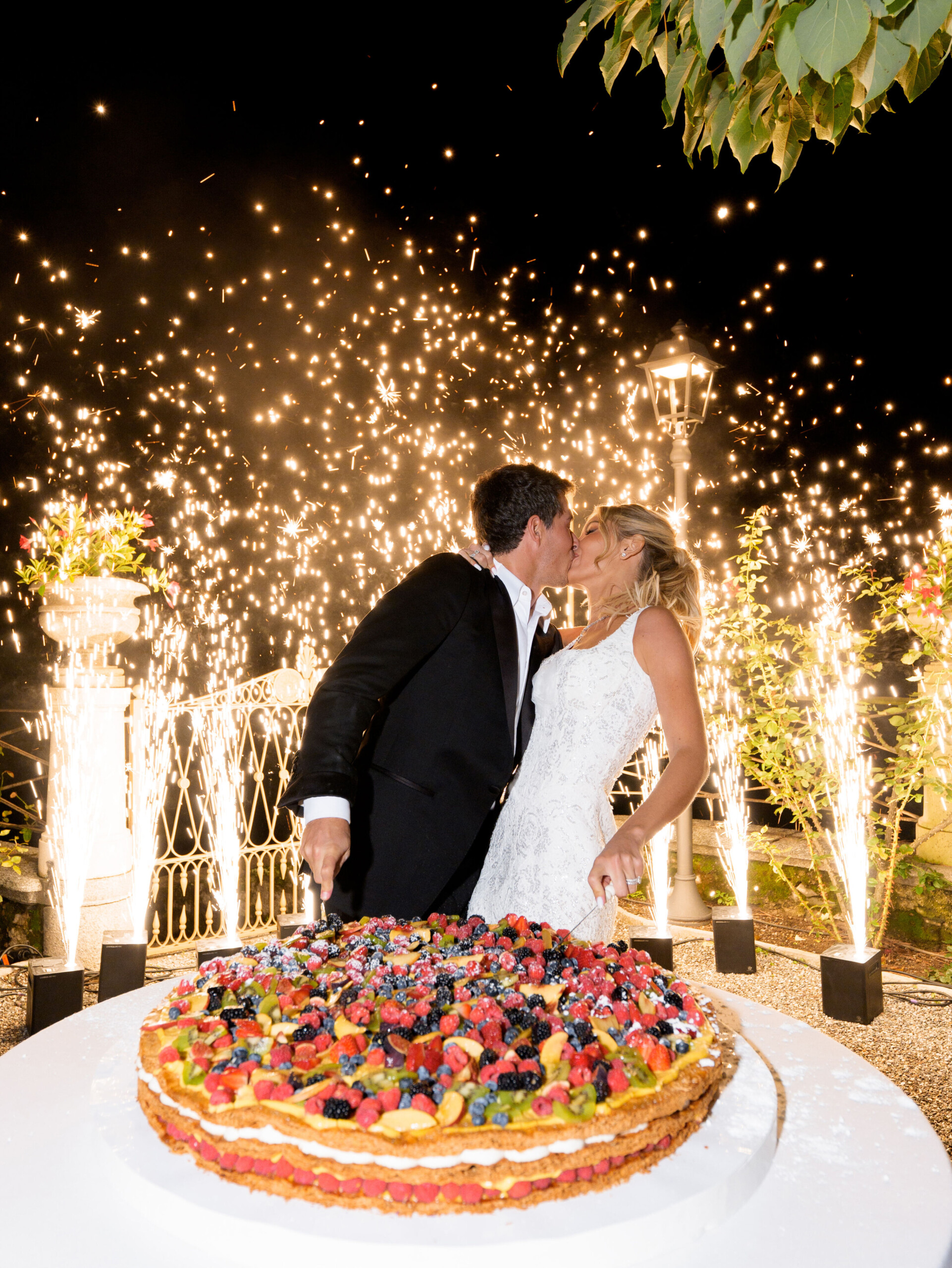 The first cake – a towering, extravagant design with cascading petals – acted as a statement piece and reflected the wedding’s elevated style. Later in the evening, the couple cut their second cake, a millefoglie with fresh berries, surrounded by guests as sparkling fireworks illuminated the waterfront behind them. It felt theatrical yet tasteful – a perfect apex to the celebration.