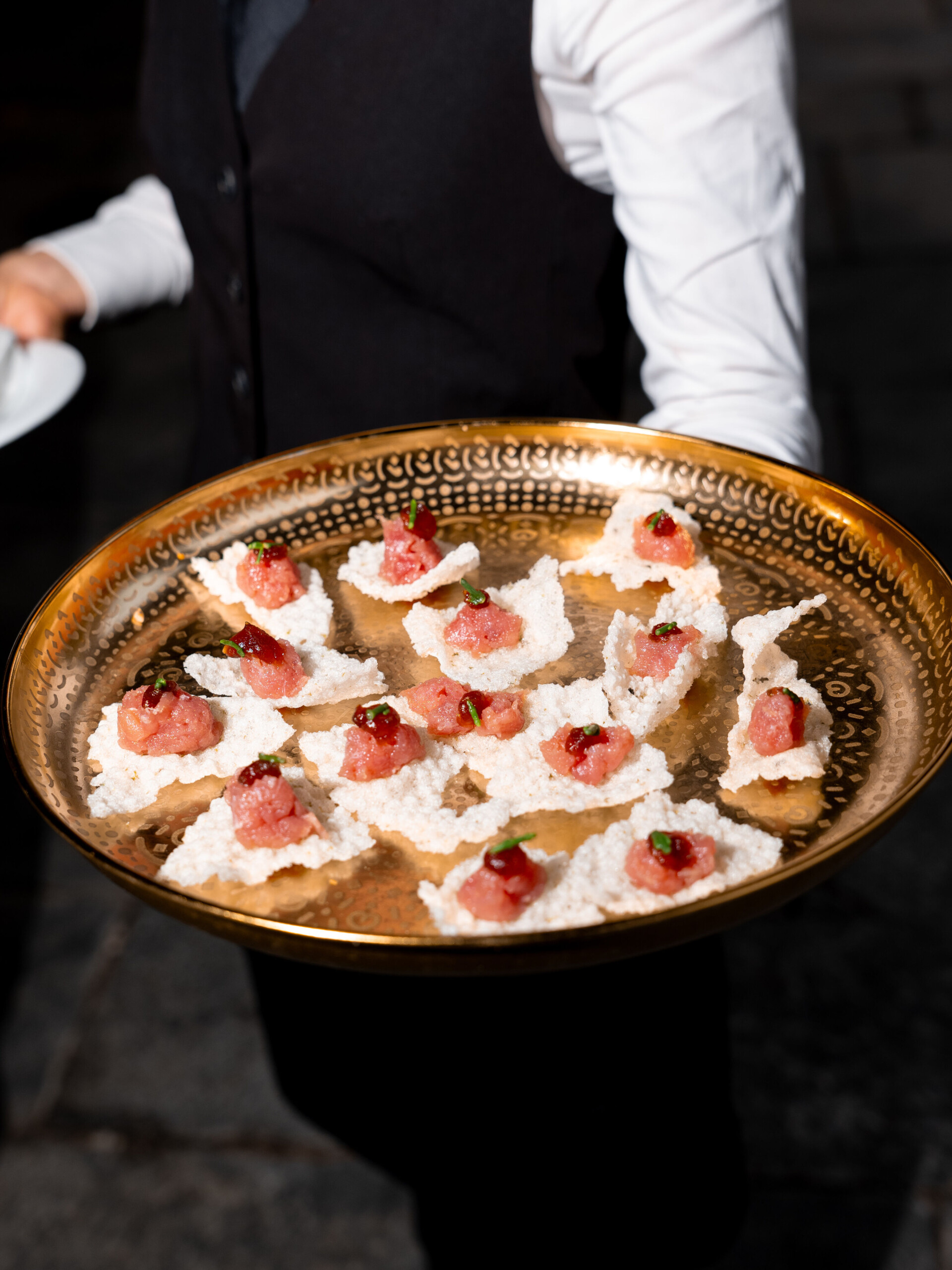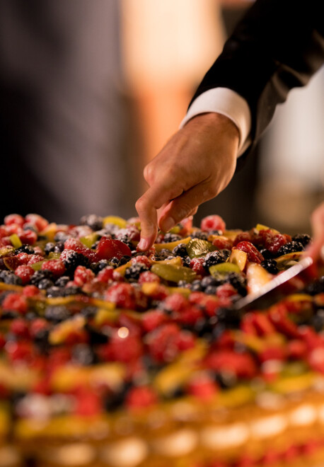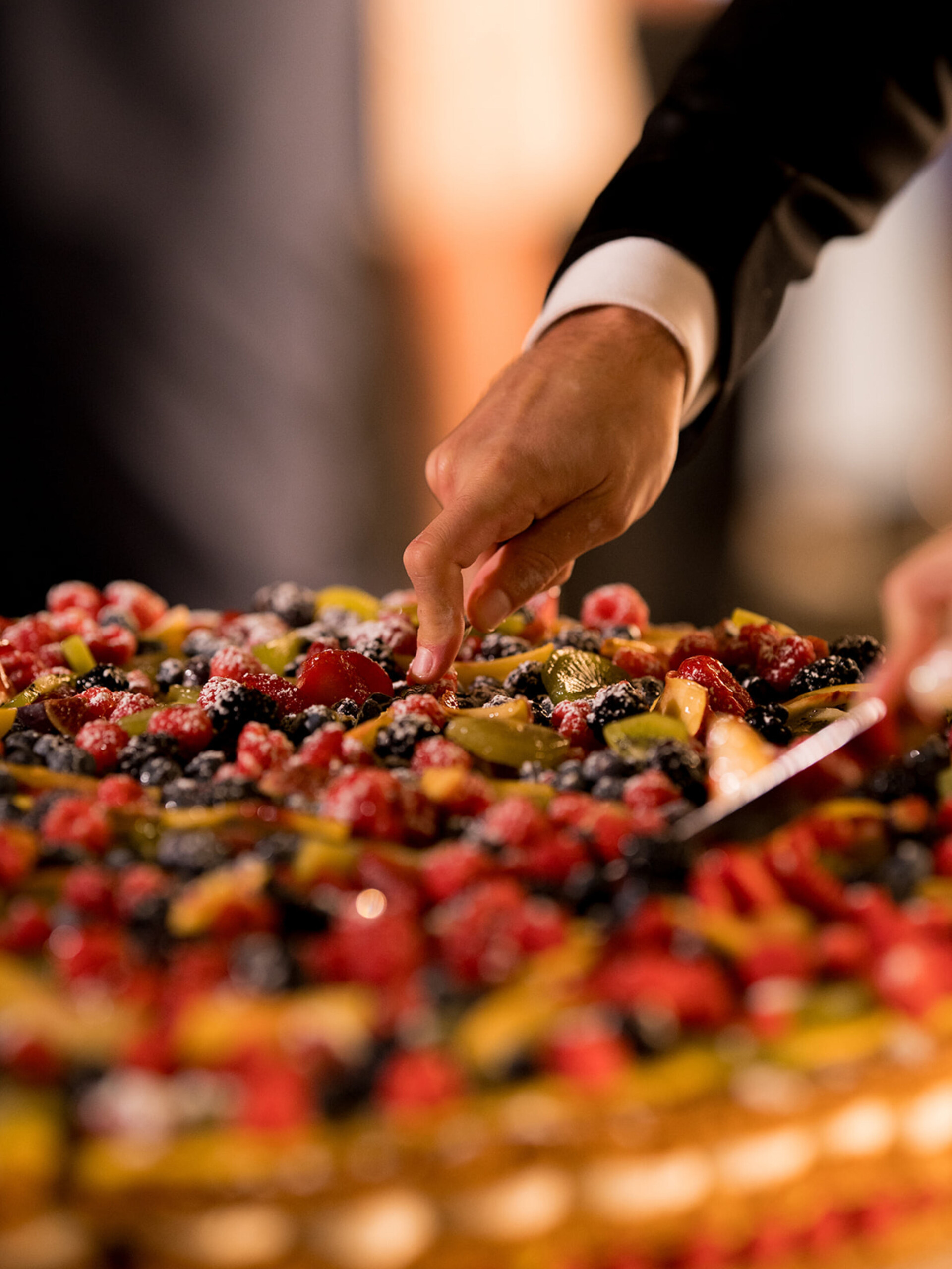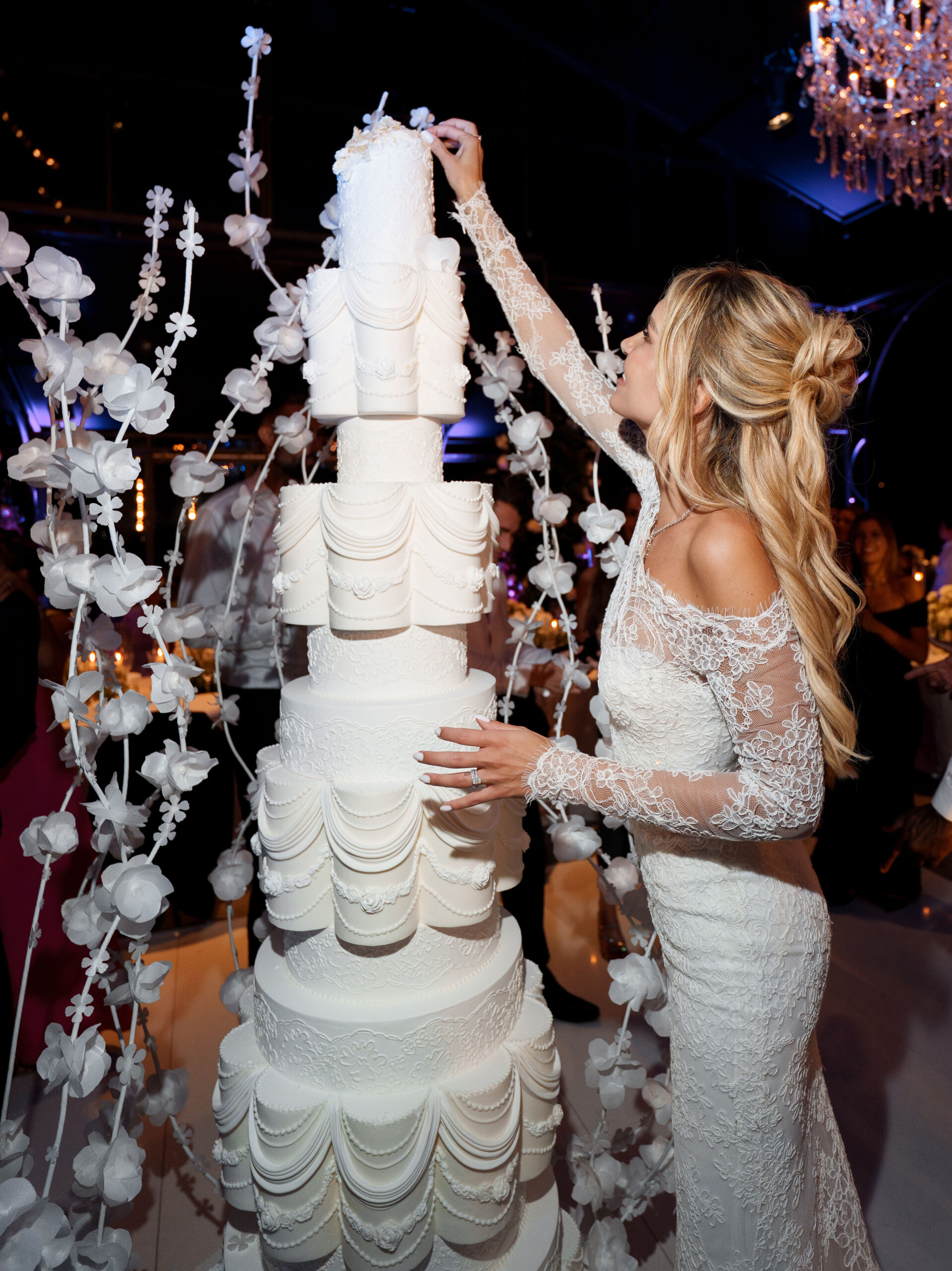 The first cake – a towering, extravagant design with cascading petals – acted as a statement piece and reflected the wedding’s elevated style. Later in the evening, the couple cut their second cake, a millefoglie with fresh berries, surrounded by guests as sparkling fireworks illuminated the waterfront behind them. It felt theatrical yet tasteful – a perfect apex to the celebration.