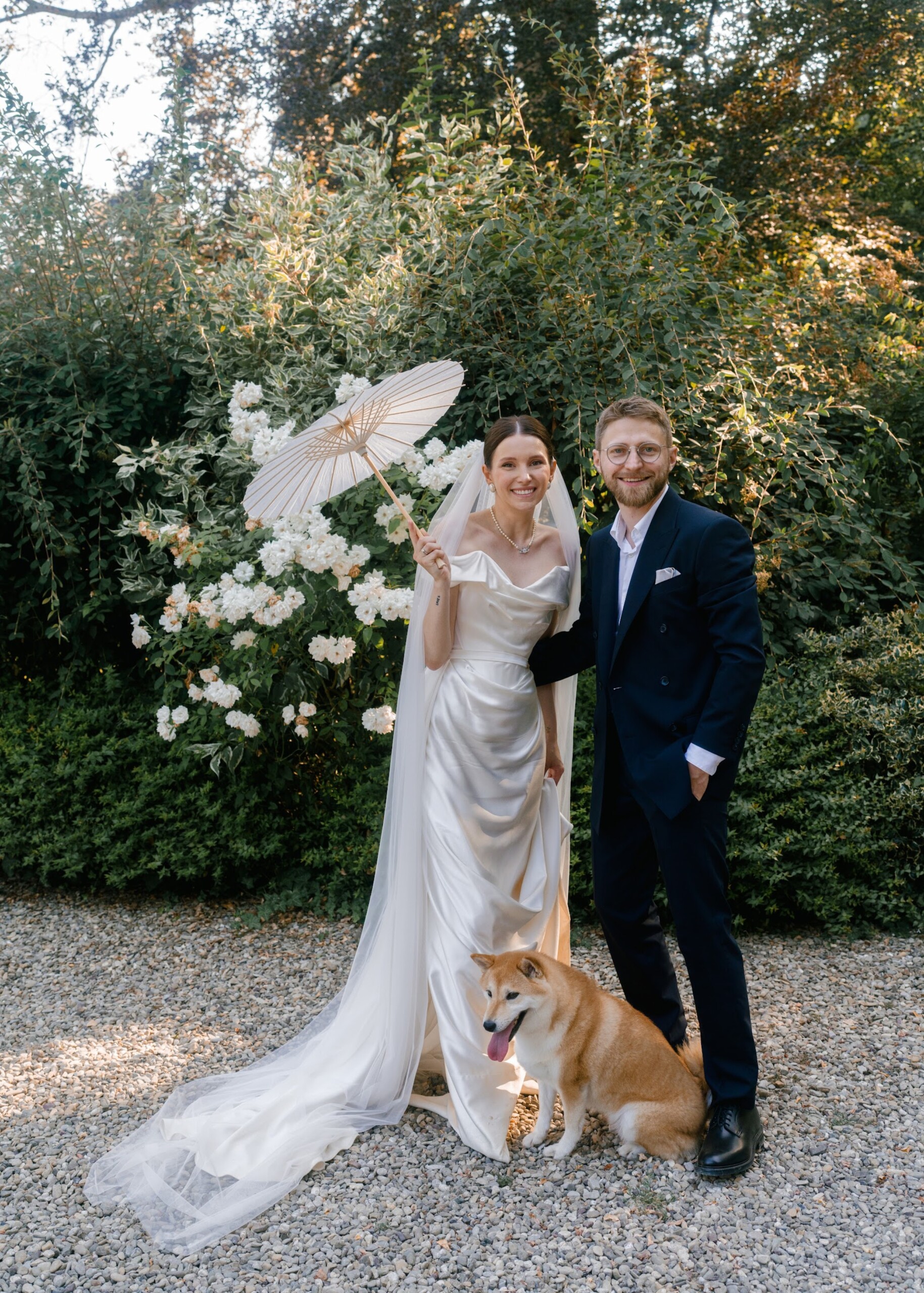 As the sun began to set, the ceremony unfolded on the stone steps of the old Tuscan church, framed by lush florals in shades of blush and ivory. Every detail was thoughtfully arranged, from the florals lining the aisle to the elegant backdrop that perfectly complemented the rustic charm of the setting. Polina walked toward Aleksandr, her presence radiant in the golden light.