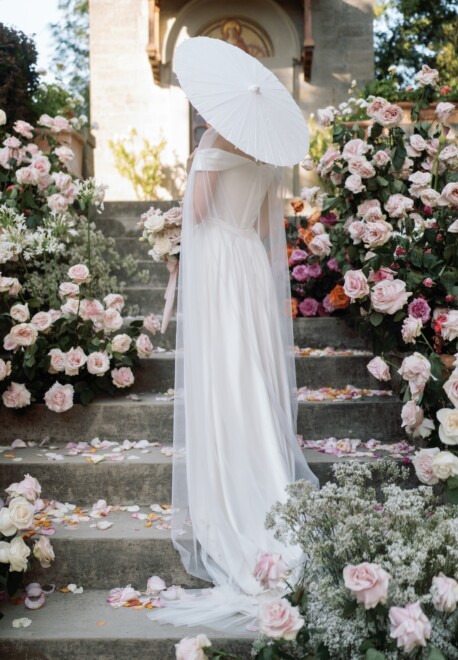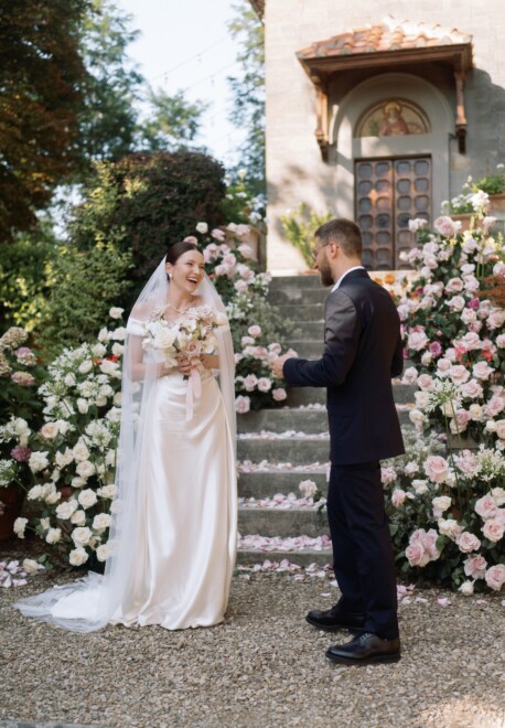 As the sun began to set, the ceremony unfolded on the stone steps of the old Tuscan church, framed by lush florals in shades of blush and ivory. Every detail was thoughtfully arranged, from the florals lining the aisle to the elegant backdrop that perfectly complemented the rustic charm of the setting. Polina walked toward Aleksandr, her presence radiant in the golden light.