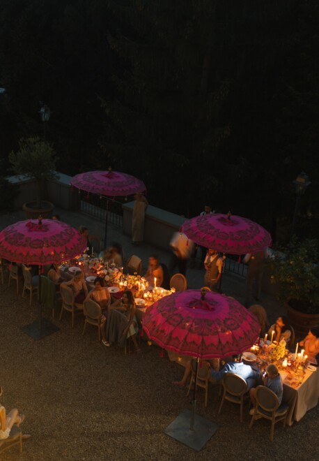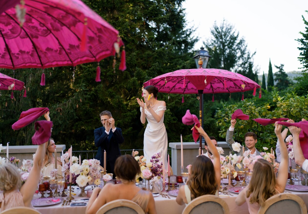 Inspired by the whimsical elegance of The Grand Budapest Hotel, the weekend blended imagination with tradition—room key placeholders adorned dinner tables, pastel umbrellas swayed over lingering conversations, and Polina’s vision of soft pinks and ivory florals tied every detail together with understated grace.