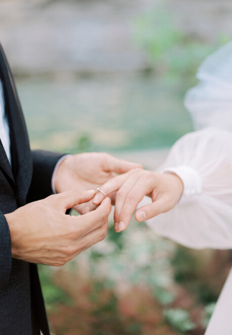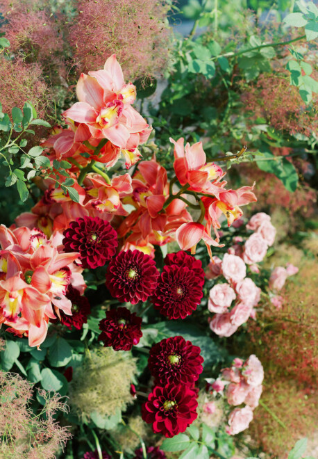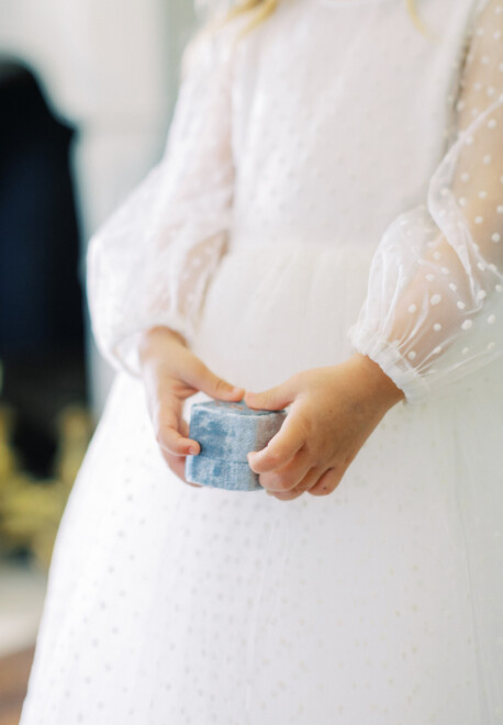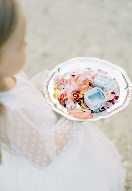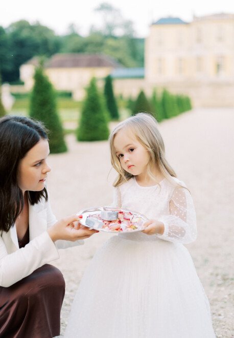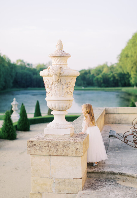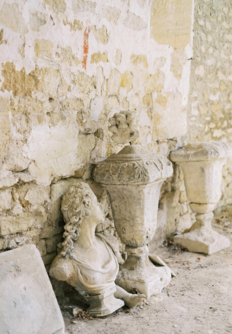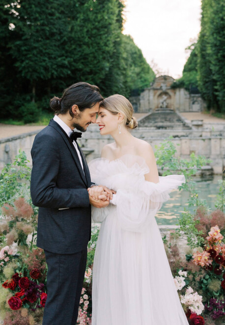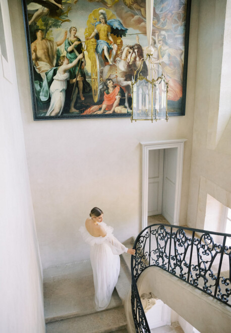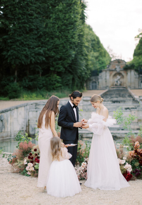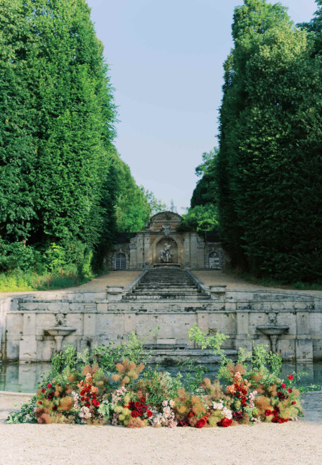 Mègane describes the simple ceremony décor in the garden of the chateau: ‘We didn’t want to spoil a historic view and landscape with any kind of arch or any other high architectural construction and chose to make it a semicircular altar of seasonal flowers and tall green grass.’ Mègane and Bernardo entered together for the ceremony, having already had a civil ceremony the day before. They focused on emotions and their relationship rather than legalities.