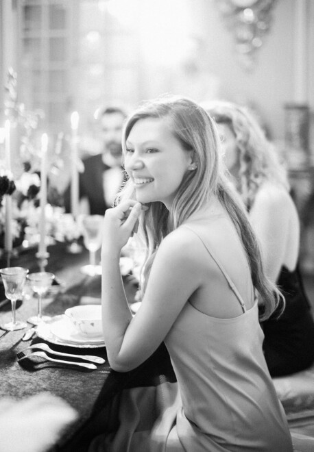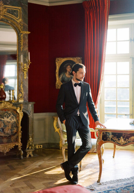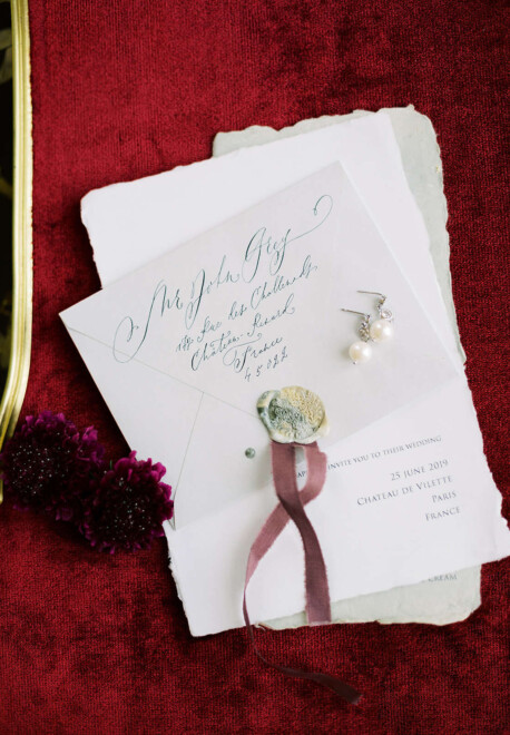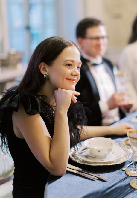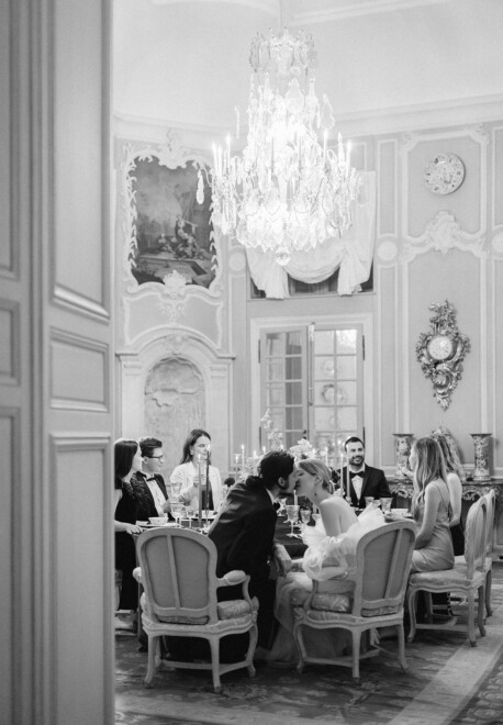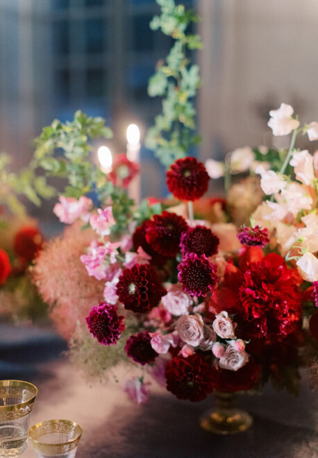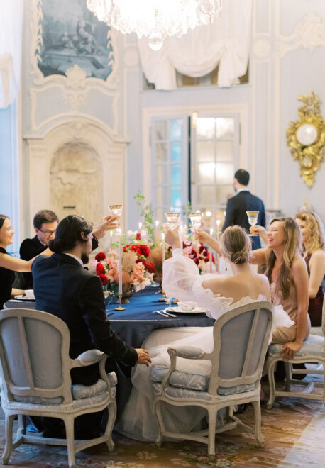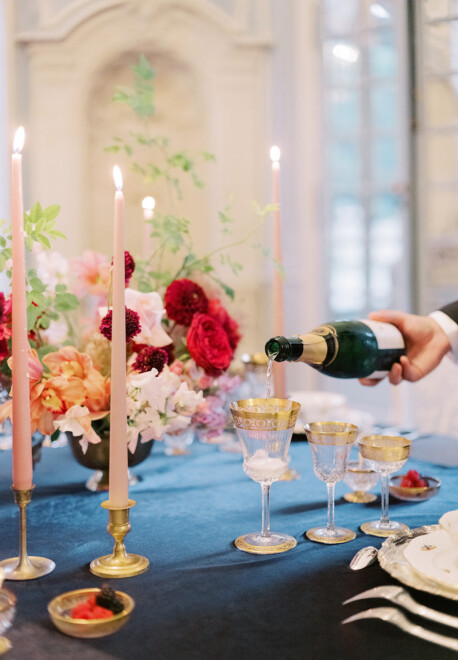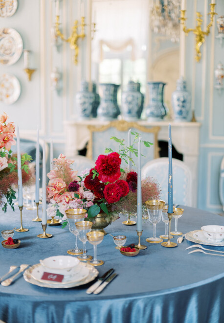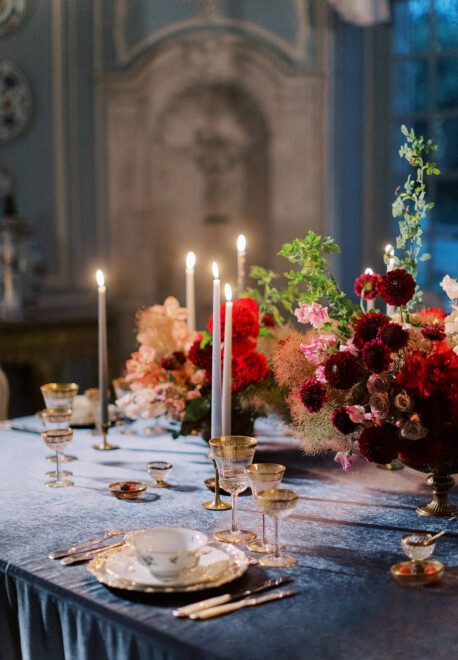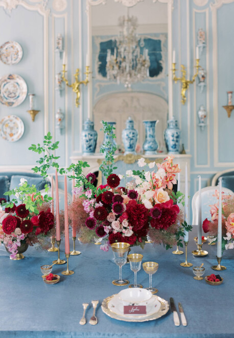 The small gathering relocated to the chateau’s blue ballroom for an Italian-inspired dinner. We embraced the chateau’s ambiance, adorning tables with light blue velvet cloths contrasting with bold burgundy flowers, hints of pink, and caramel accents. Tall taper candles and antique gold dinnerware elevated the atmosphere. While the couple favored Italian cuisine, they opted for an all-French wine selection for the evening.