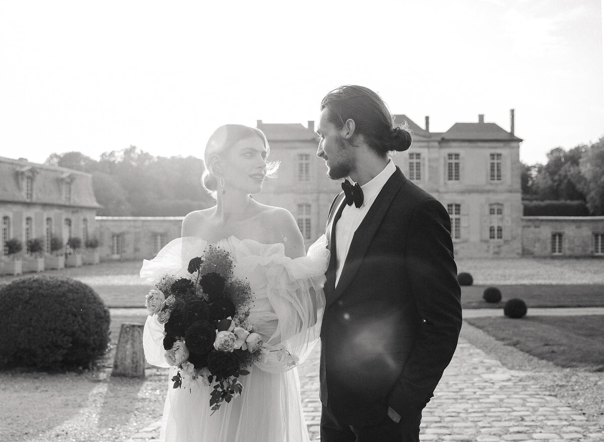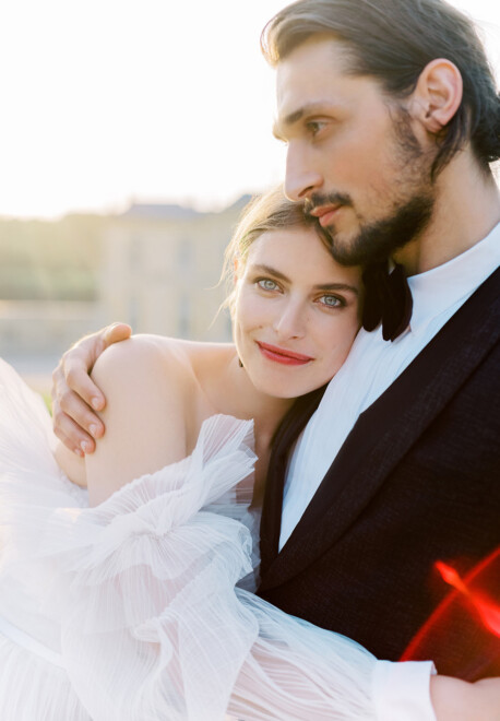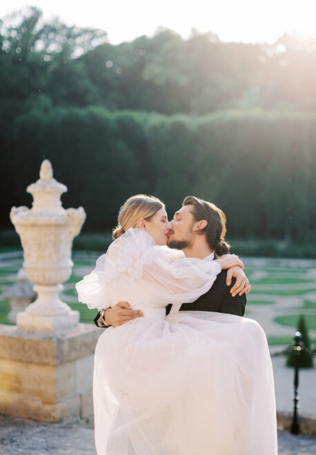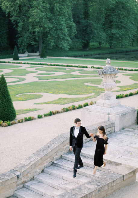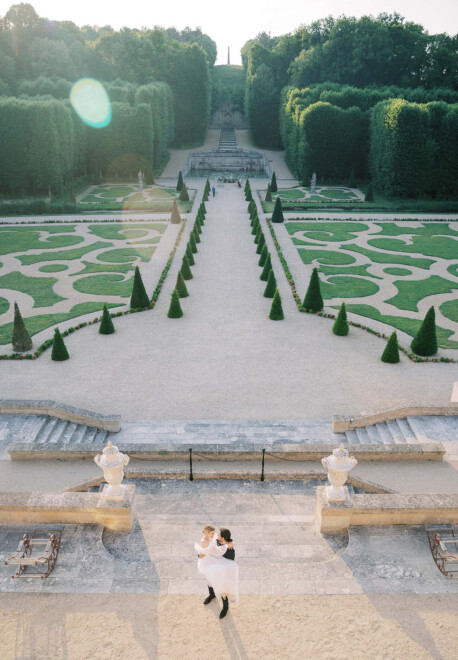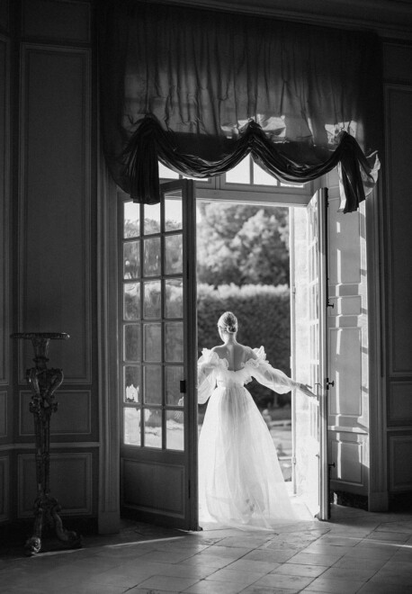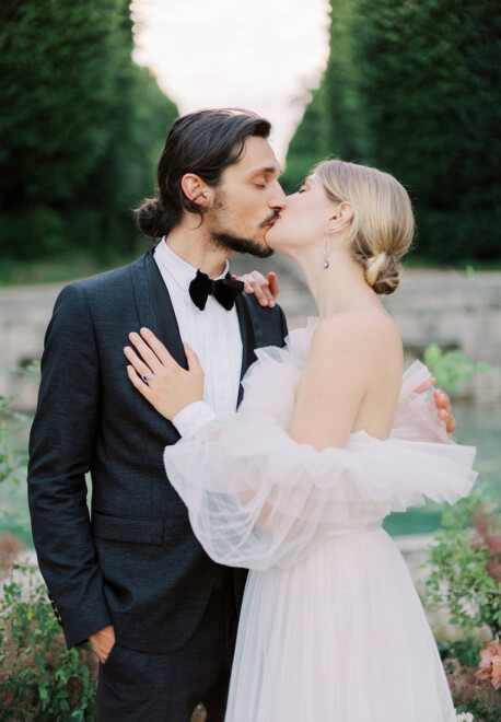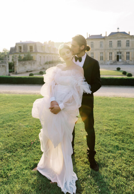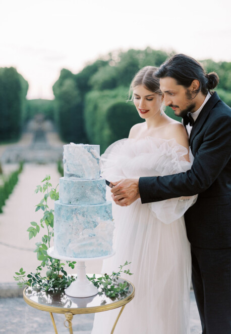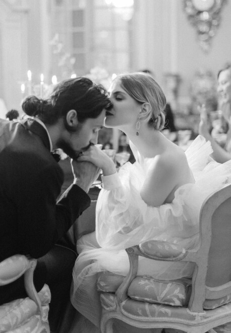 The Paris-based couple’s dream of an intimate, romantic, and aesthetic wedding came true. They invited only six guests to celebrate their love in a ceremony held at Chateau de Villette, a location featured in The Da Vinci Code. Surrounded by flowers, they exchanged vows in the gardens, enjoyed a powder blue cake, and had a dinner in a beautifully decorated ballroom. For Mègane and Bernardo, it was a real and special moment, unlike any film they had worked on.