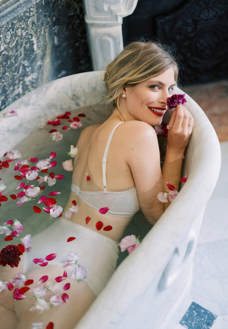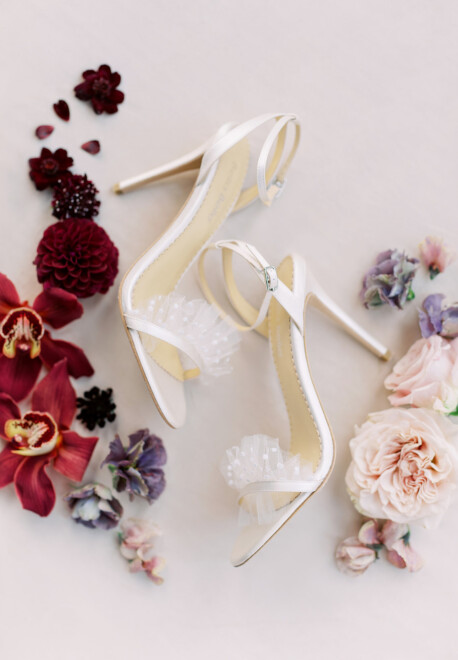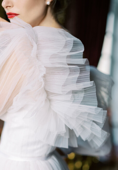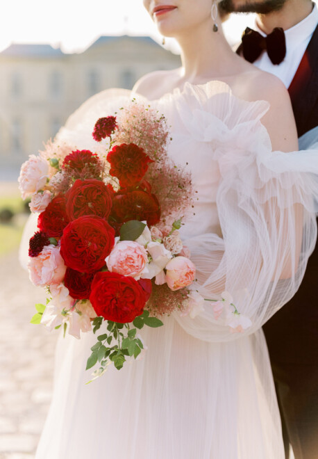 An admirer of lingerie, Mègane wore a 1950s-style Rara Avis tulle-plisse robe and lingerie set as she got ready. Romantic doesn’t even begin to describe Mègane’s tulle-plisse gown by Alon Livne. The dress features ruffled details, oversized sleeves with button cuffs, and lots of flowing fabric. “The dress captured my heart,” Mègane says. She paired it with ruffled shoes Bella Belle and family jewelry. Mègane describes her garden rose and peony bouquet as “rich and noble.”