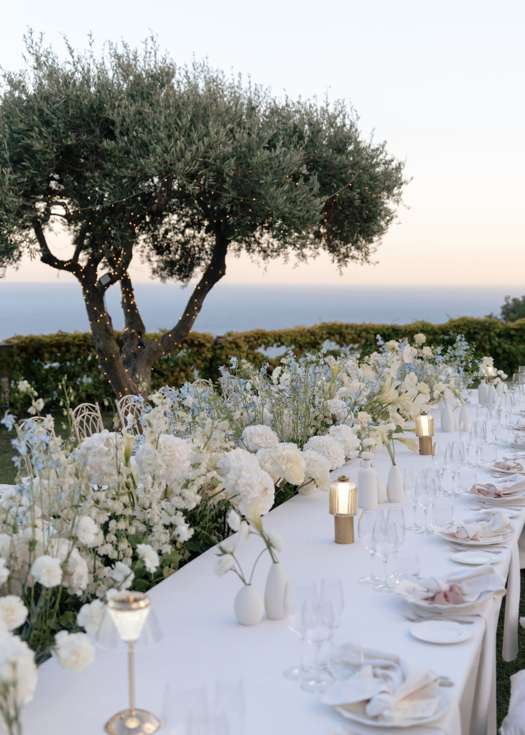 An Amalfi Coast wedding at Villa Cimbrone, beginning with a lemon-inspired welcome that reflected the region’s golden charm. The bride wore a Justin Alexander gown for the ceremony on the villa’s famed Terrace of Infinity, surrounded by white florals and sweeping sea views. The celebration ended with an elegant dinner overlooking the Mediterranean and a traditional millefoglie cake layered with cream and berries.